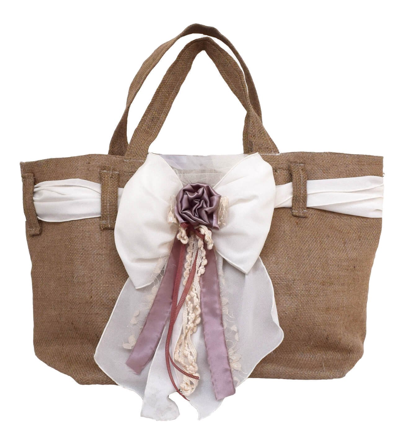 Υφασμάτινη τσάντα βάπτισης από καφέ λινάτσα, εκρού ύφασμα-φιόγκος, χειροποίητο μωβ σατέν λουλούδι και κορδέλες. Ελληνικής κατασκευής. Με αρκετό χώρο ώστε να χωράει τα ολοκληρωμένα βαπτιστικά πακέτα. Χρησιμοποιείται αργότερα για κουτί παιχνιδιών ή αποθηκευτικό χώρο.