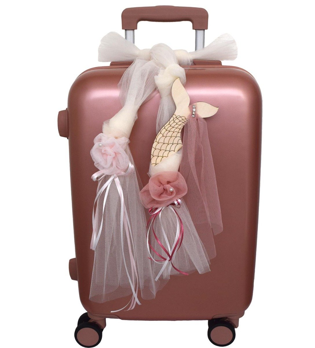 Βαλίτσα βάπτισης ταξιδιού σε σάπιο μήλο χρώμα και διακοσμημένη από ξύλινη ουρά γοργόνας και χειροποίητα λουλούδια. Με διαστάσεις 55x40x20 ώστε να χωράει τα ολοκληρωμένα βαπτιστικά πακέτα. Χρησιμοποιείται αργότερα ως ταξιδιωτική βαλίτσα.