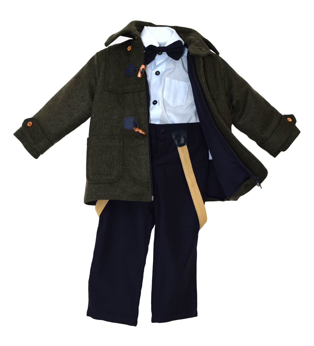 Βαπτιστικά ρούχα, μοντγκόμερι σε πράσινη απόχρωση με μπλε δερμάτινα κουμπώματα και ξύλινα κουμπιά, ελληνικής ραφής, υψηλής ποιότητας. Παράγονται στον επαγγελματικό μας χώρο κατά παραγγελία στα μέτρα του παιδιού. Βαπτιστικό ρούχο με κυπαρρισί μοντγκόμερι με μπλε λεπτομέρειες, σιέλ πουκάμισο, μπλε παπιόν, μπλε παντελόνι και τιράντες.