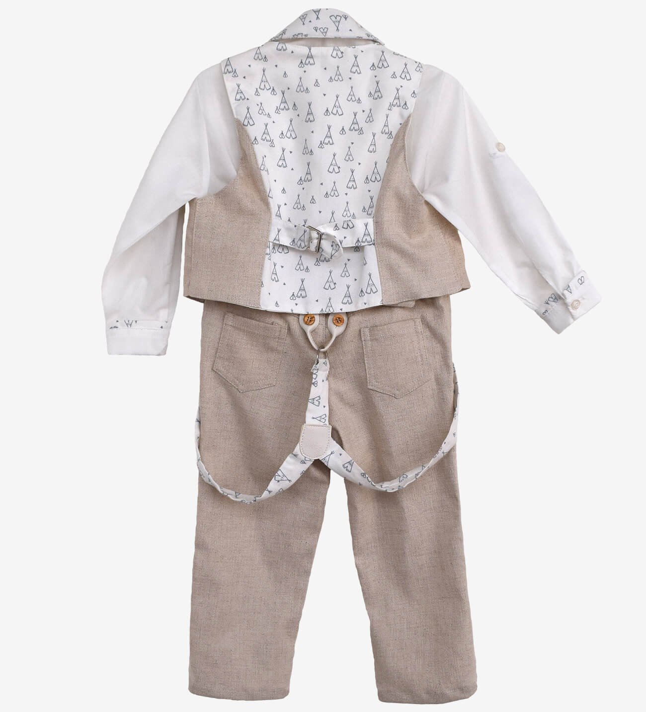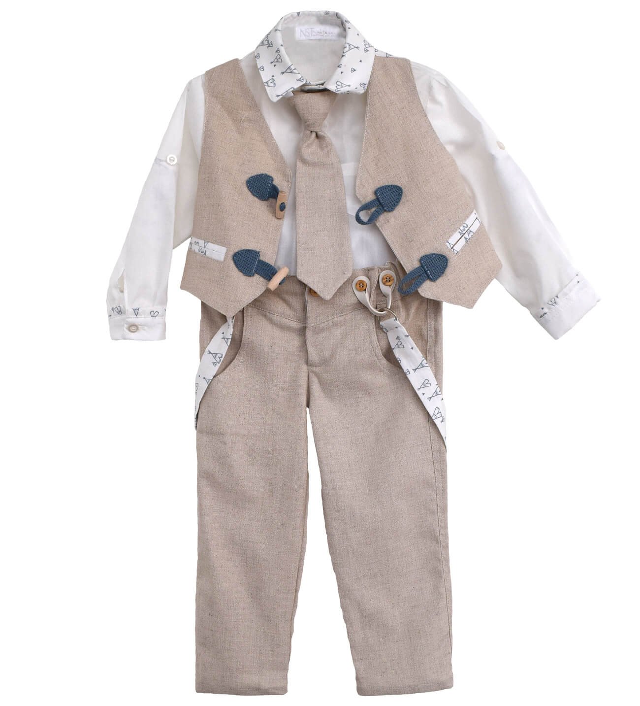 Βαπτιστικό ρούχο με πουκάμισο εκρού βαμβακερό, μπεζ γιλέκο από λινό με λεπτομέρειες από ύφασμα με σχέδιο σκηνή, πλεκτά μοτγκόμερυ μπλε κουμπώματα, μπεζ γραβάτα λινή, μπεζ λινό παντελόνι κλασικό και τιράντες από ύφασμα με σχέδιο σκηνή. Βαπτιστικά ρούχα, ελληνικής ραφής, υψηλής ποιότητας. Παράγονται στον επαγγελματικό μας χώρο κατά παραγγελία στα μέτρα του παιδιού.