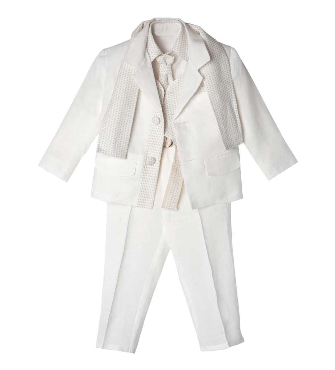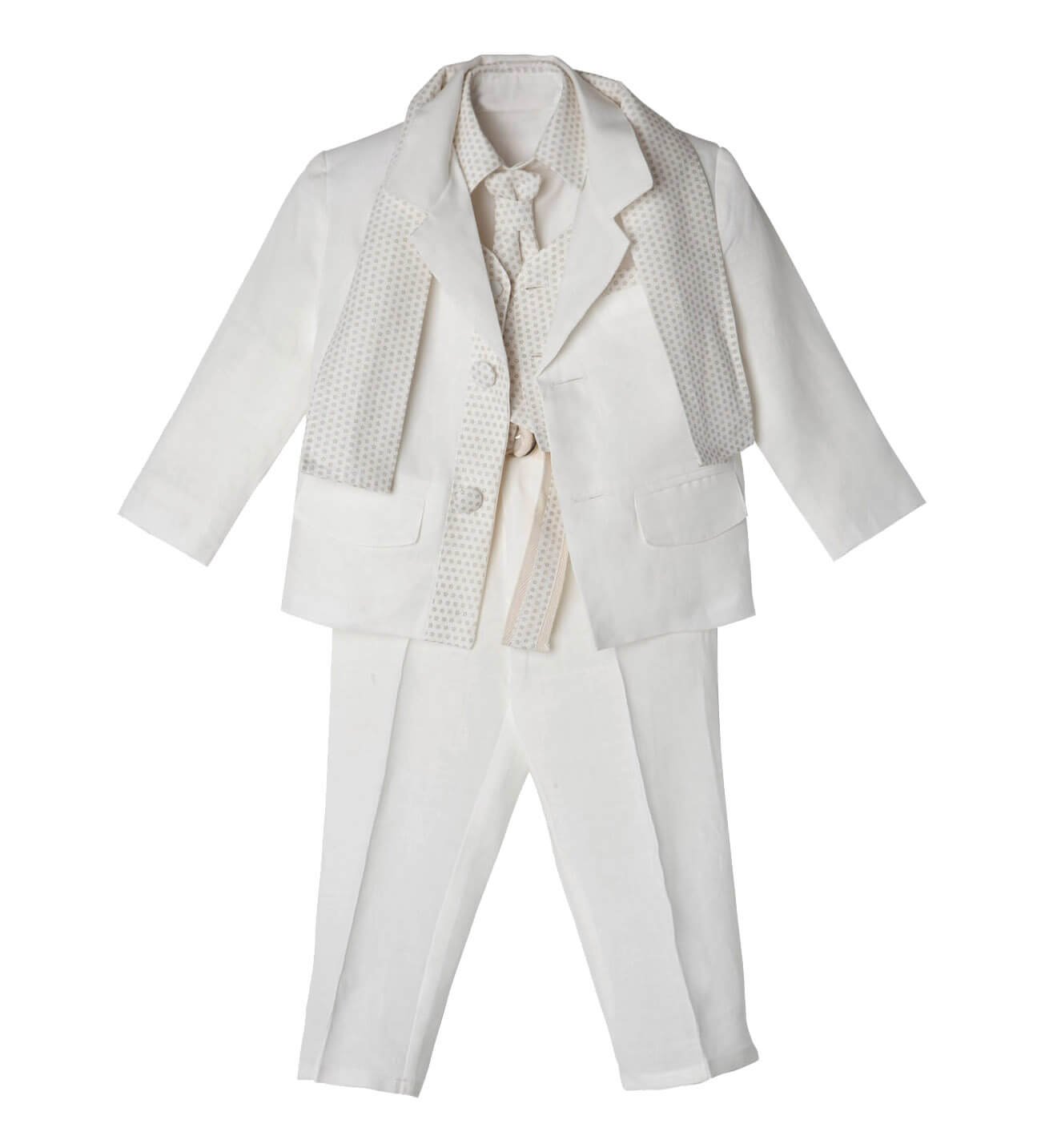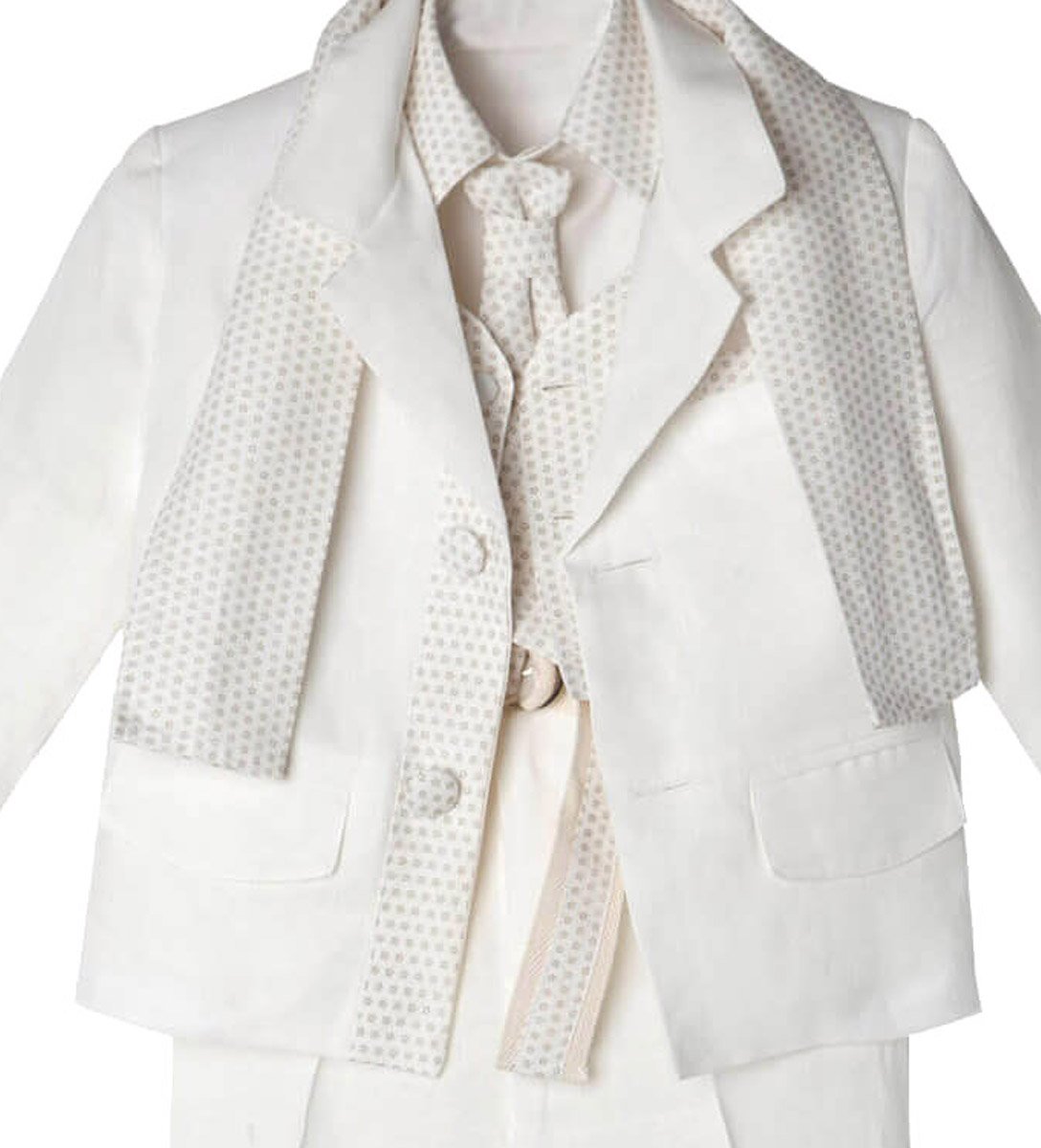 Βαπτιστικά ρούχα, ελληνικής ραφής, υψηλής ποιότητας. Παράγονται στον επαγγελματικό μας χώρο κατά παραγγελία στα μέτρα του παιδιού. Βαπτιστικό ρούχο λινό εκρού με σακάκι, γιλέκο, πουκάμισο, γραβάτα, ζώνη και φουλάρι.