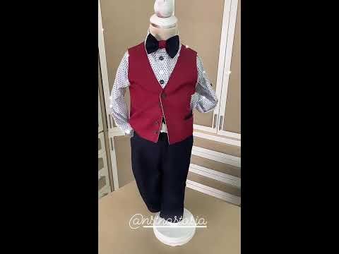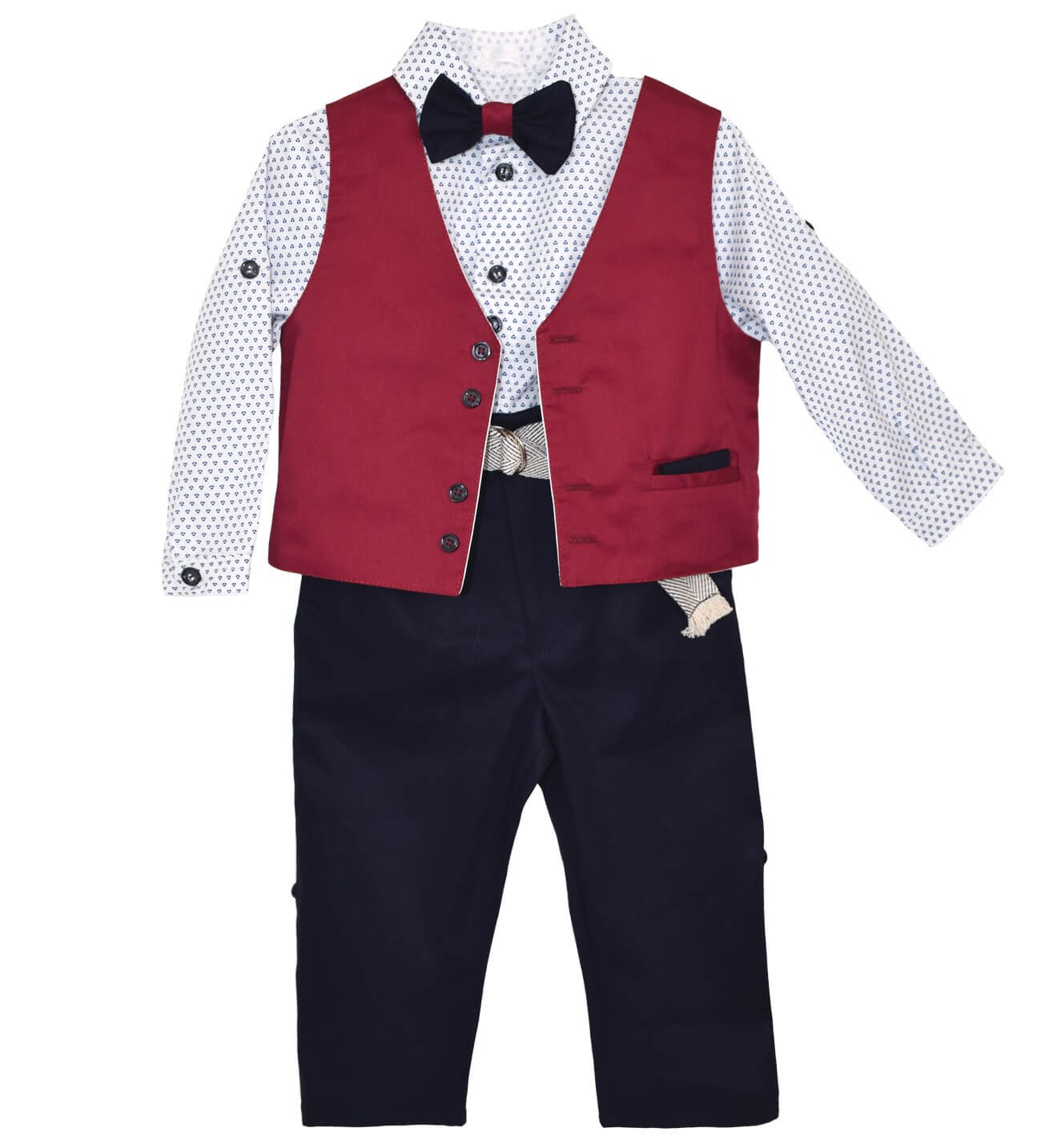 Βαπτιστικά ρούχα, ελληνικής ραφής, υψηλής ποιότητας. Παράγονται στον επαγγελματικό μας χώρο κατά παραγγελία στα μέτρα του παιδιού. Βαπτιστικό ρούχο από βαμβακερό λευκό με μπλε πουά πουκάμισο, γιλέκο από μπορντώ βαμβακερή καπαρτίνα με μπλε κουμπιά, μπλε παπιόν, χαμηλοκάβαλο παντελόνι από μπλε βαμβακερή καπαρτίνα και υφασμάτινη ζώνη.