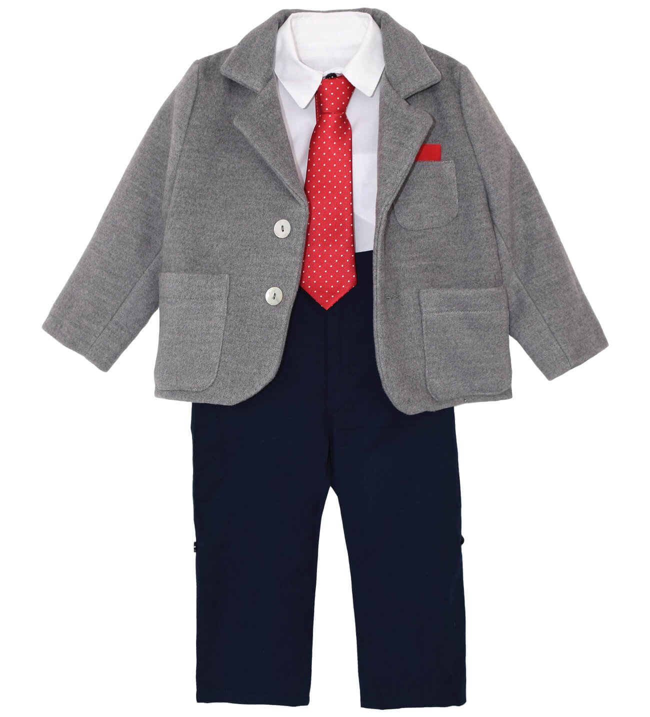 Βαπτιστικό ρούχο από μάλλινο γκρι σακάκι, με εκρού πουκάμισο βαμβακερό, κόκκινη πουά γραβάτα και μπλε παντελόνι από καπαρτίνα. Βαπτιστικά ρούχα, ελληνικής ραφής, υψηλής ποιότητας. Παράγονται στον επαγγελματικό μας χώρο κατά παραγγελία στα μέτρα του παιδιού.