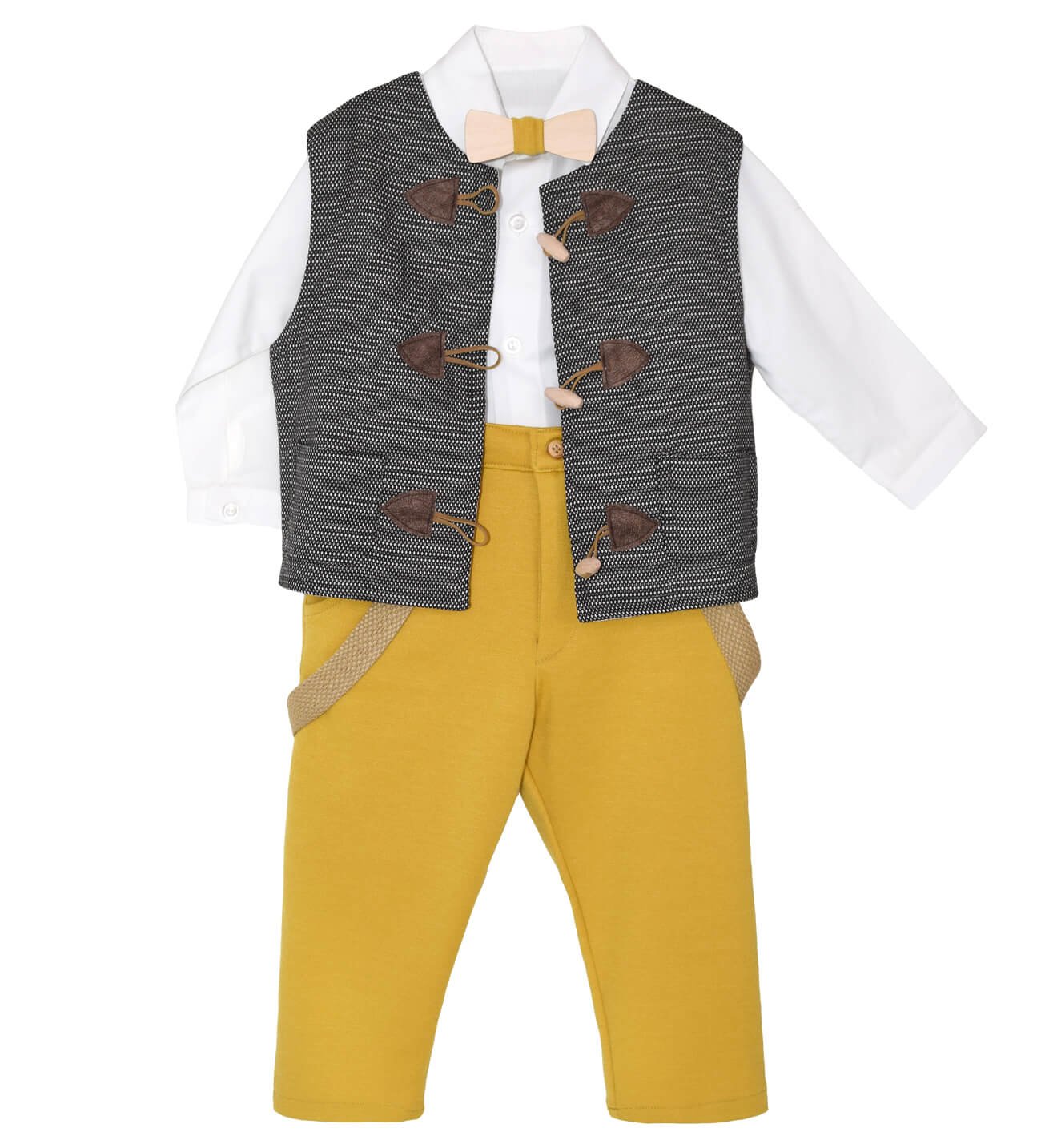 Βαπτιστικό ρούχο με εκρού πουκάμισο βαμβακερό, γκρι γιλέκο με μοντγκόμερυ δερμάτινο κούμπωμα, παντελόνι μουσταρδί, ξύλινο παπιόν και σχοίνινες τιράντες. Βαπτιστικά ρούχα, ελληνικής ραφής, υψηλής ποιότητας. Παράγονται στον επαγγελματικό μας χώρο κατά παραγγελία στα μέτρα του παιδιού.