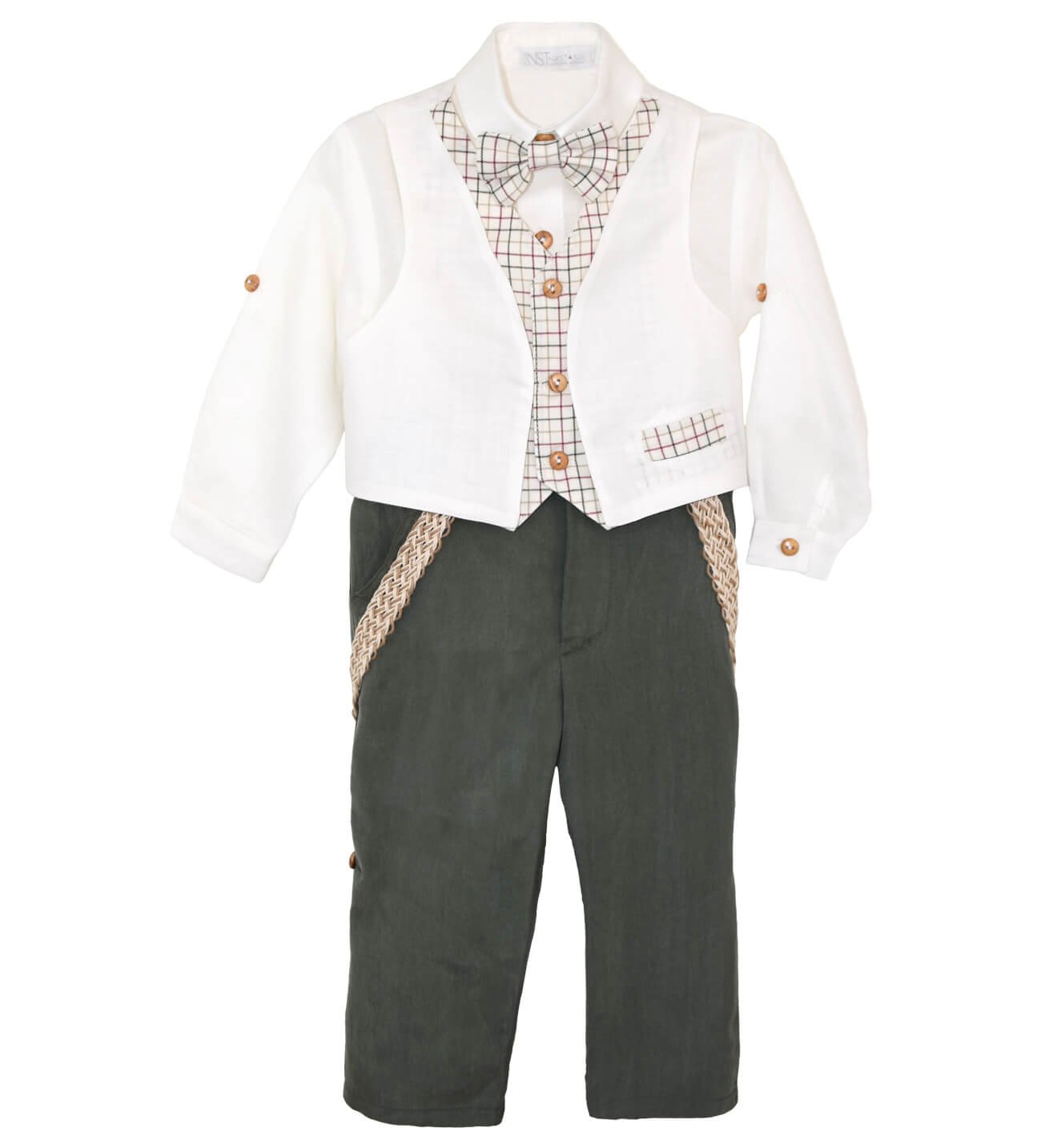 Βαπτιστικά ρούχα, ελληνικής ραφής, υψηλής ποιότητας. Παράγονται στον επαγγελματικό μας χώρο κατά παραγγελία στα μέτρα του παιδιού. Βαπτιστικό ρούχο με πουκάμισο κλασικό λινό με ξύλινα κουμπιά, γιλέκο διπλό λινό εκρού και καρό βαμβακερό, παντελόνι κλασικό κούπρο λαδί με ξύλινα κουμπιά και τιράντες από κοτσίδα μπεζ-εκρού.