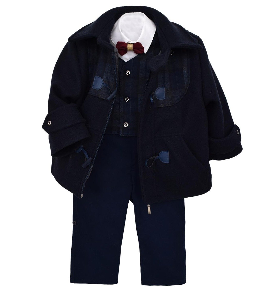Βαπτιστικό ρούχο από βαμβακερό λευκό πουκάμισο με μπορντώ παπιόν, γιλέκο από μπλε καρό μάλλινο ύφασμα, μπλε μοντγκόμερυ με κουκούλα, δερμάτινα κουμπώματα και καρο λεπτομέρειες, παντελόνι από μπλε βαμβακερή καπαρτίνα. Βαπτιστικά ρούχα, ελληνικής ραφής, υψηλής ποιότητας. Παράγονται στον επαγγελματικό μας χώρο κατά παραγγελία στα μέτρα του παιδιού.