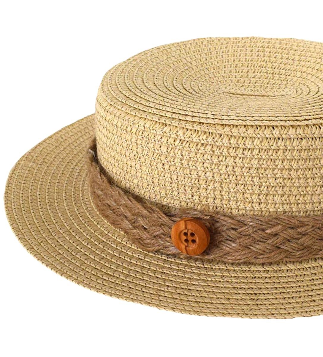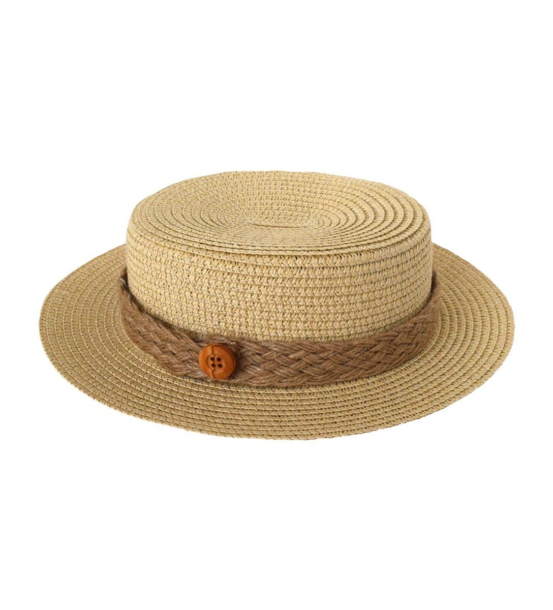 Ψάθινο καπέλο βάπτισης στρογγυλό, από ψάθα διακοσμημένο με σχοινί και κουμπι σε καφέ χρώμα, ελληνικής παραγωγής.