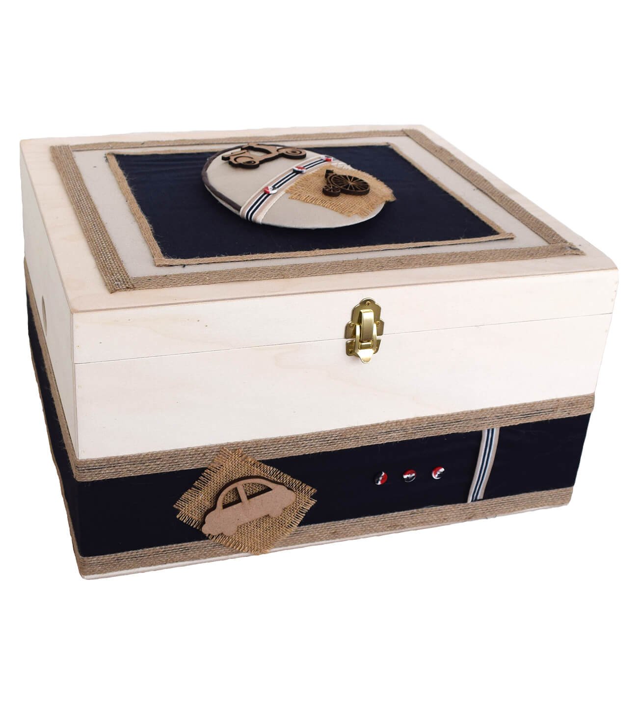 Ξύλινο κουτί βάπτισης σε εκρού χρώμα, διακοσμημένο με μπλε ύφασμα, λινατσένιες λεπτομέρειες, ξυλινη βέσπα και ξύλινο αυτοκίνητο, ελληνικής κατασκευής. Με διαστάσεις 46x34x32 ώστε να χωράει τα ολοκληρωμένα βαπτιστικά πακέτα. Χρησιμοποιείται αργότερα για κουτί παιχνιδιών ή αποθηκευτικό χώρο.