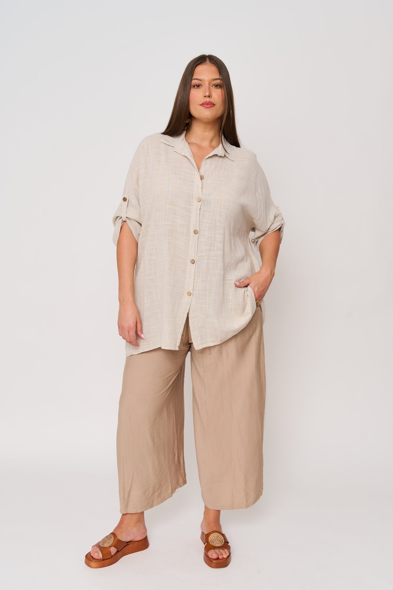 Αέρινη παντελόνα σε ύφασμα που θυμίζει λινό, με απαλή υφή και δροσερή αίσθηση, ιδανική για τους καλοκαιρινούς μήνες. Διαθέτει φαρδιά γραμμή που προσφέρει απόλυτη άνεση και κομψότητα, ενώ οι τσέπες προσθέτουν πρακτικότητα και στιλ. Συνδυάζεται εύκολα με πουκαμίσες ή top για χαλαρές αλλά και προσεγμένες εμφανίσεις. Η Ιβάνα έχει ύψος 180εκ, στήθος 114εκ ,μέση 88εκ και περιφέρεια 121εκ και φοράει 2xl.