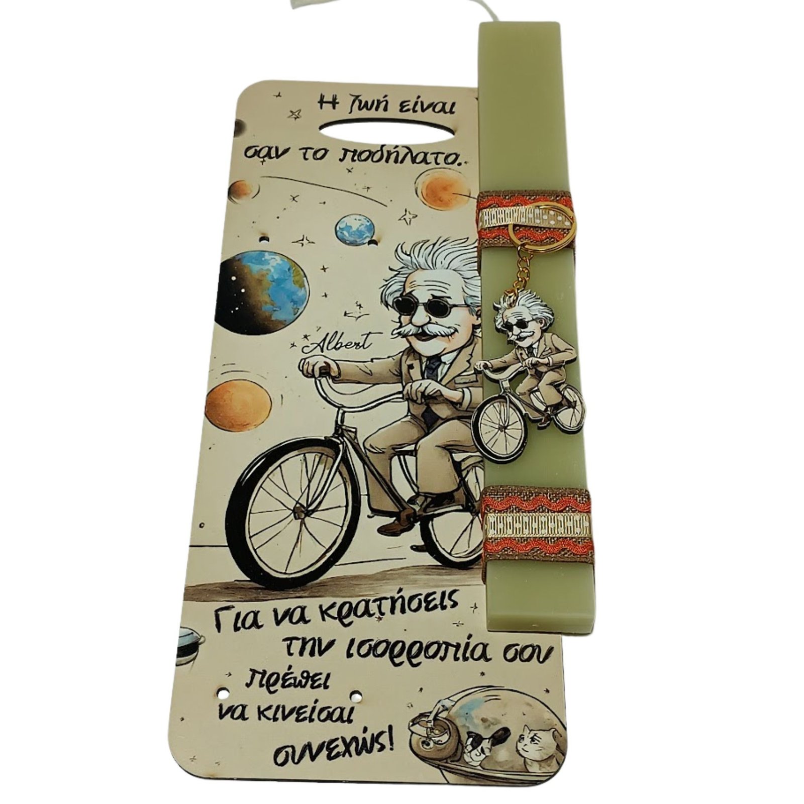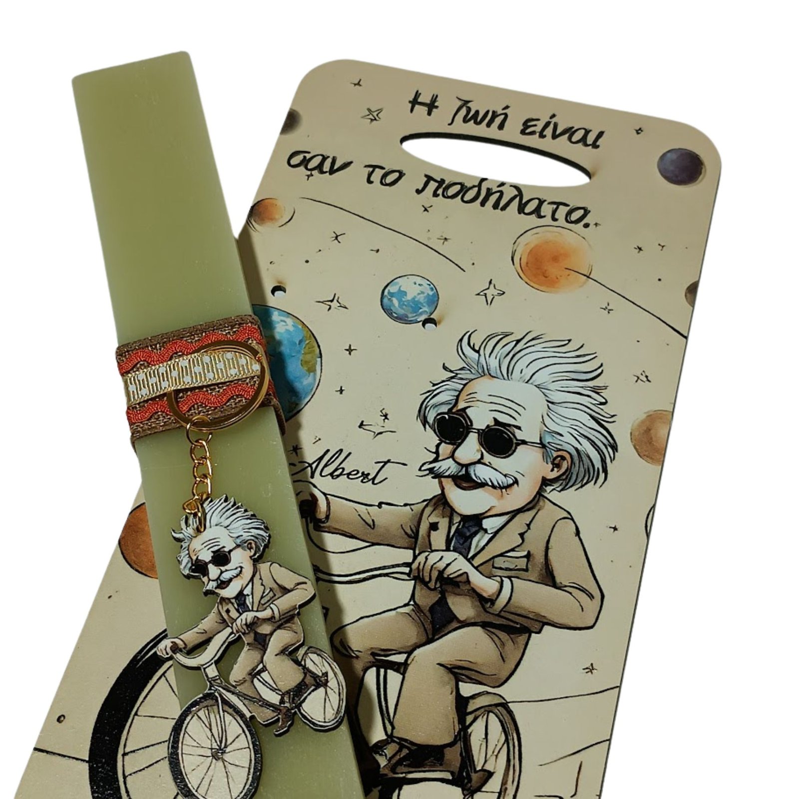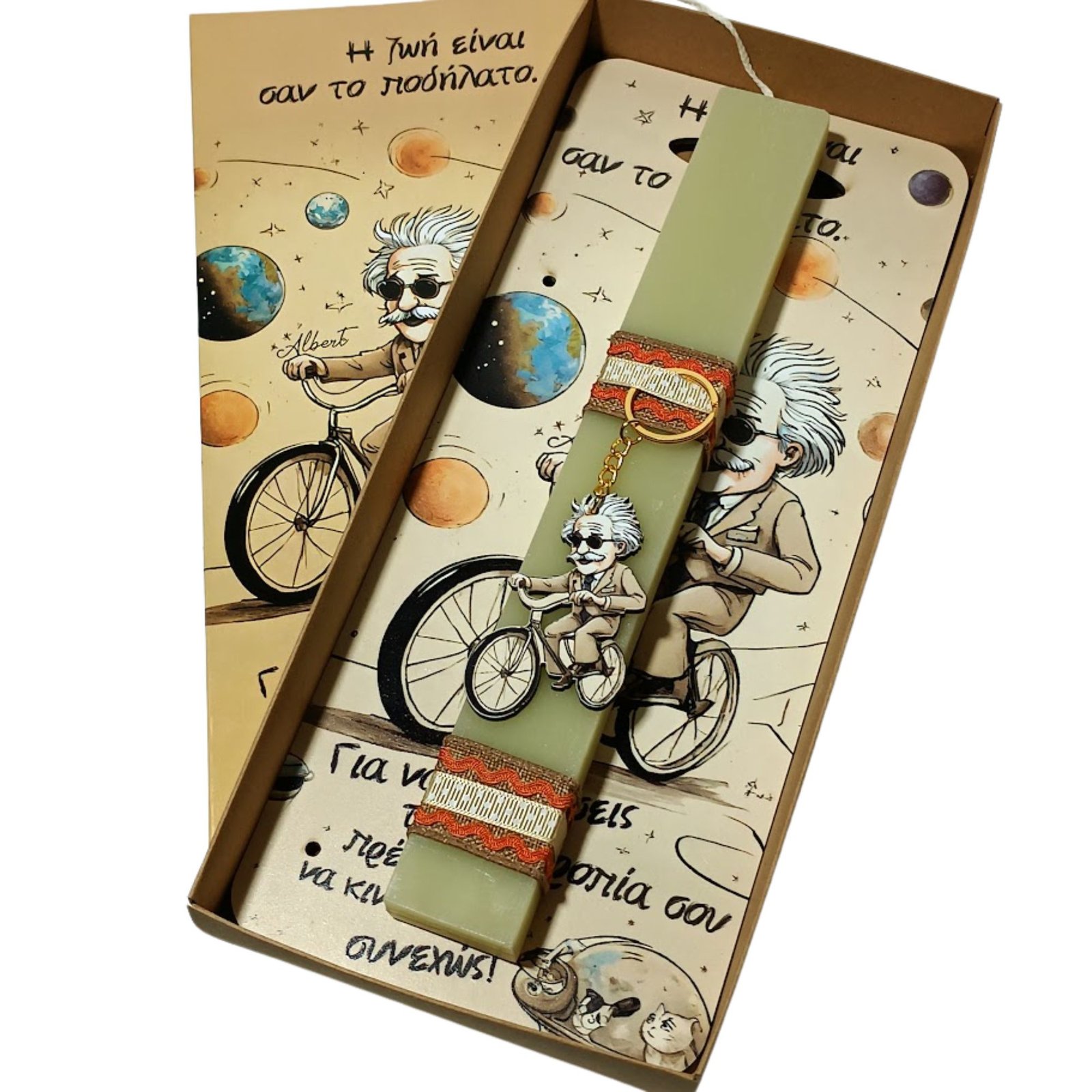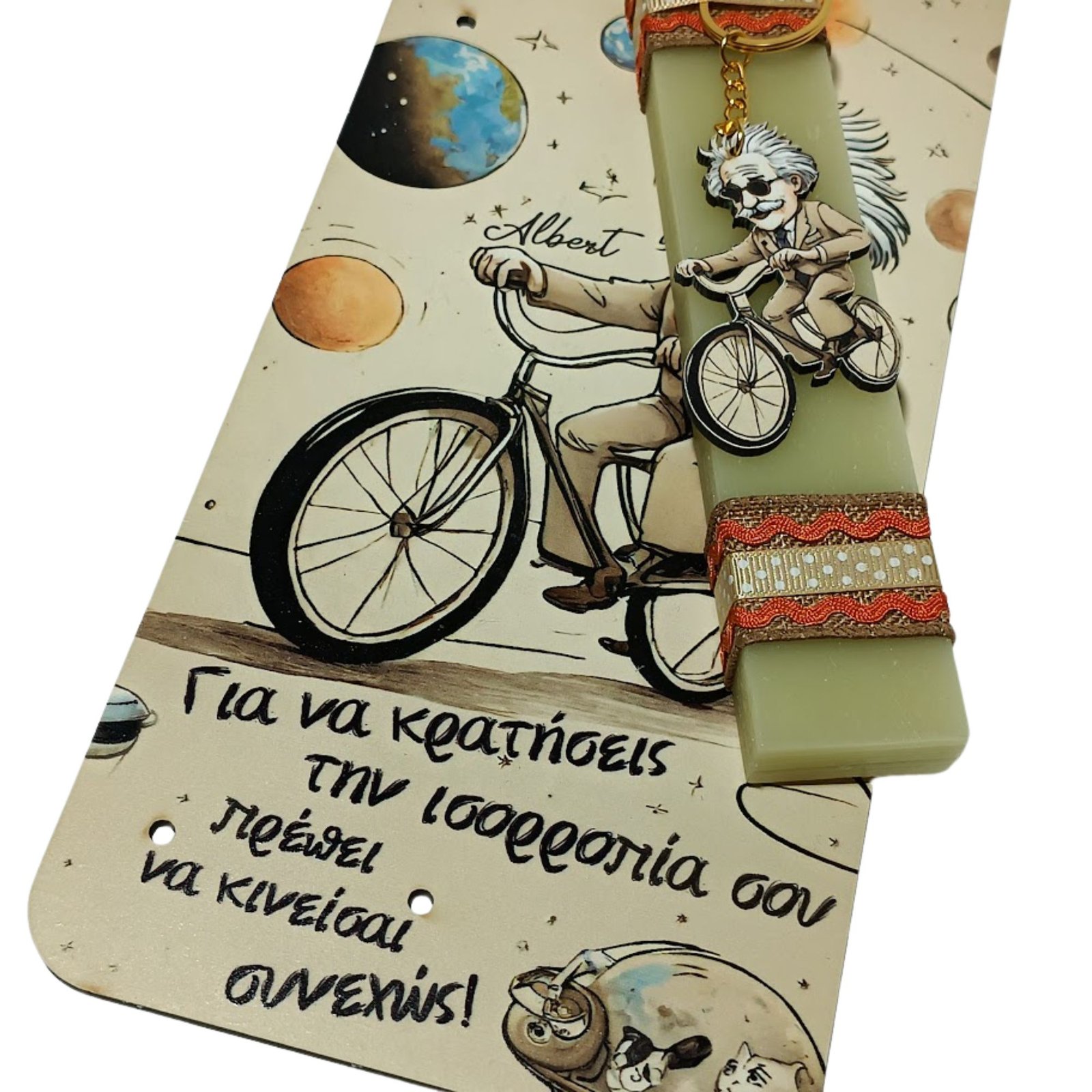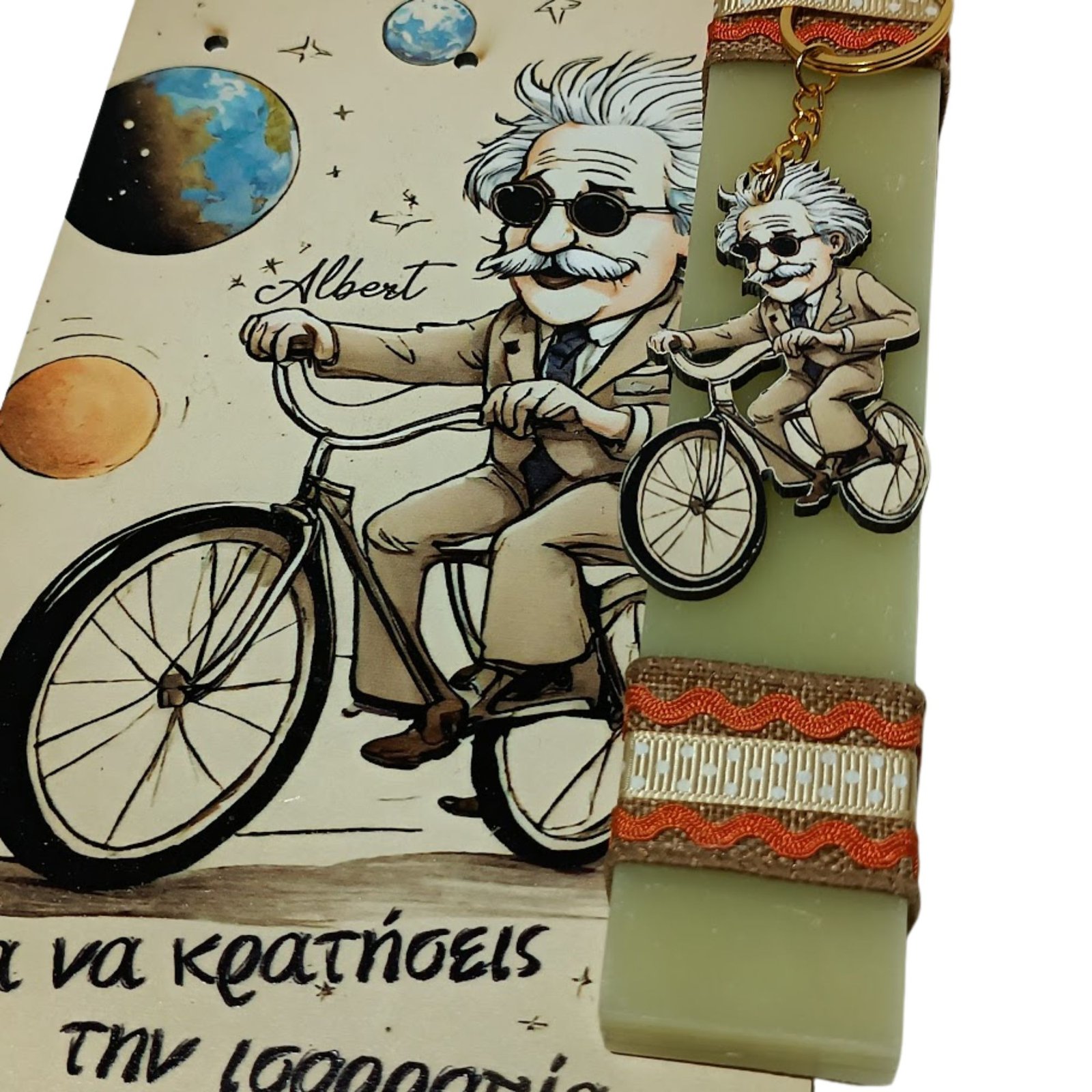 Πασχαλινή λαμπάδα αρωματική με ξύλινο μπρελόκ με τον Αϊνστάιν πάνω σε ποδήλατο, ξύλινη πλάτη και χάρτινο κουτί με το ίδιο σχέδιο.