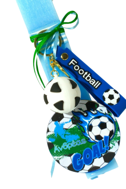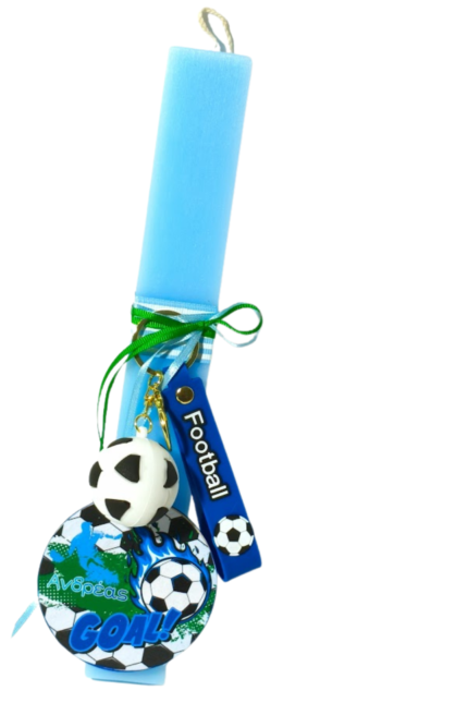Λαμπάδα σε γαλάζιο χρώμα με ξύλινο διακοσμητικό με μαγνητάκι το οποίο αφαιρείται εύκολα από τη λαμπάδα και παραμένει αναμνηστικό δώρο στο παιδί..