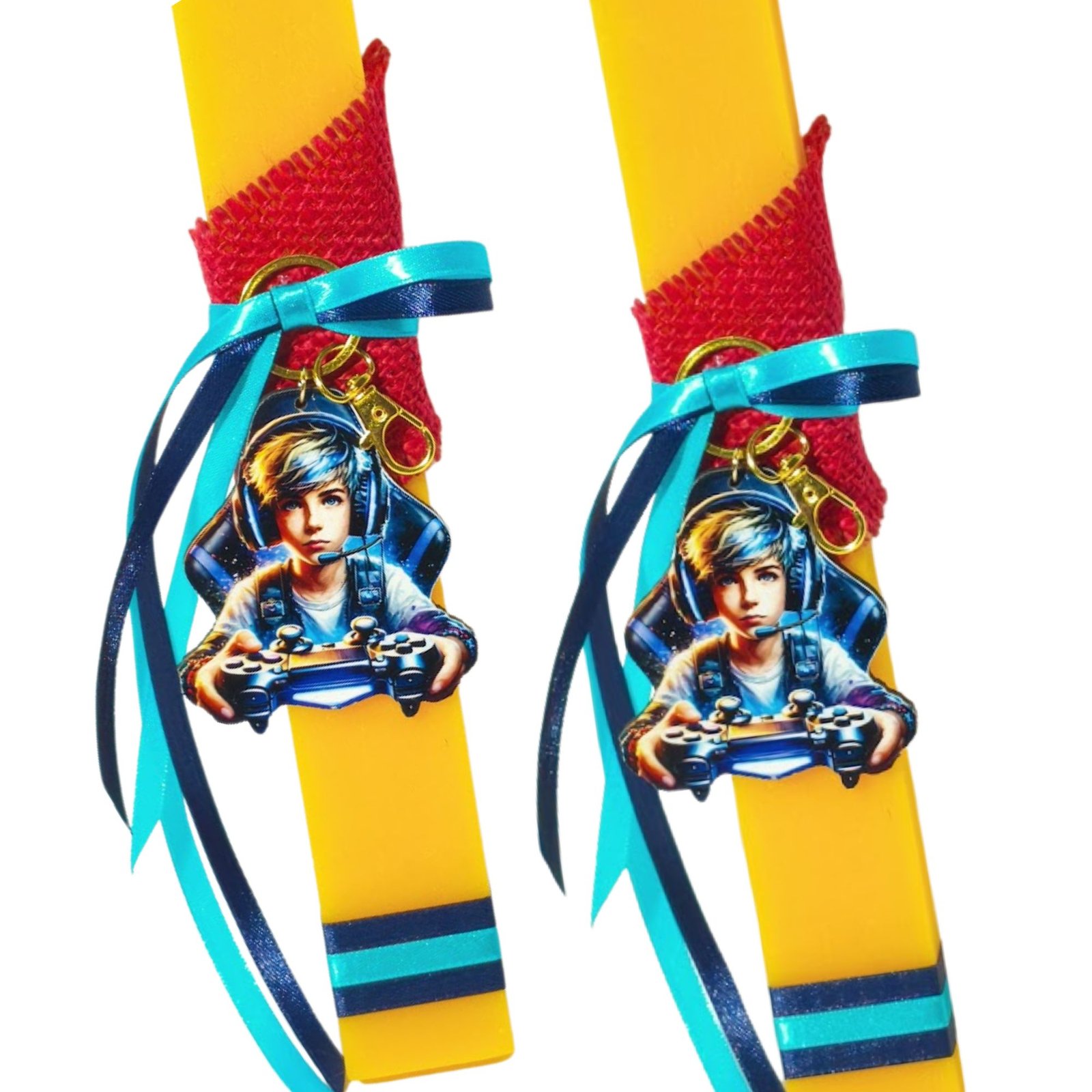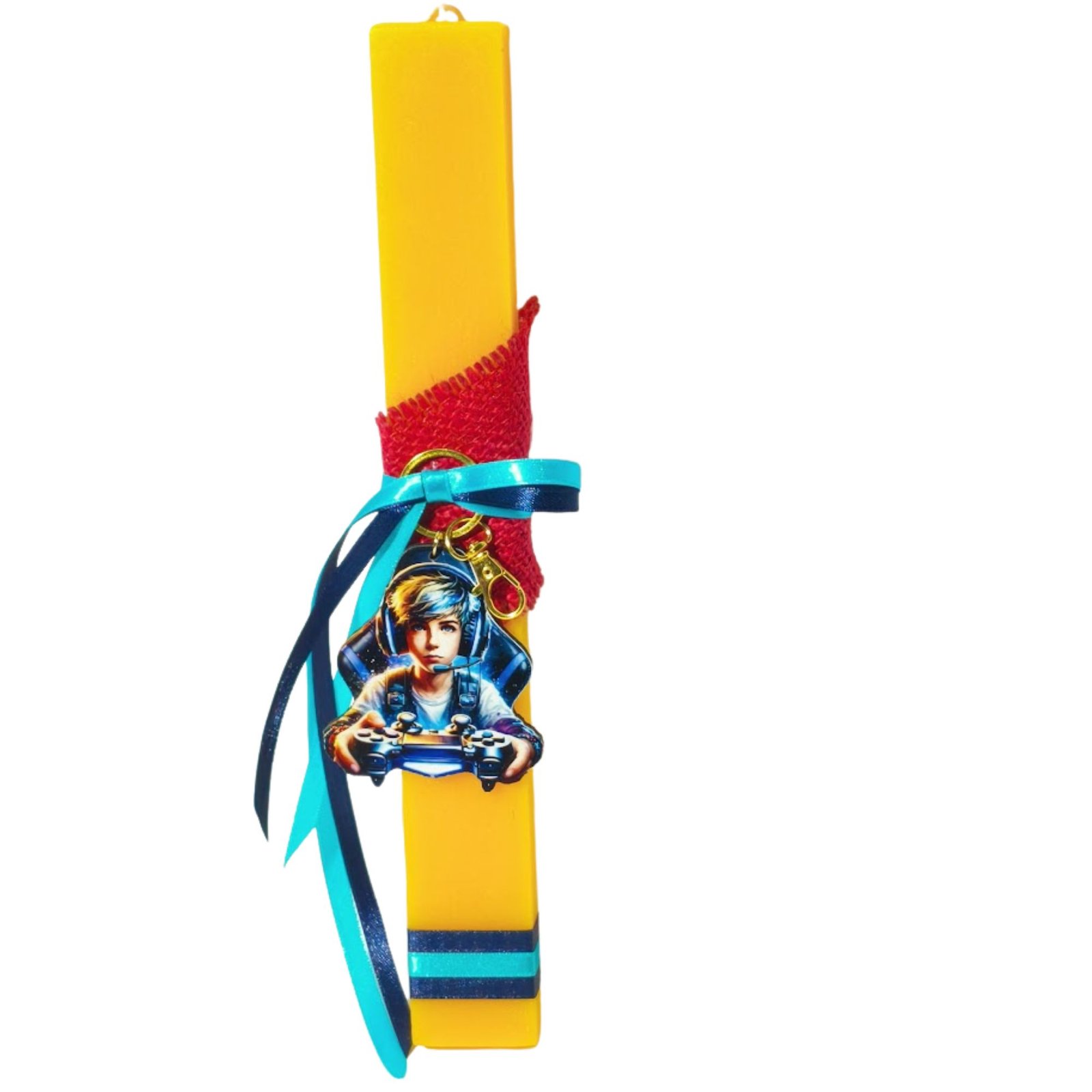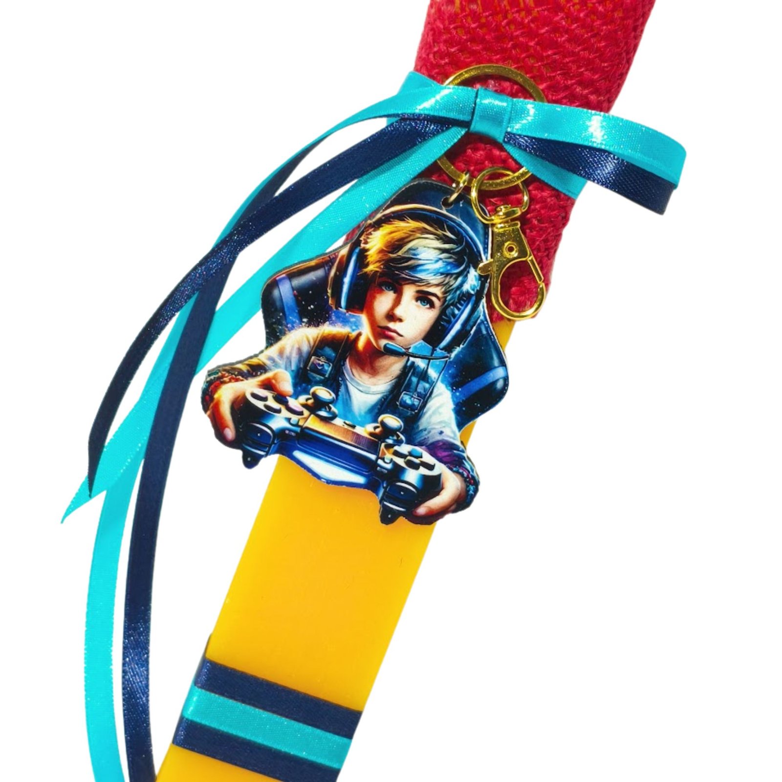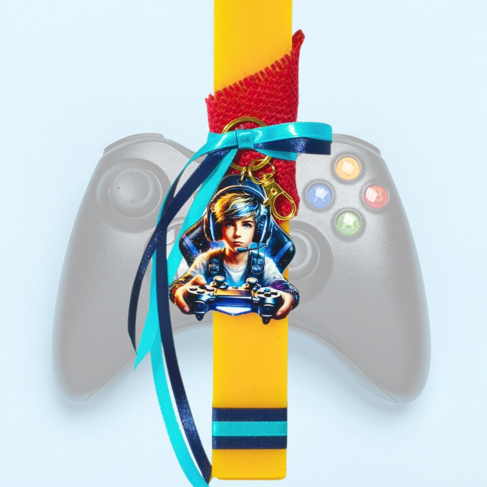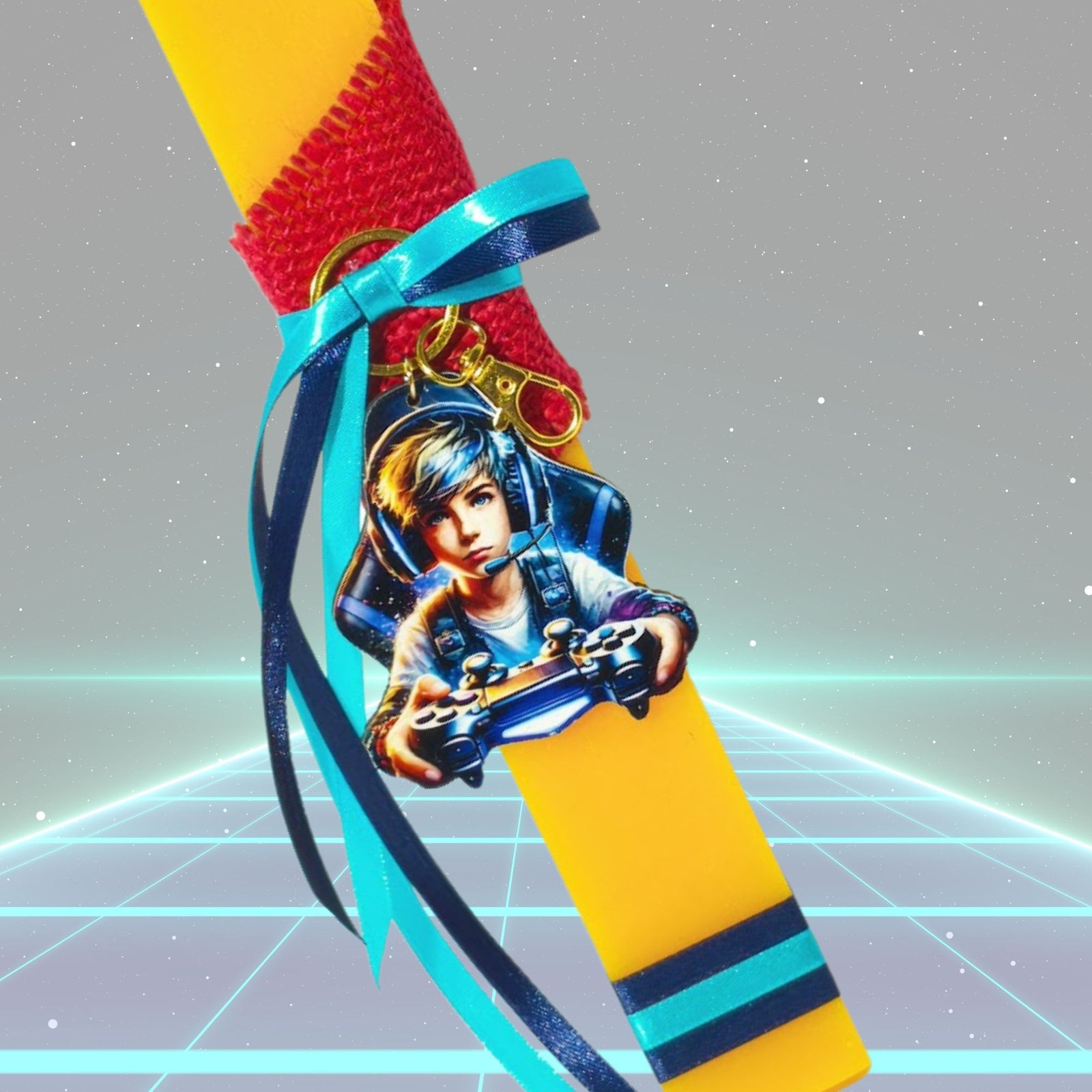 Λαμπάδα στολισμένη διακριτικά, με το μπρελόκ το οποίο απεικονίζει αγόρι που παίζει video game, βγαίνει εύκολα ιδανική για εφήβους που λατρεύουν τα video games!!!