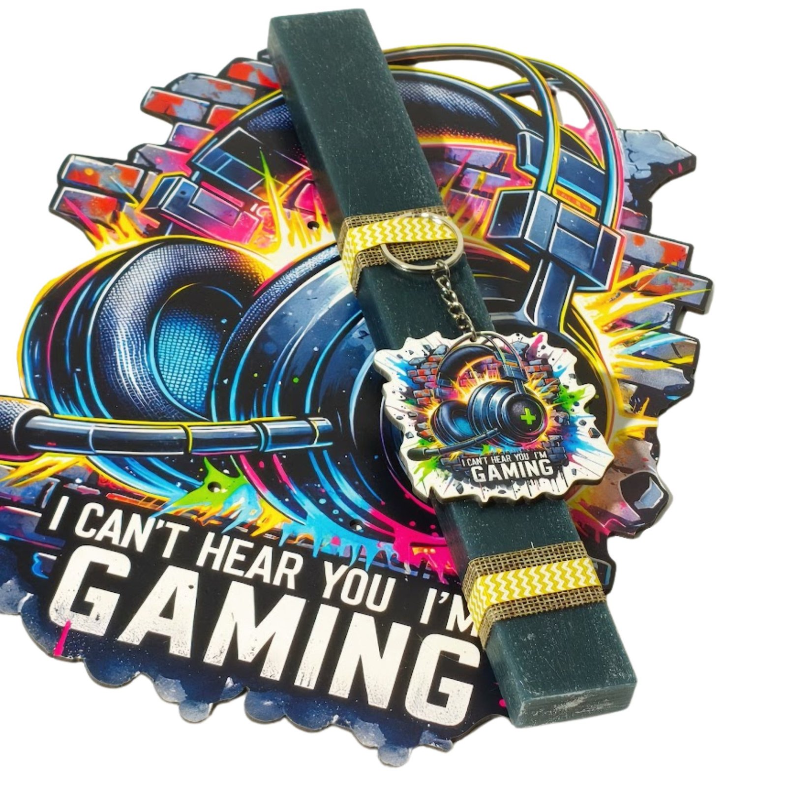 Πασχαλινή λαμπάδα σε σκούρο γκρι- κυπαρισσί χρώμα με ξύλινο μπρελόκ “gaming” και ξύλινη πλάτη με το ίδιο σχέδιο!!