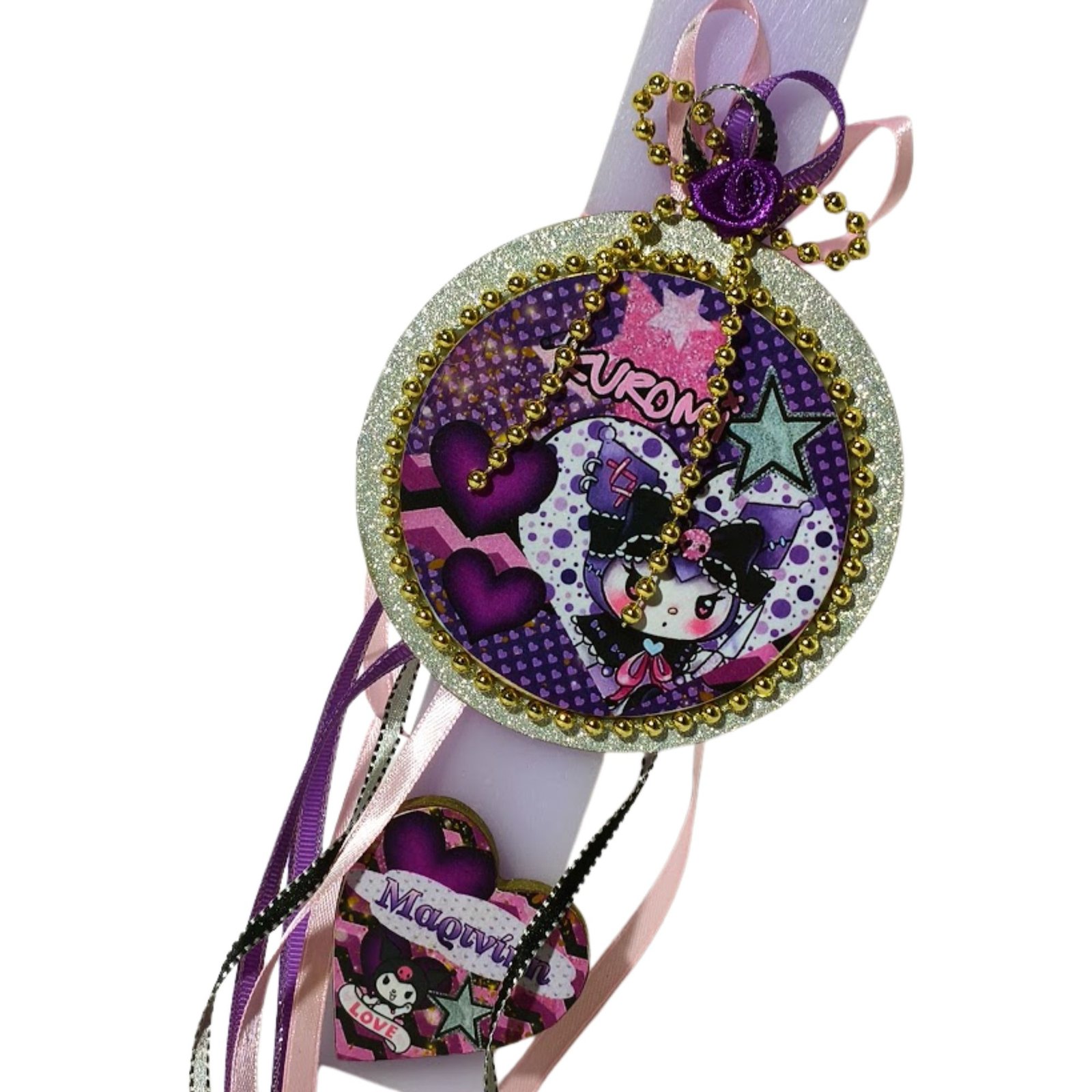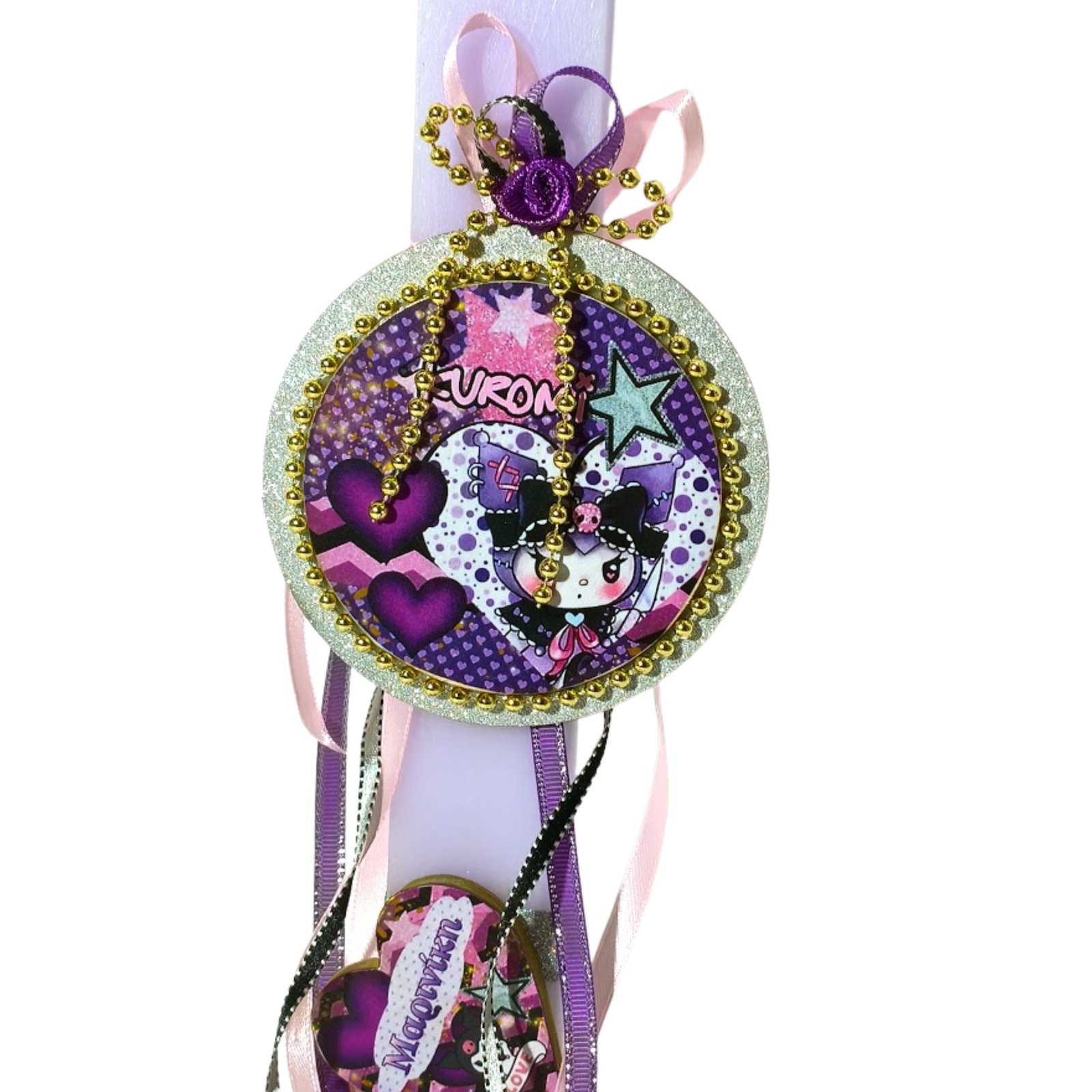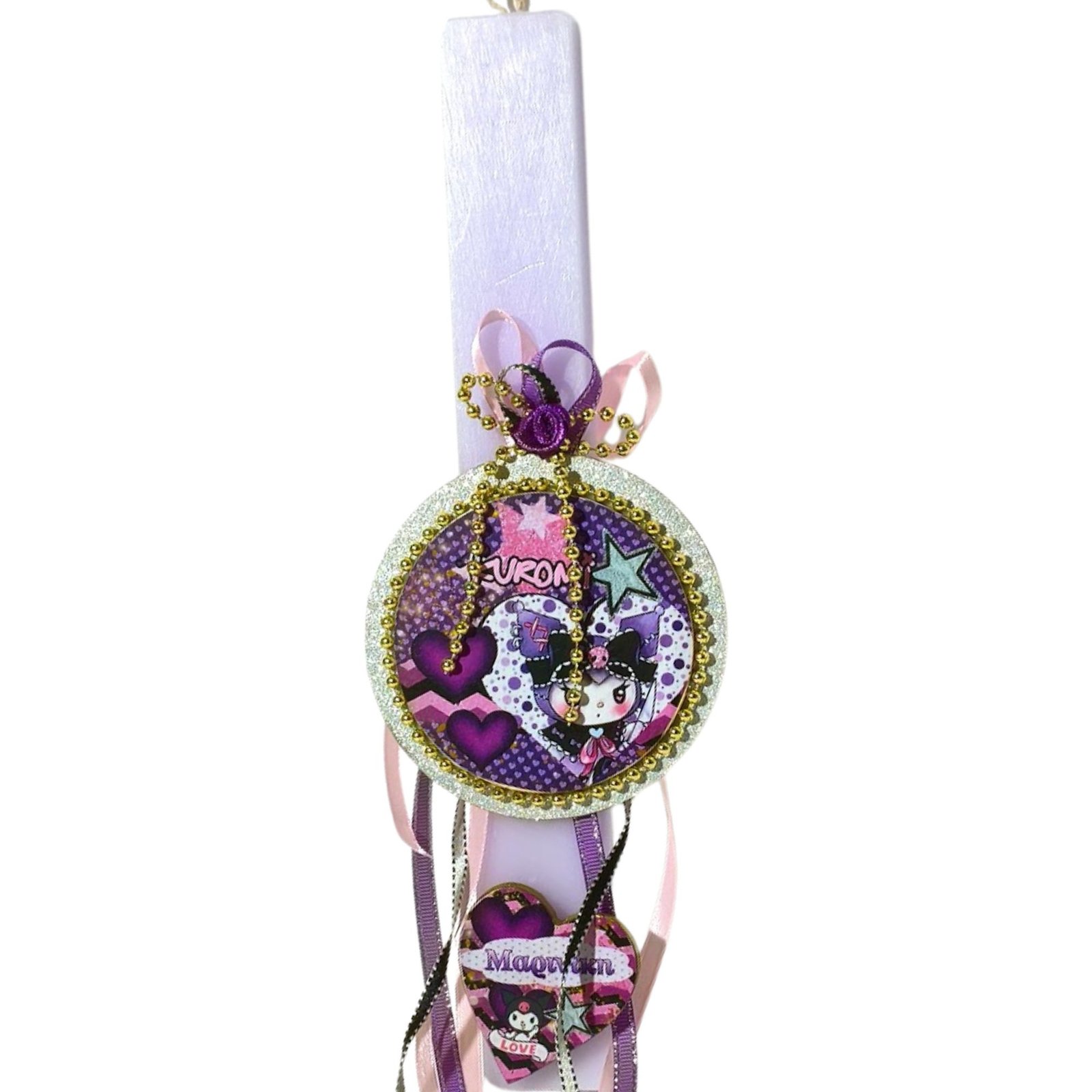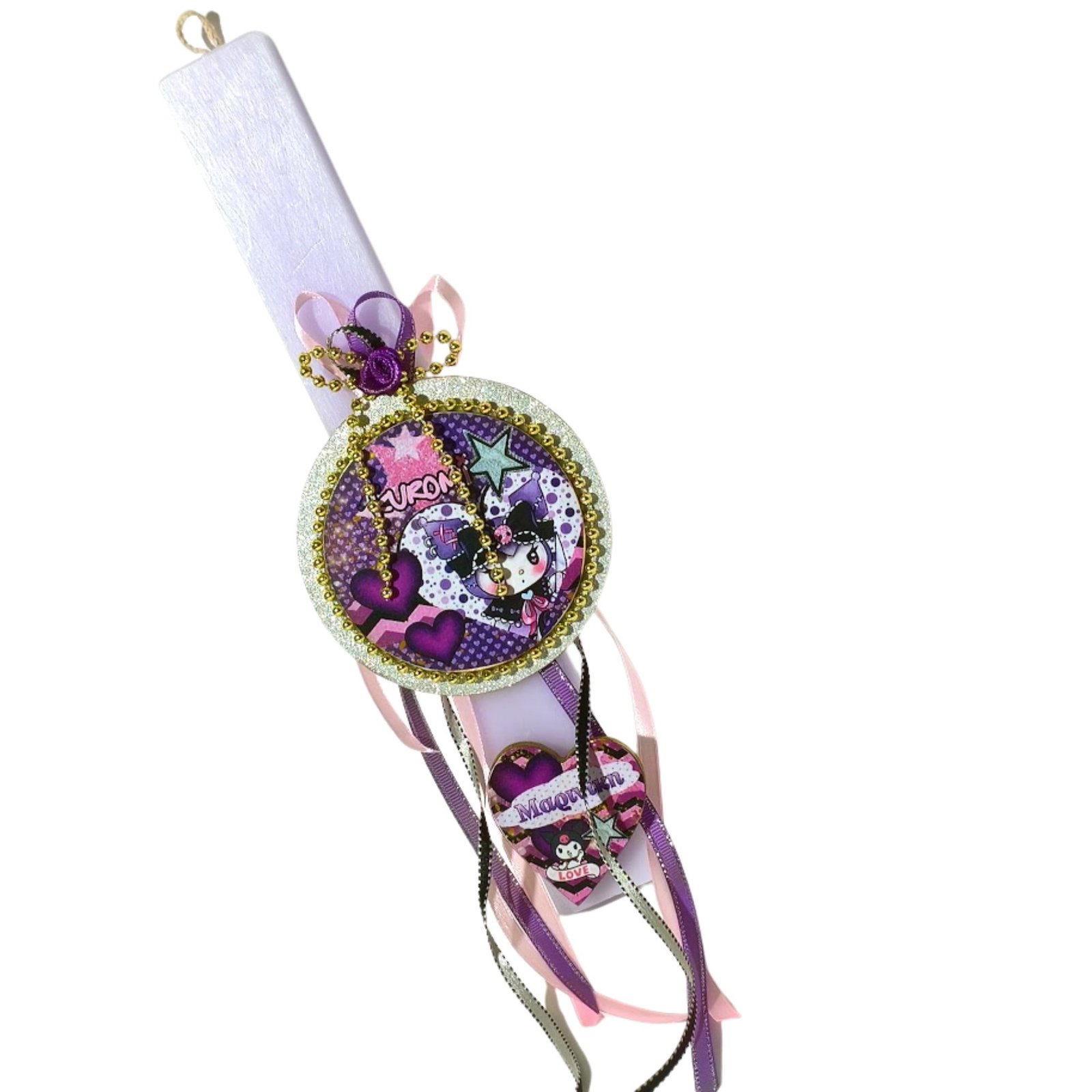Λαμπάδα σε απαλό μοβ χρώμα με στρογγυλό ξύλινο στοιχείο διακοσμημένο με ιδιαίτερο σχέδιο το οποίο έχει τοποθετηθεί με τεχνική ντεκουπάζ και έχει διακοσμηθεί με κορδέλες σε ροζ, μοβ και ασημί αποχρώσεις για μια μικρή πινελιά λάμψης. Στο κάτω μέρος της λαμπάδας ξύλινη καρδιά με σχέδιο kuromi και το όνομα του παιδιού.