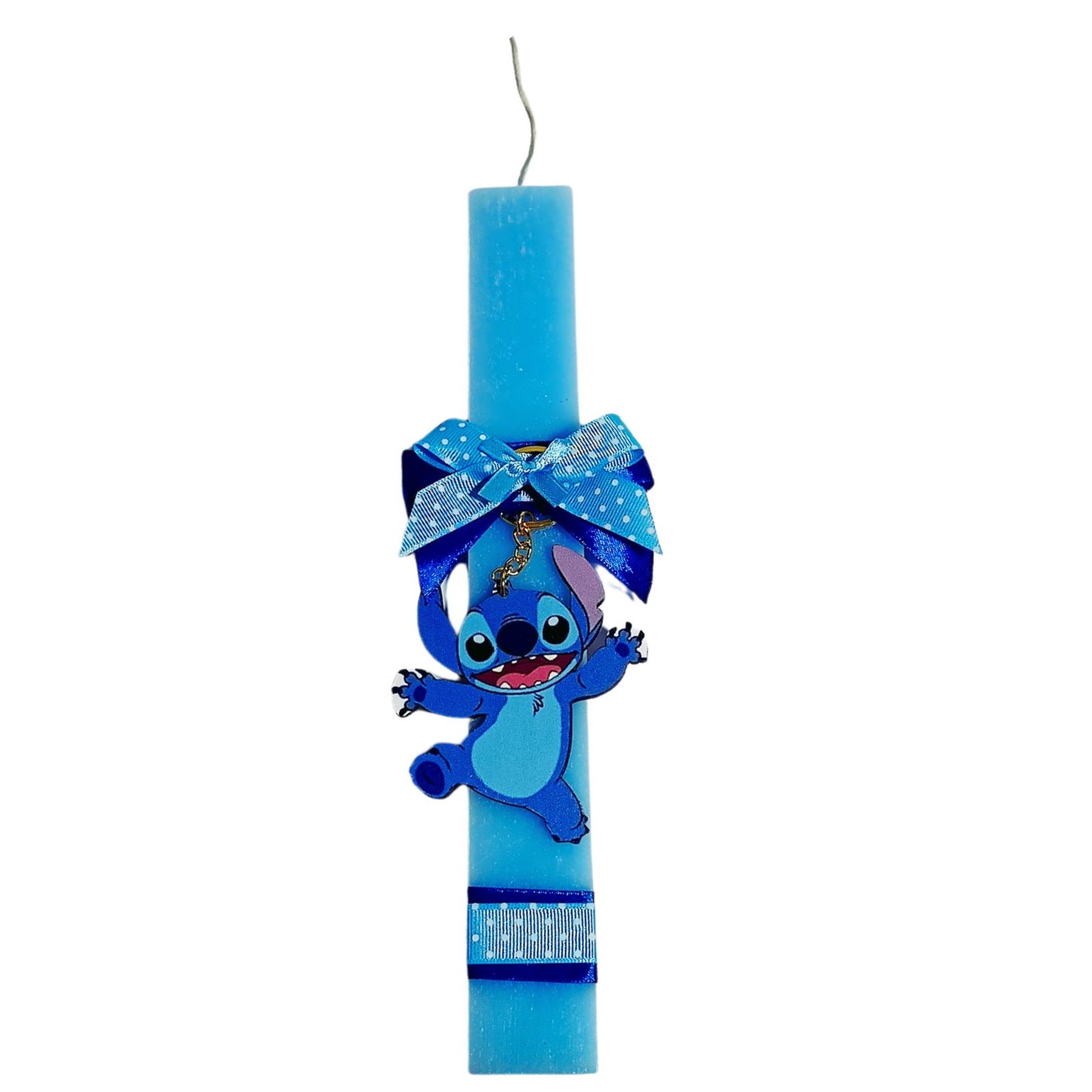 Πασχαλινή λαμπάδα με ξύλινο εκτυπωμένο μπρελόκ με τον διάσημο ήρωα κινούμενων σχεδίων Stitch.