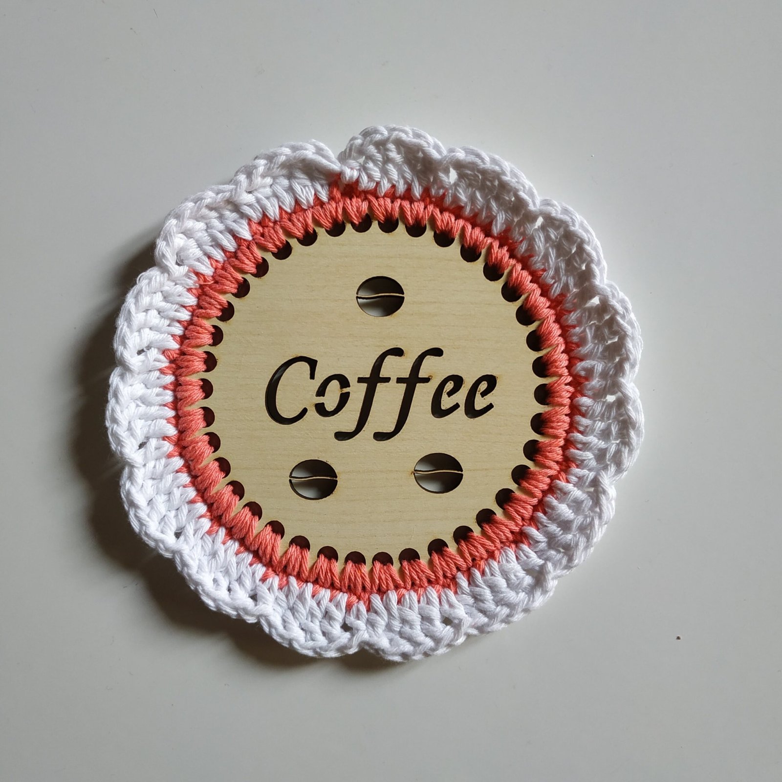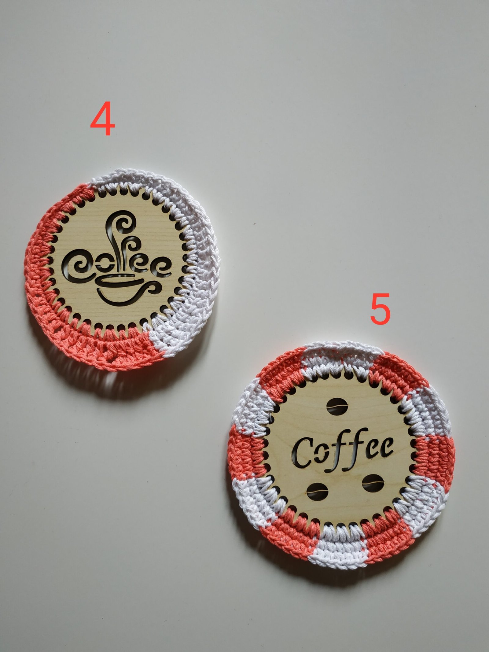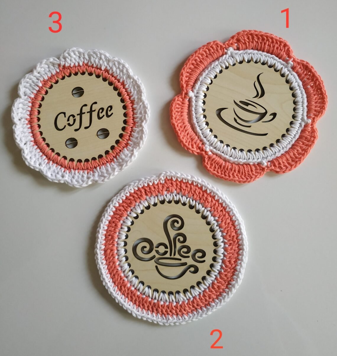 Πλεκτά σουβέρ σε ξύλινη στρογγυλή βάση με σχέδιο και δύο βαμβακερά νήματα της επιλογής σας.