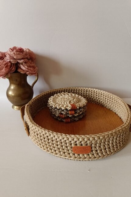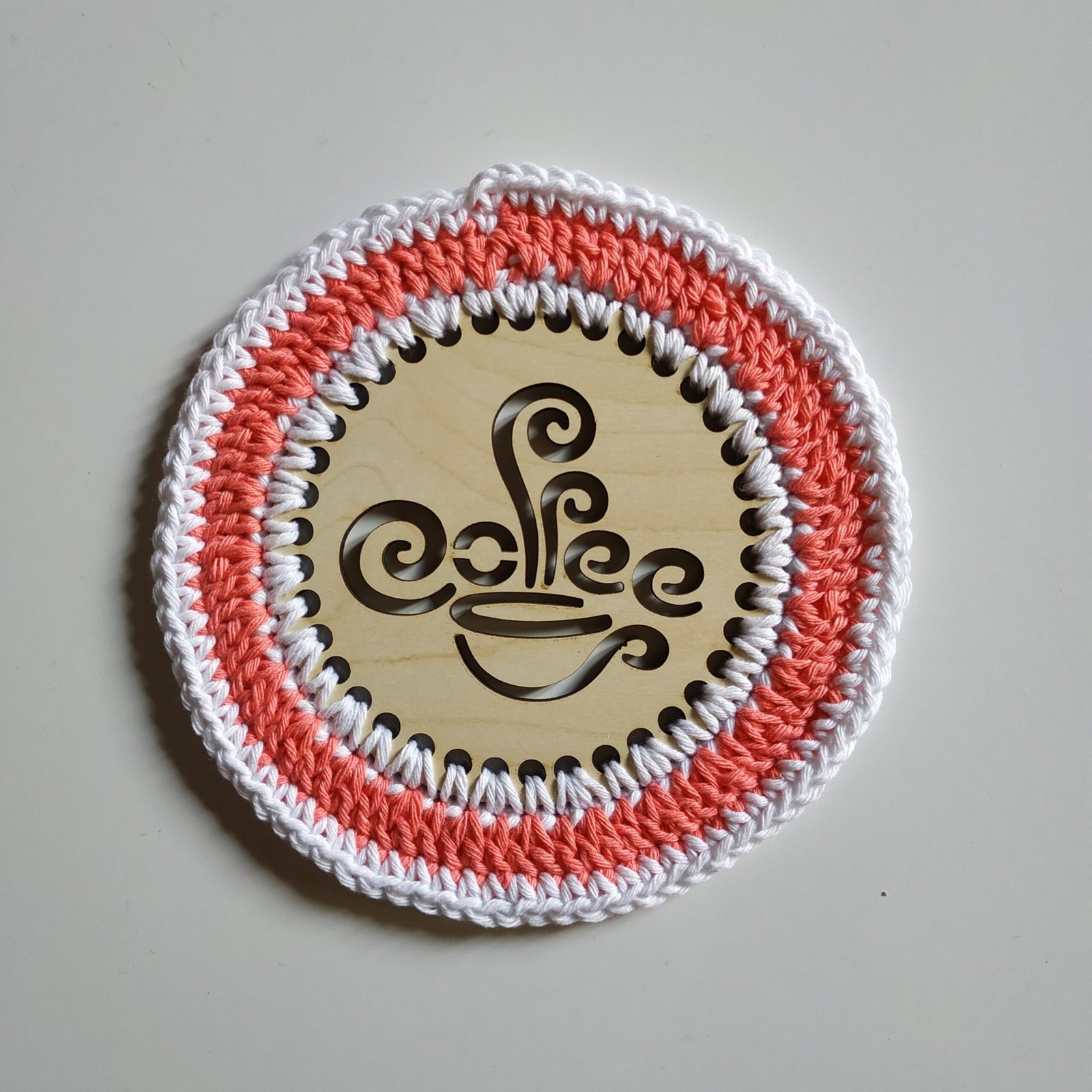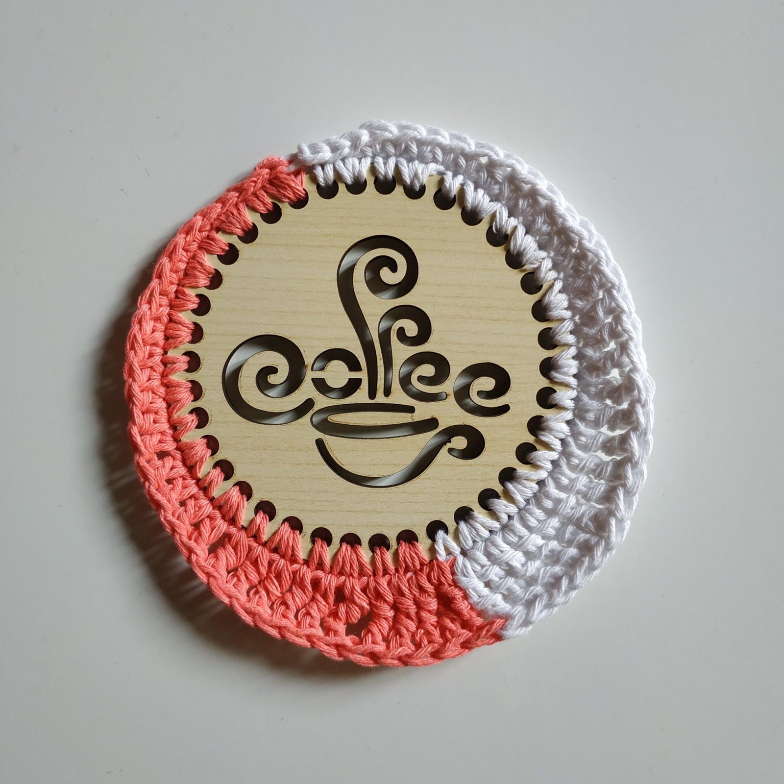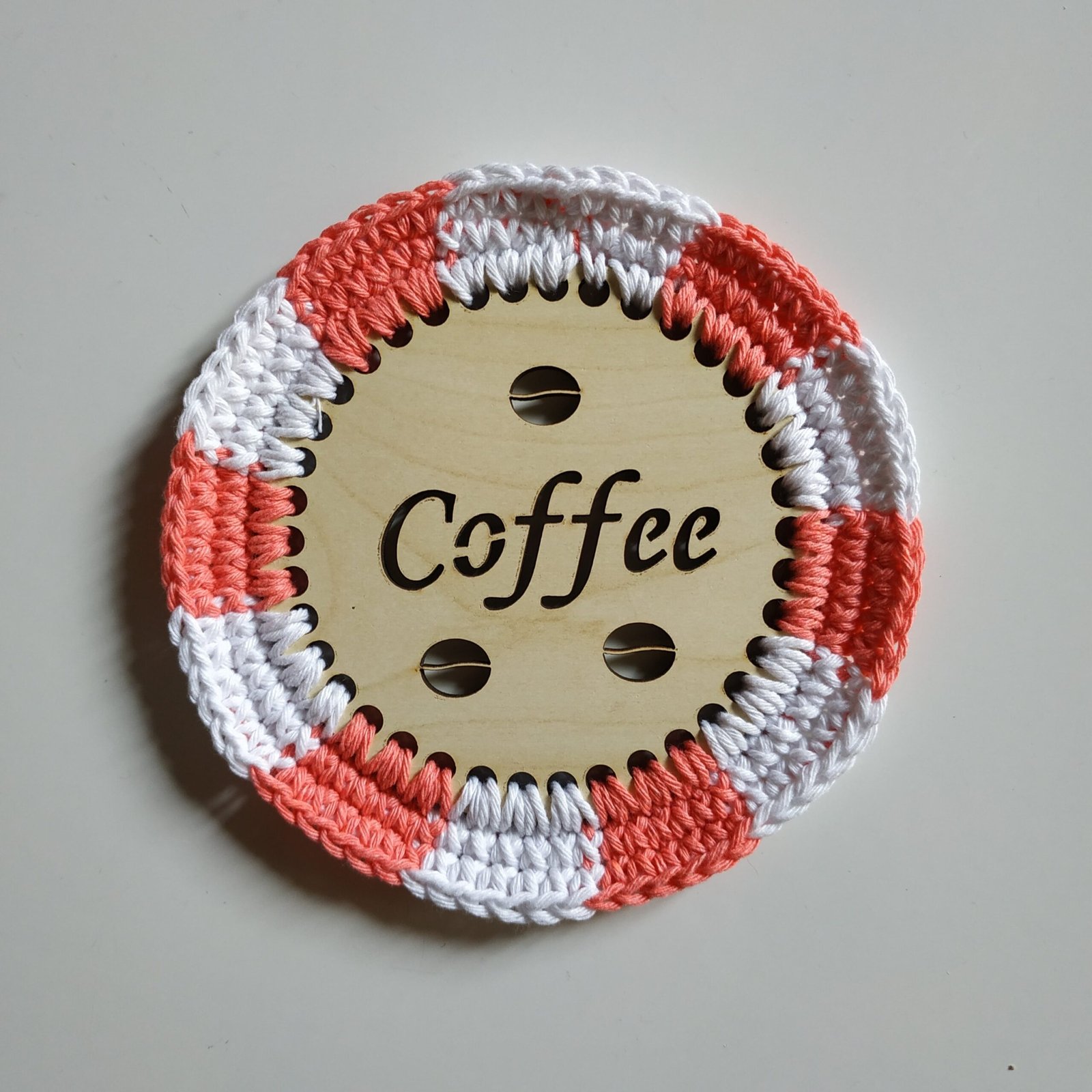 Πλεκτά σουβέρ σε ξύλινη στρογγυλή βάση με σχέδιο και δύο βαμβακερά νήματα της επιλογής σας.