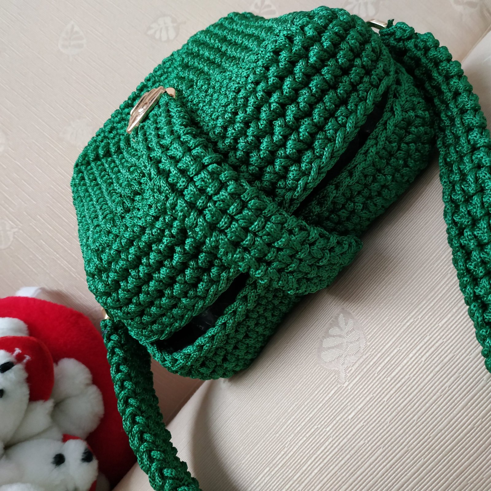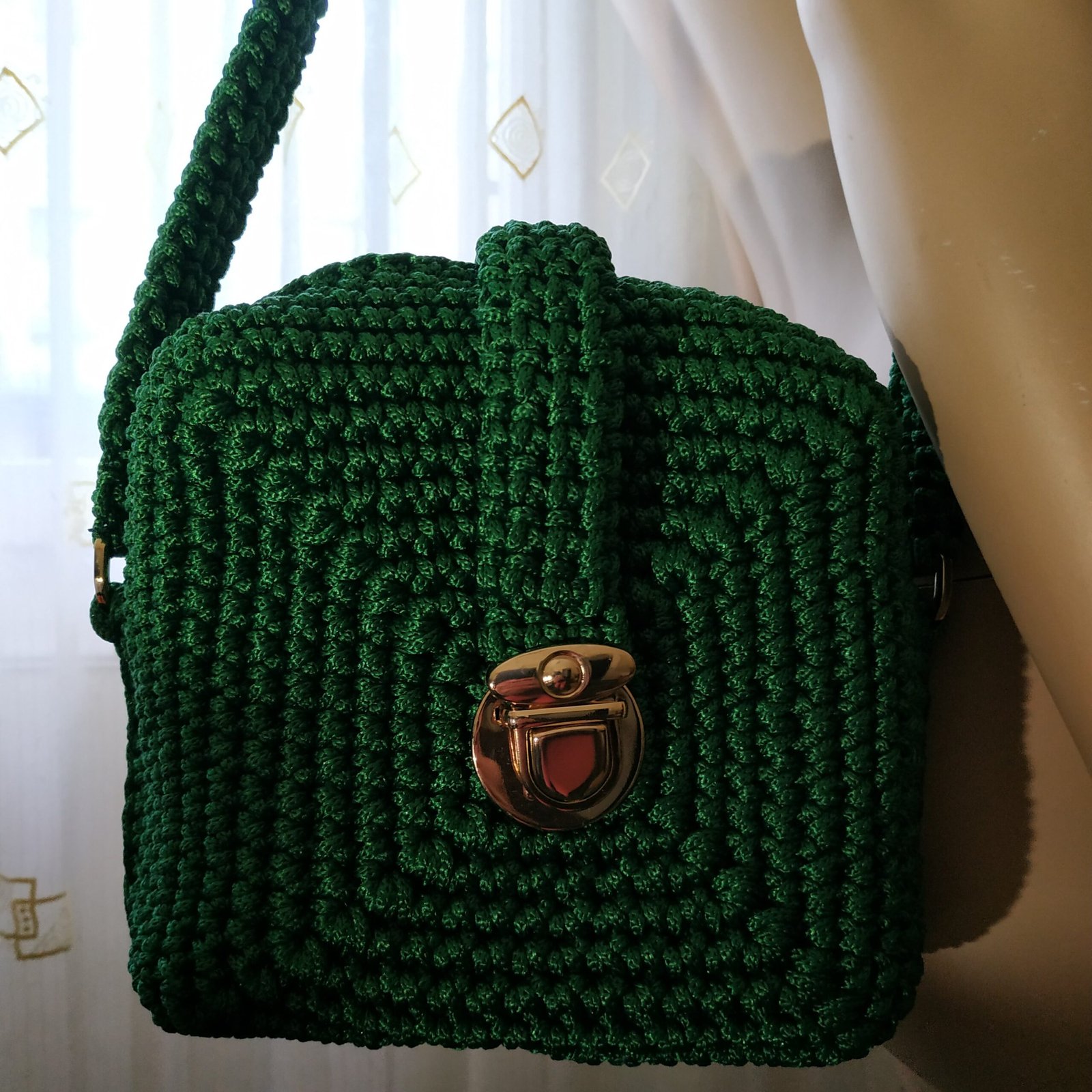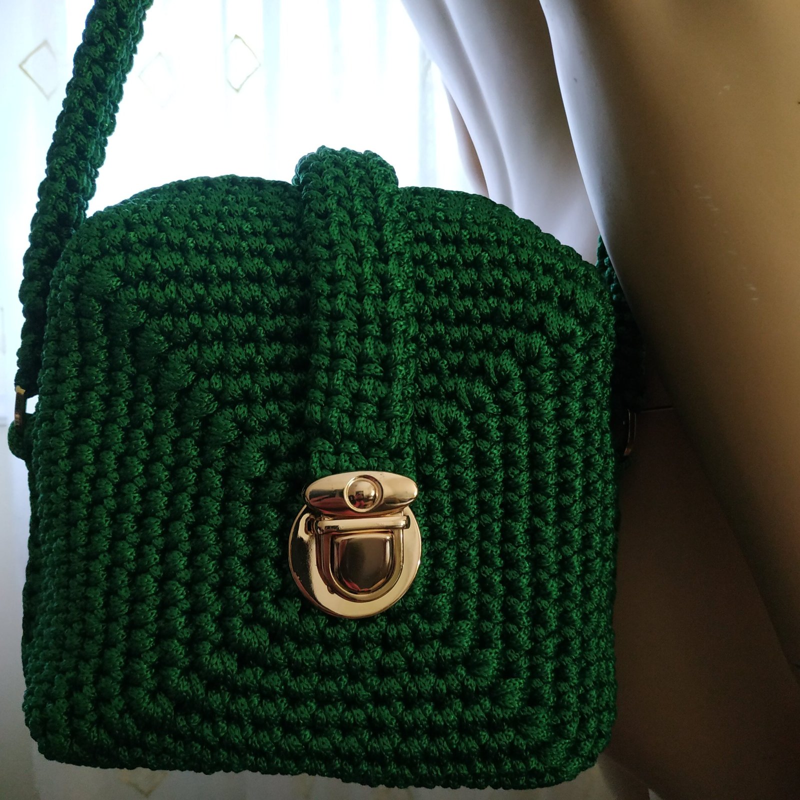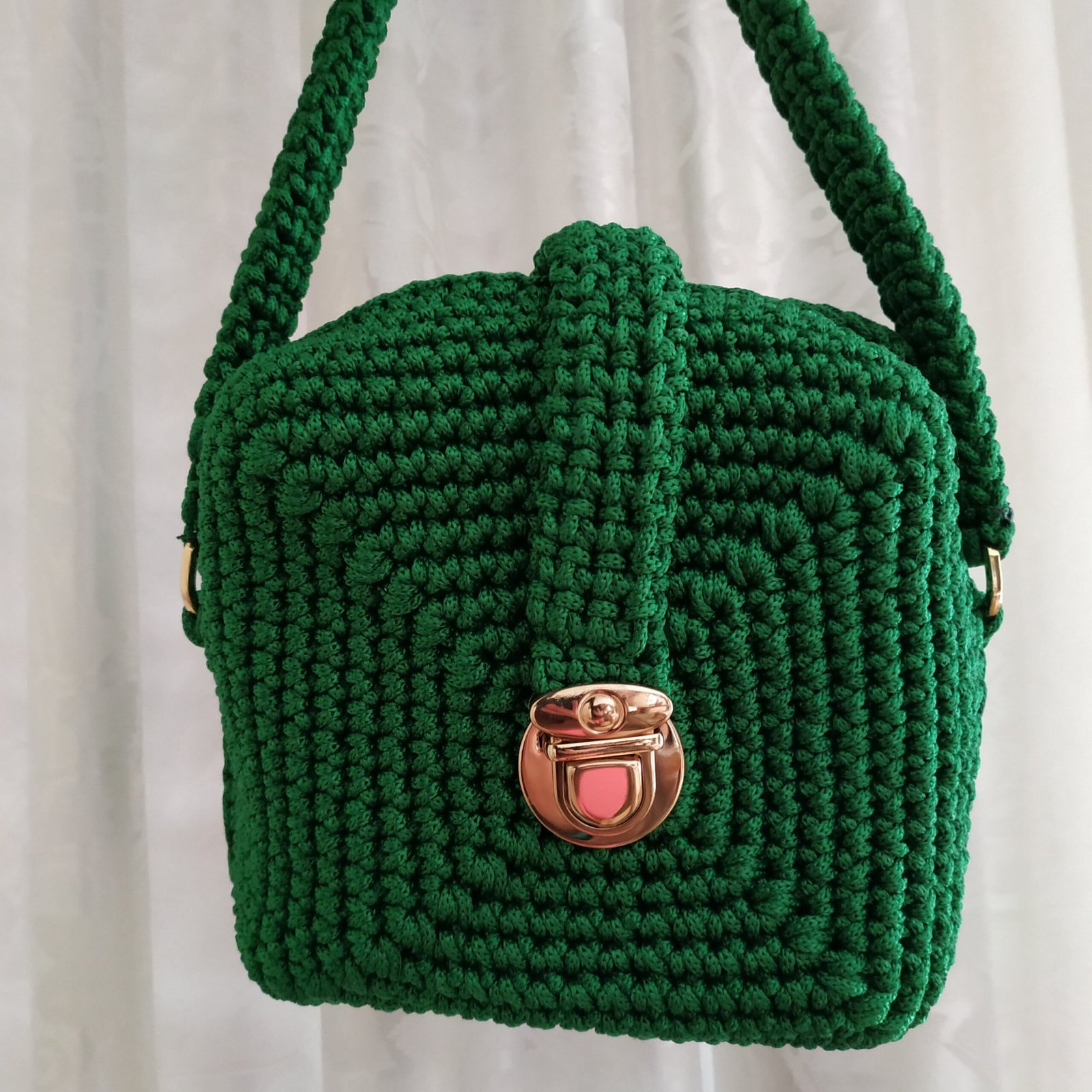 Πλεκτή τσάντα τετράγωνη 18 εκ σε κυπαρισσί χρώμα με μεταλλικό κούμπωμα. Διαθέτει πλεκτό χεράκι και το μήκος της φτάνει μέχρι το γοφό περίπου. Είναι ελαφριά και ιδανική για όλες τις ώρες της ημέρας.