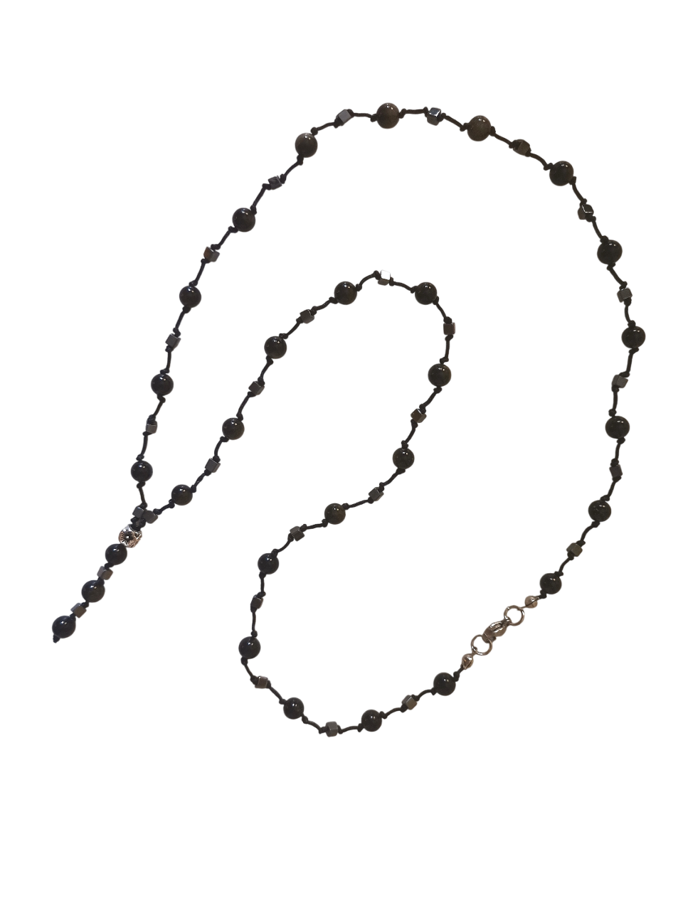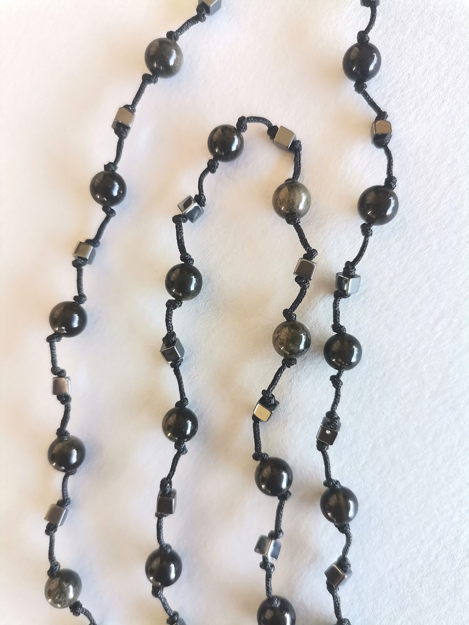 Κολιέ ροζάριο με οψιδιανό golden sheen 6mm, αιματίτες σε κύβο 3mm, επάργυρο μεταλλικό στοιχείο από zamak και ατσάλινο κούμπωμα, δεμένο σε ίσες αποστάσεις με μαύρο κορδόνι.