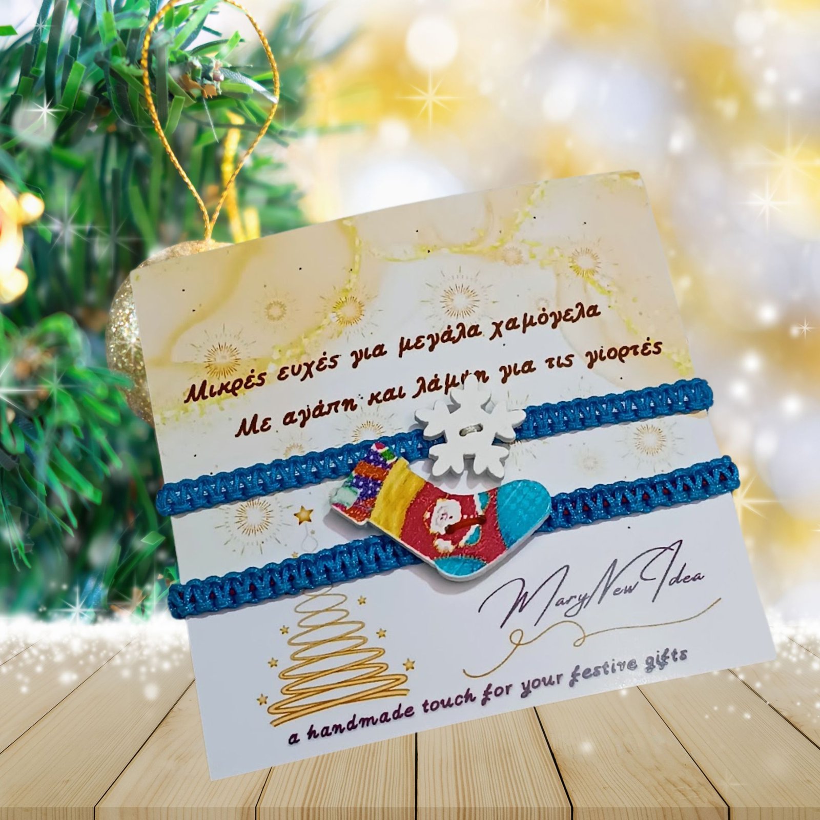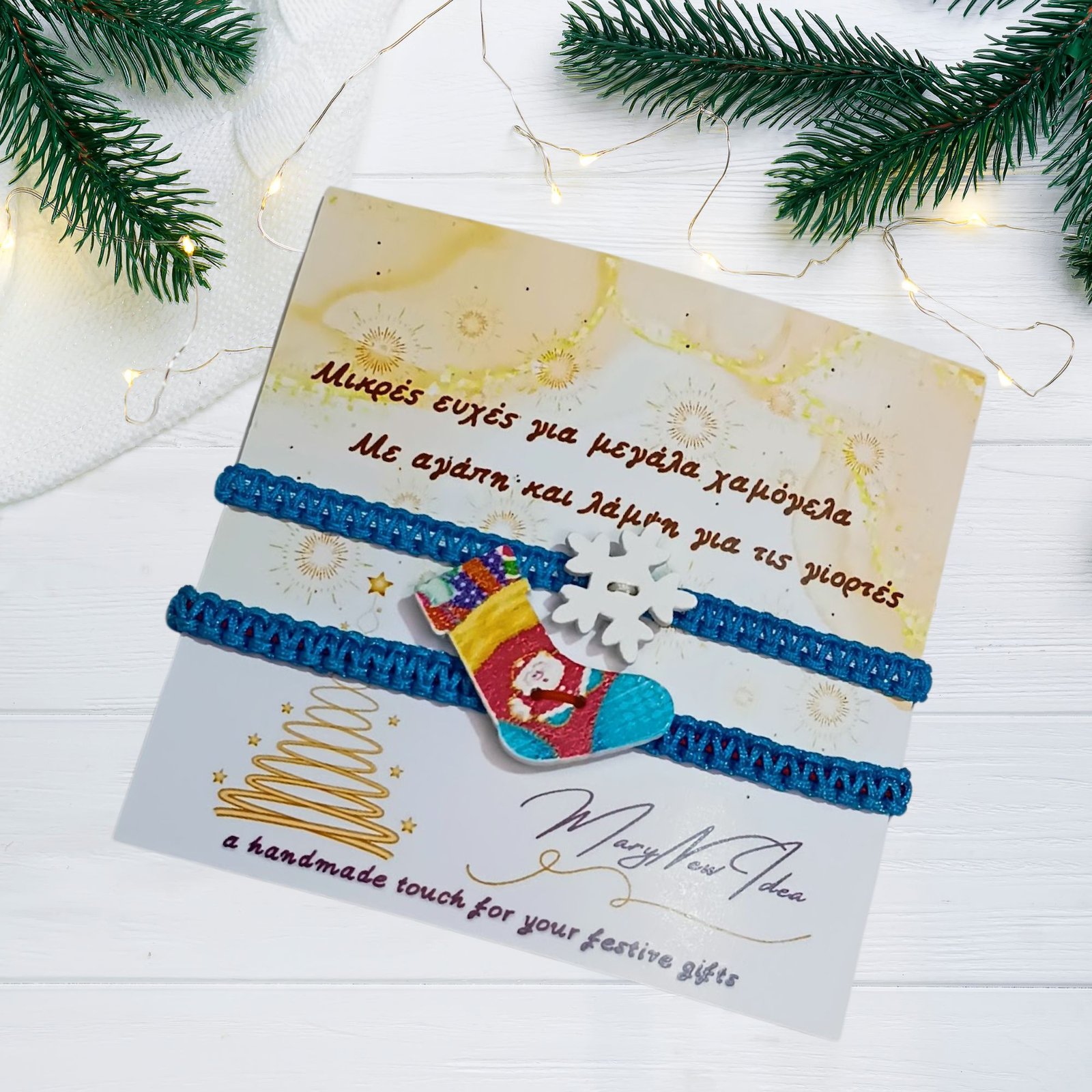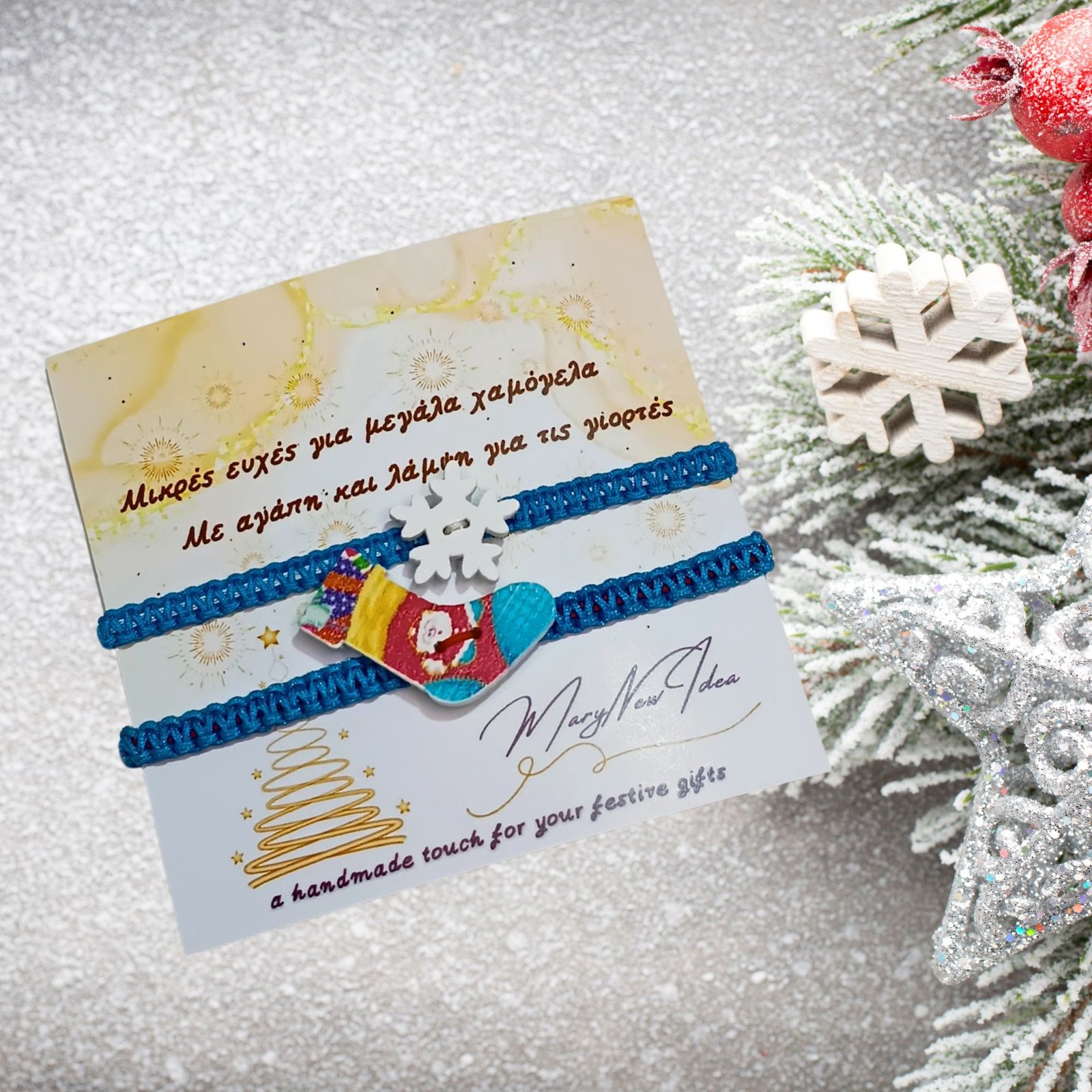 Περιλαμβάνει μπότα και χιονονιφάδα από ξύλο, πάνω σε κορδόνια μακραμέ που θυμίζουν χιονισμένο πρωινό.
