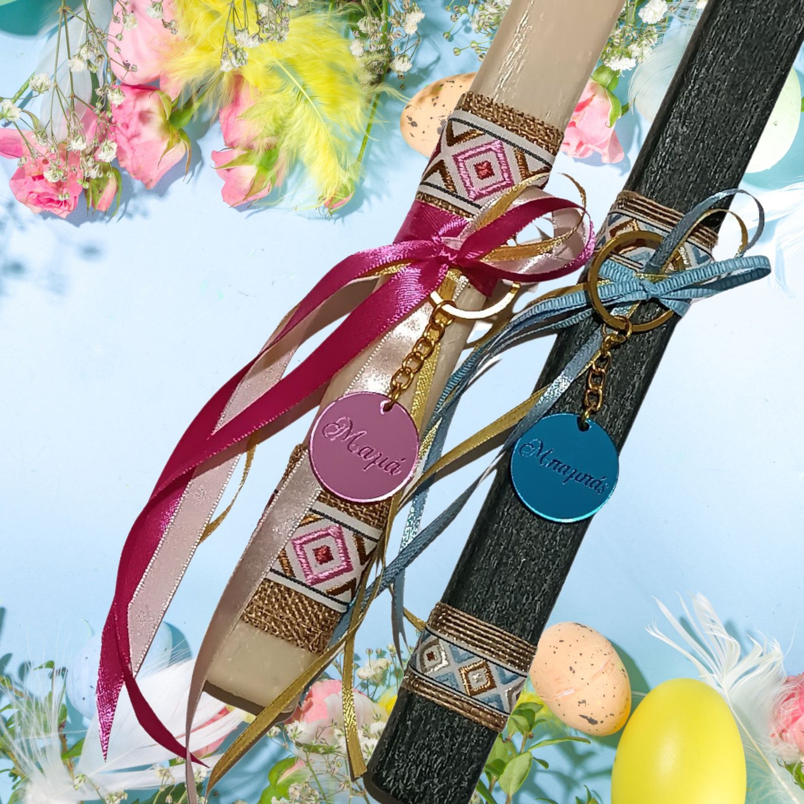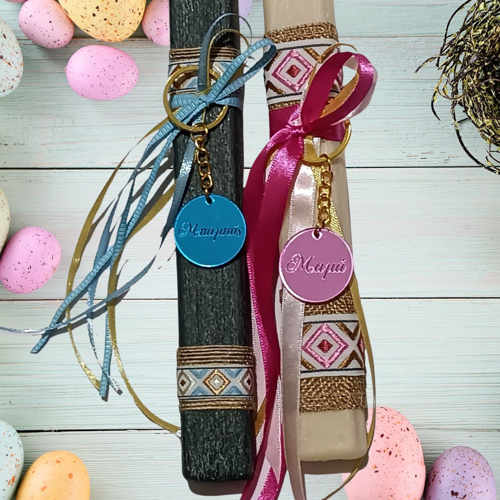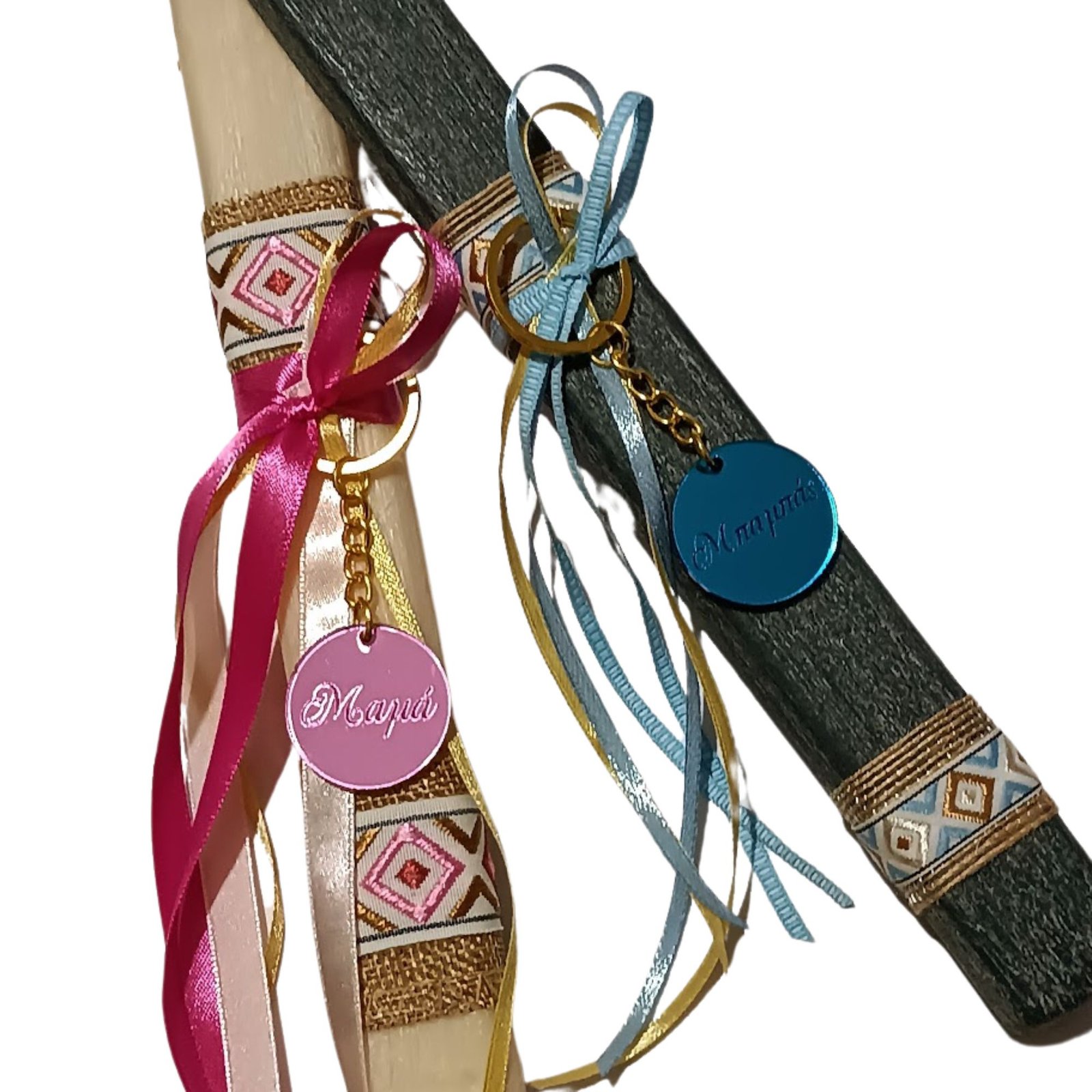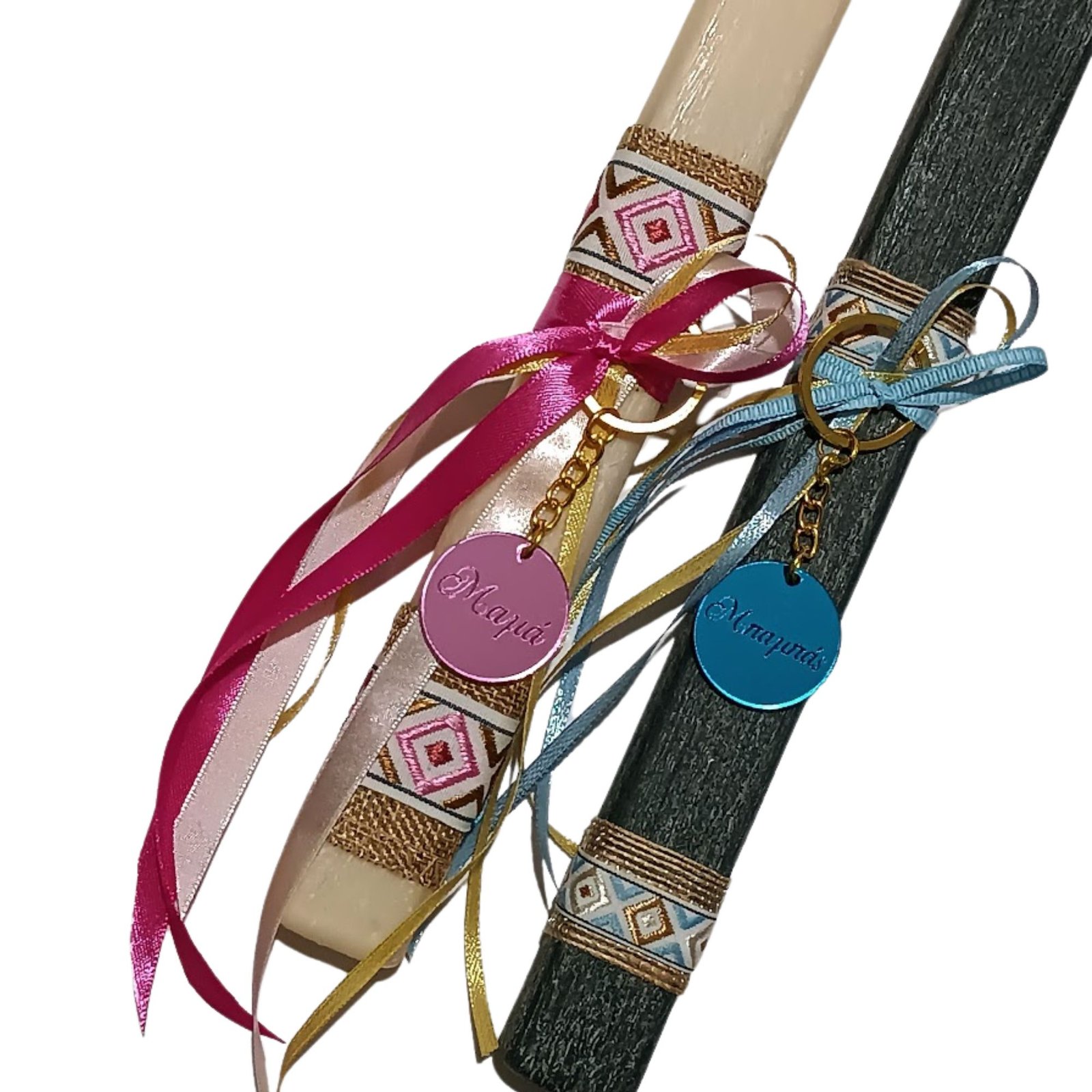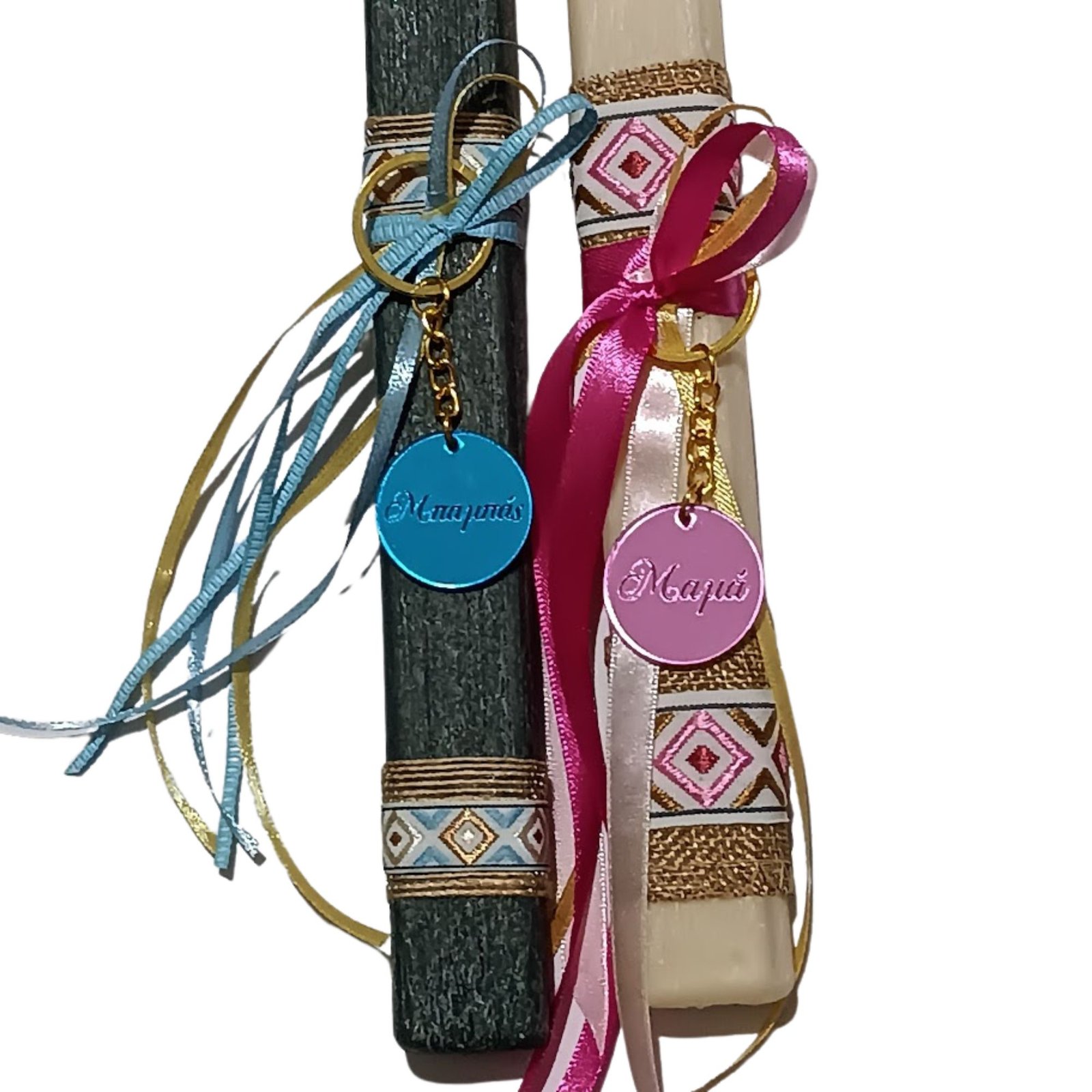Πασχαλινές λαμπάδες σετ για μαμά και μπαμπά με μπρελόκ σε ροζ και γαλάζιο πλεξιγκλάς αντίστοιχα!!