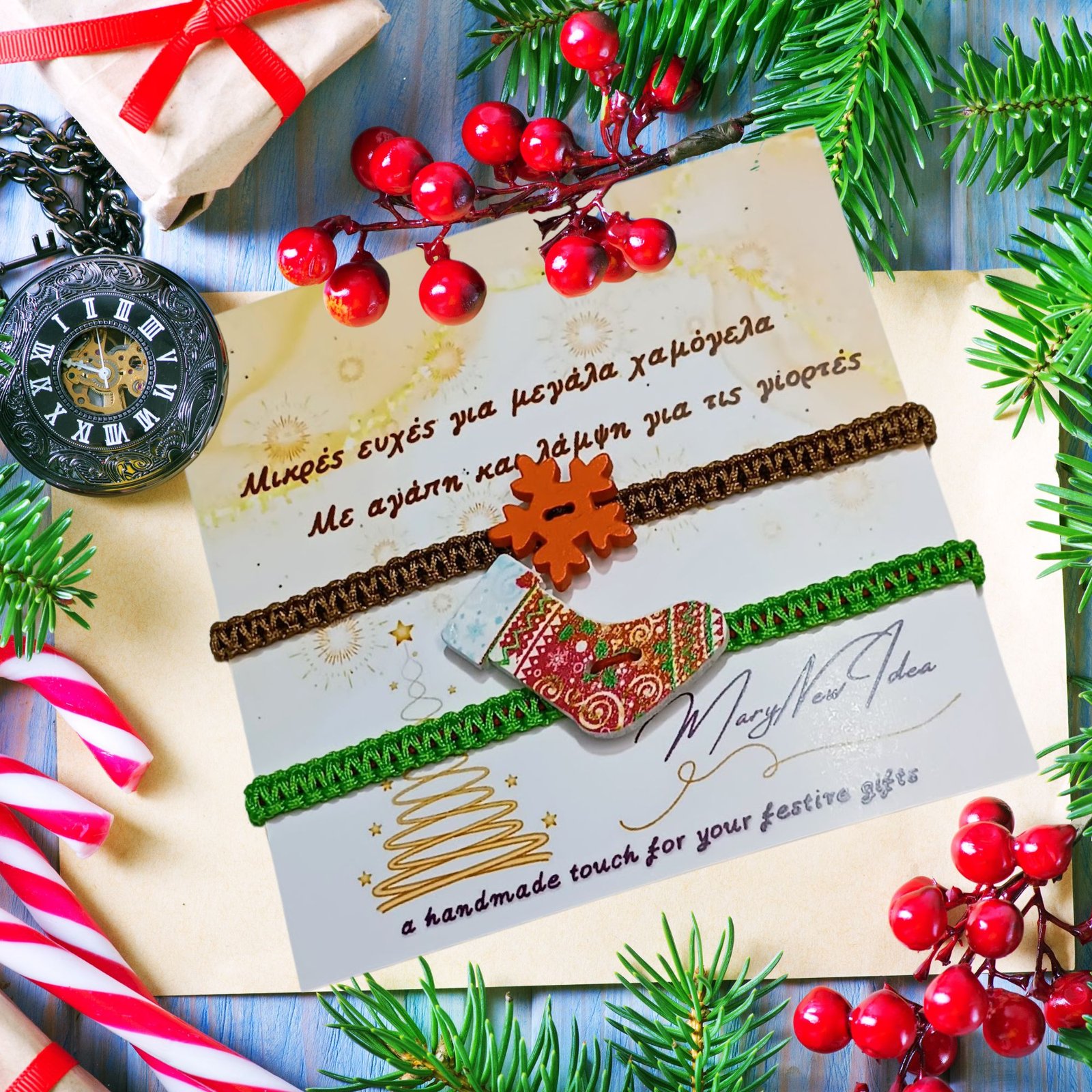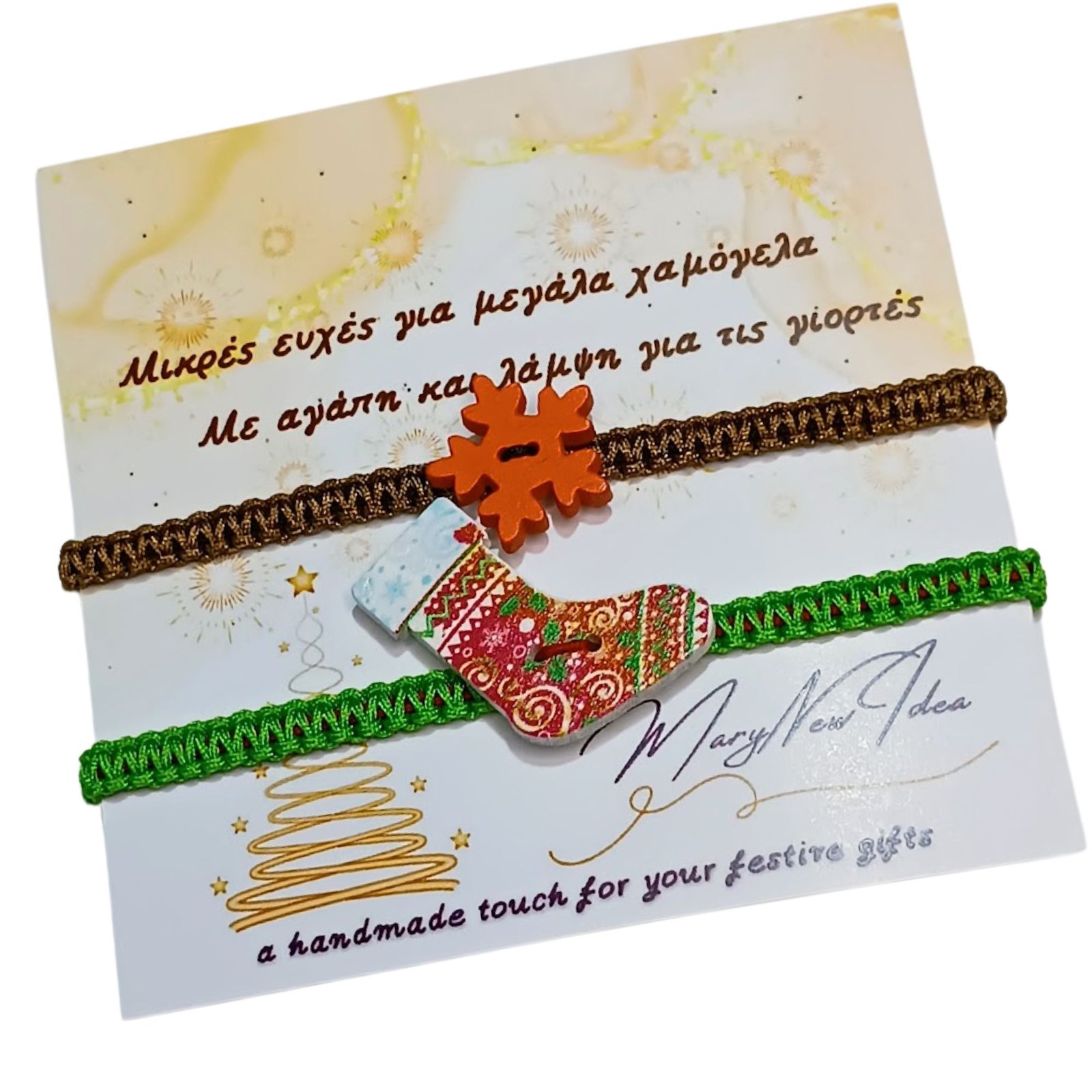 Σετ βραχιόλια πράσινο – καφέ με μπότα και χιονονιφάδα
