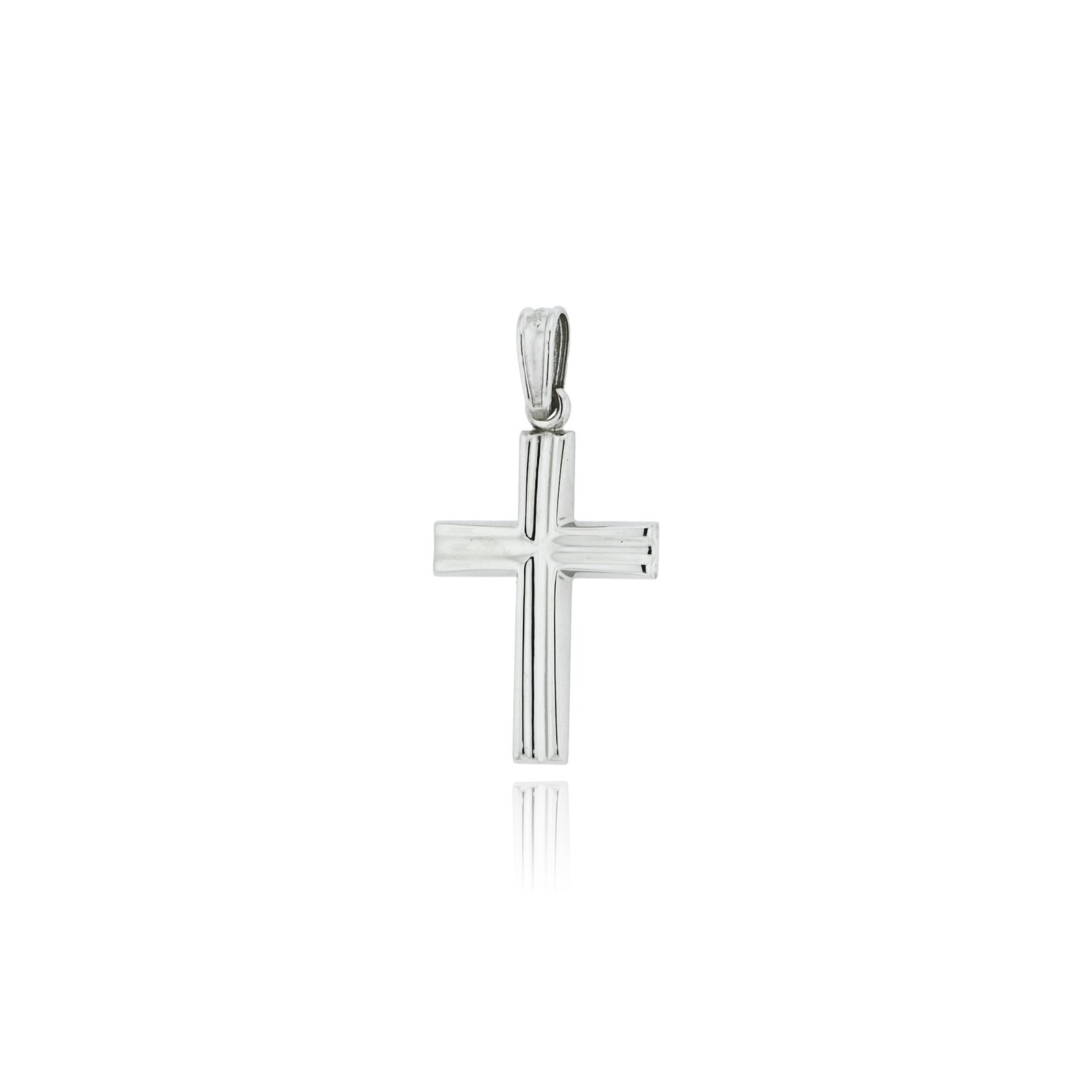 Σταυρός βάπτισης για αγόρι κατασκευασμένος από λευκό χρυσό 14 καρατίων, που ξεχωρίζει για το μοναδικό σχέδιο που δημιουργεί μια αίσθηση χαραγμένου σταυρού πάνω στον κύριο σταυρό. Αυτή η λεπτομέρεια προσδίδει έναν εκλεπτυσμένο και μυστηριακό χαρακτήρα στο κόσμημα, καθιστώντας το ιδανική επιλογή για τη βάπτιση ενός αγοριού.