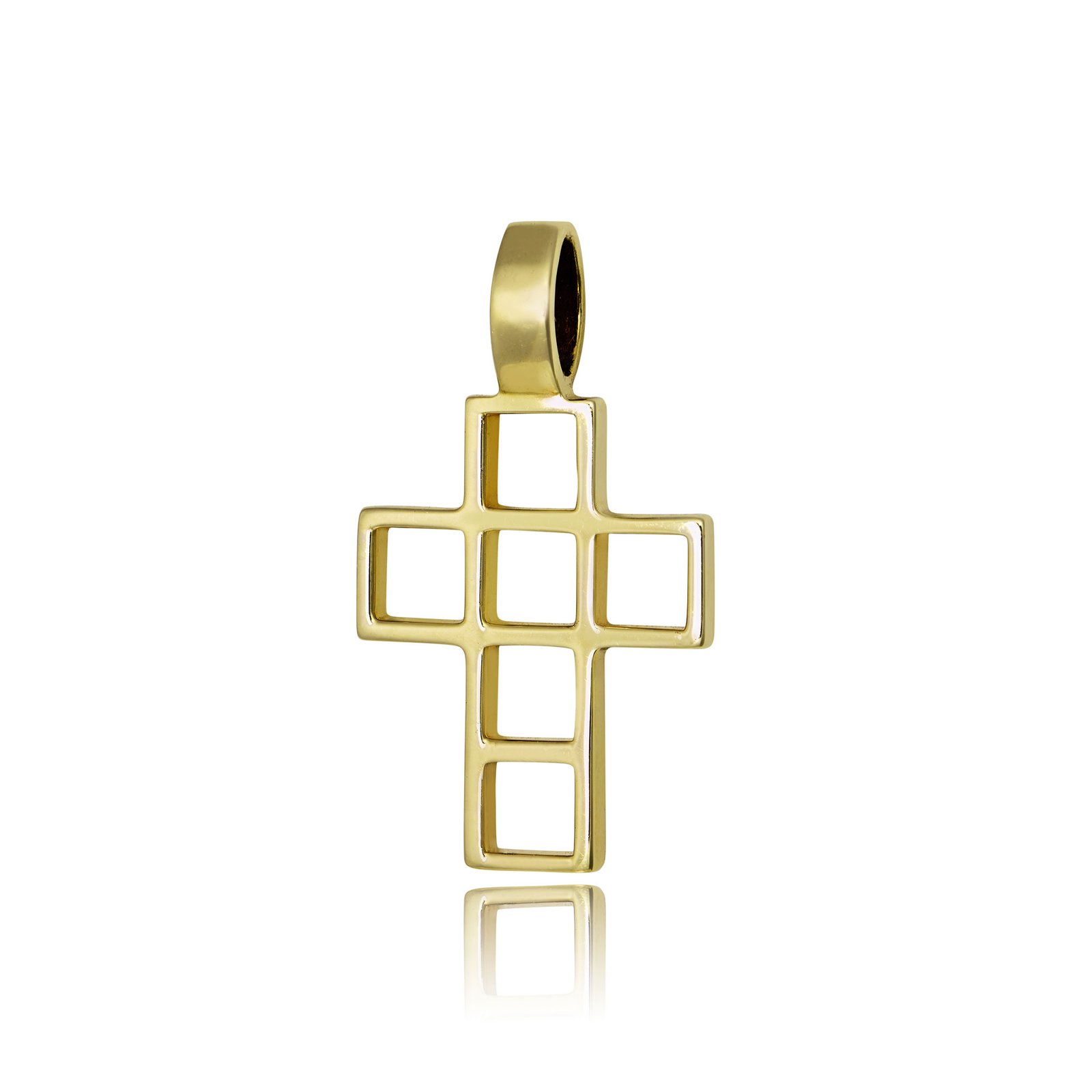 Σταυρός βάπτισης από κίτρινο χρυσό 14 καρατίων με μοντέρνο, γεωμετρικό σχέδιο. Η μοναδική του κατασκευή με τετράγωνες ανοιχτές λεπτομέρειες τον καθιστά μια ιδιαίτερη επιλογή για όσους εκτιμούν τη σύγχρονη αισθητική.