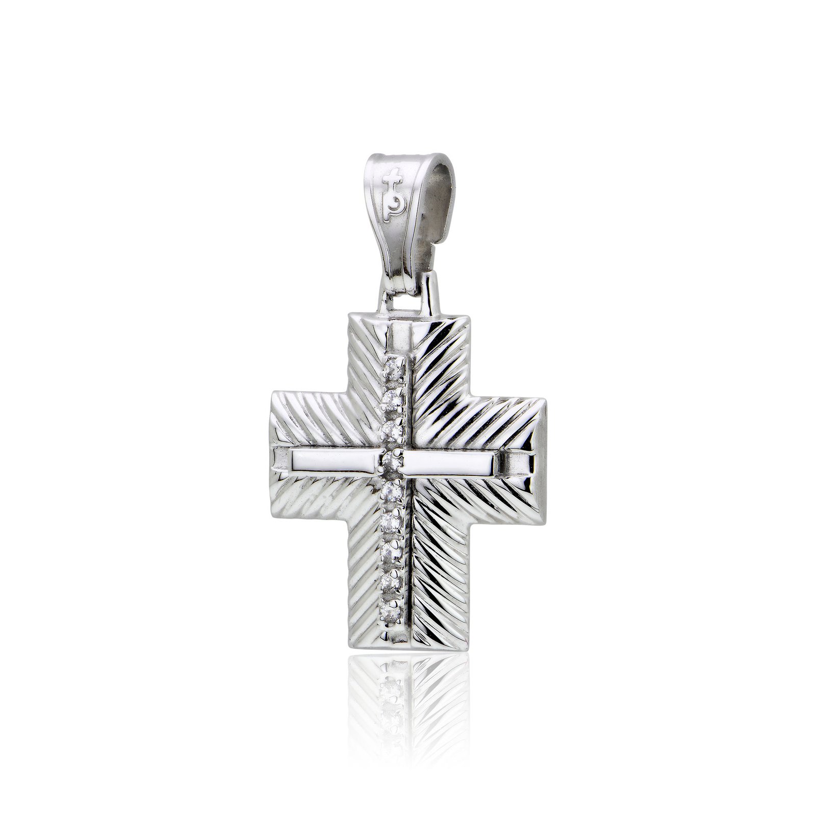 Ένας κομψός σταυρός βάπτισης από λευκό χρυσό 14 καρατίων, διακοσμημένος με λαμπερά ζιργκόν. Ο ανάγλυφος σχεδιασμός του σε συνδυασμό με τις διακριτικές πέτρες στο κέντρο χαρίζουν μοναδική λάμψη και ξεχωριστή αισθητική. Ιδανική επιλογή για μια ιδιαίτερη στιγμή, προσφέροντας ένα διαχρονικό σύμβολο πίστης και προστασίας.