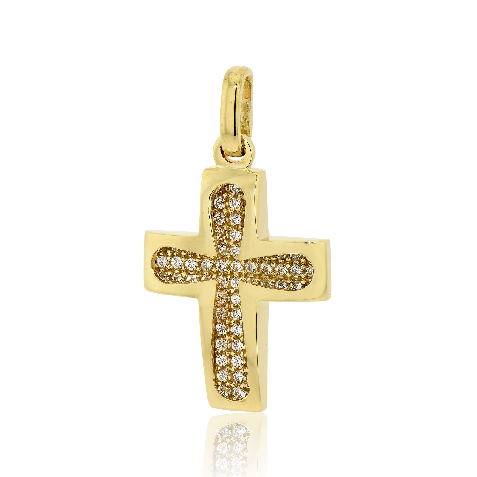 Ένας υπέροχος τρισδιάστατος σταυρός με εντυπωσιακό στόλισμα στο εσωτερικό του κομμάτι. Από κίτρινο χρυσό 14 καρατίων με λευκά ζιργκόν.