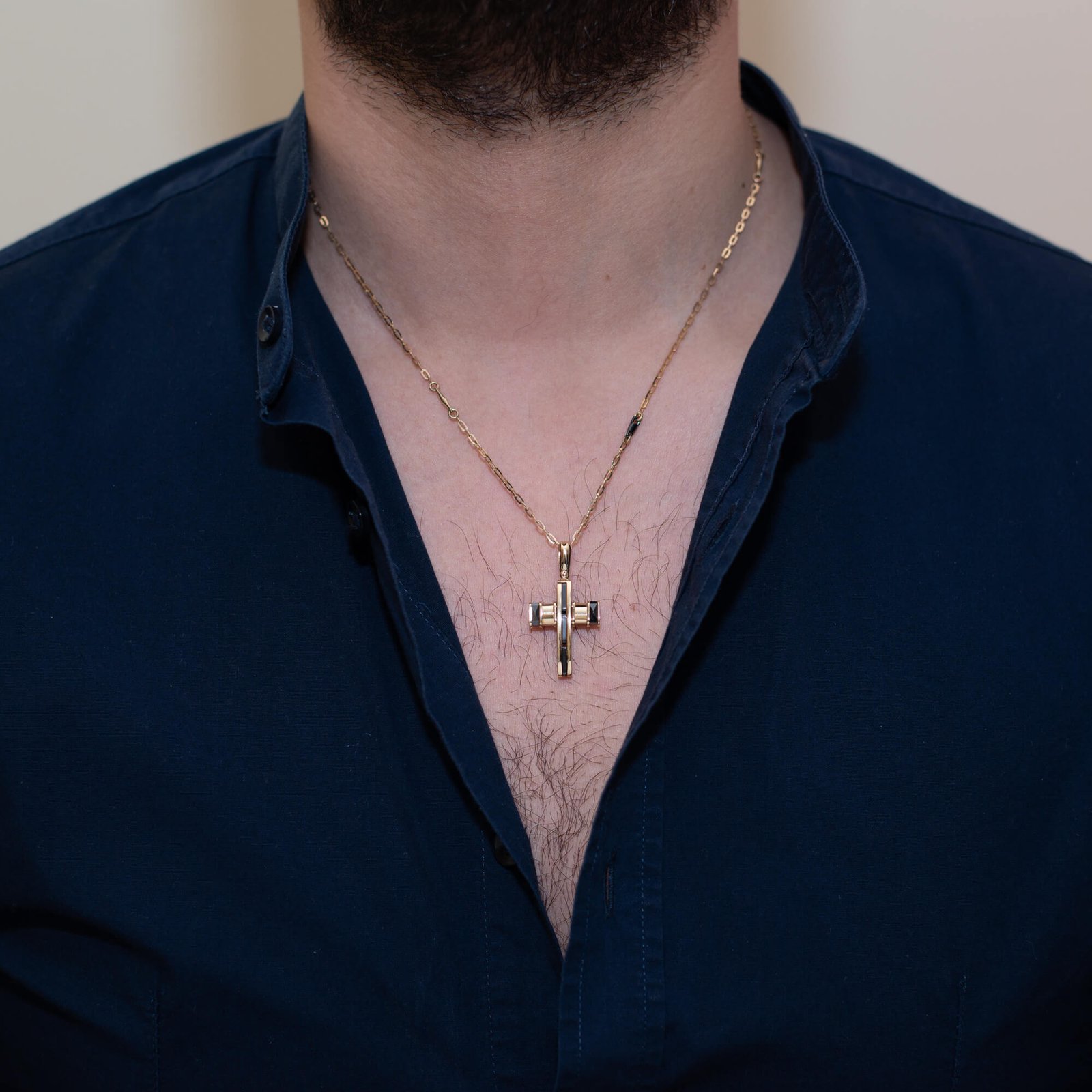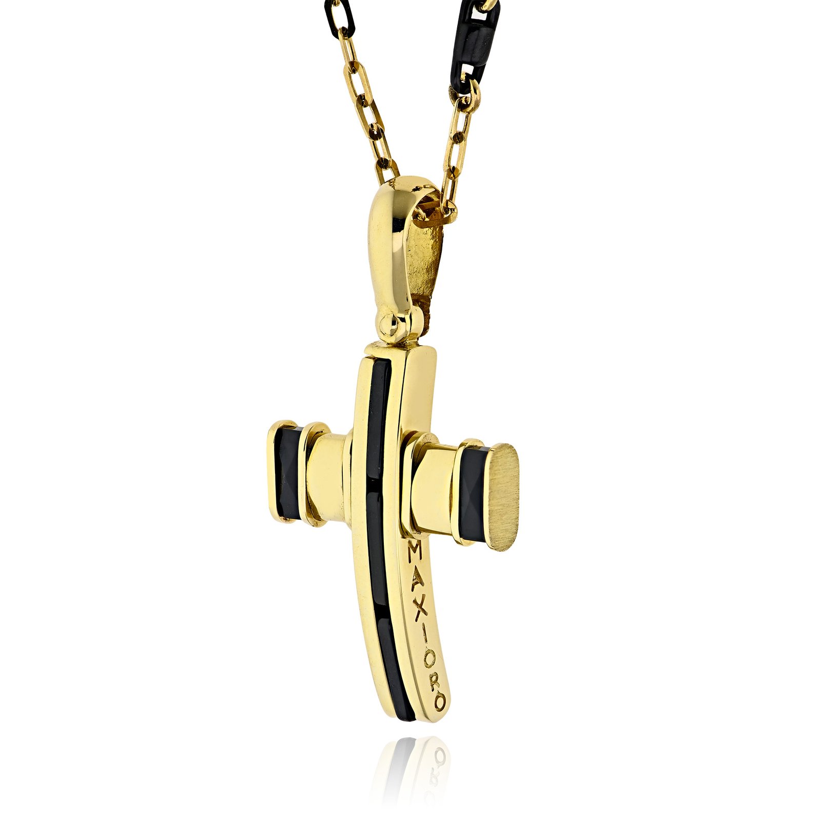 Σταυρός βάπτισης με αλυσίδα για αγόρι από κίτρινο χρυσό 14 καρατίων. Ο μοντέρνος σχεδιασμός του, με τις μαύρες λεπτομέρειες, προσδίδει ιδιαίτερο χαρακτήρα, συνδυάζοντας δυναμικότητα και κομψότητα. Η αλυσίδα περιλαμβάνεται.