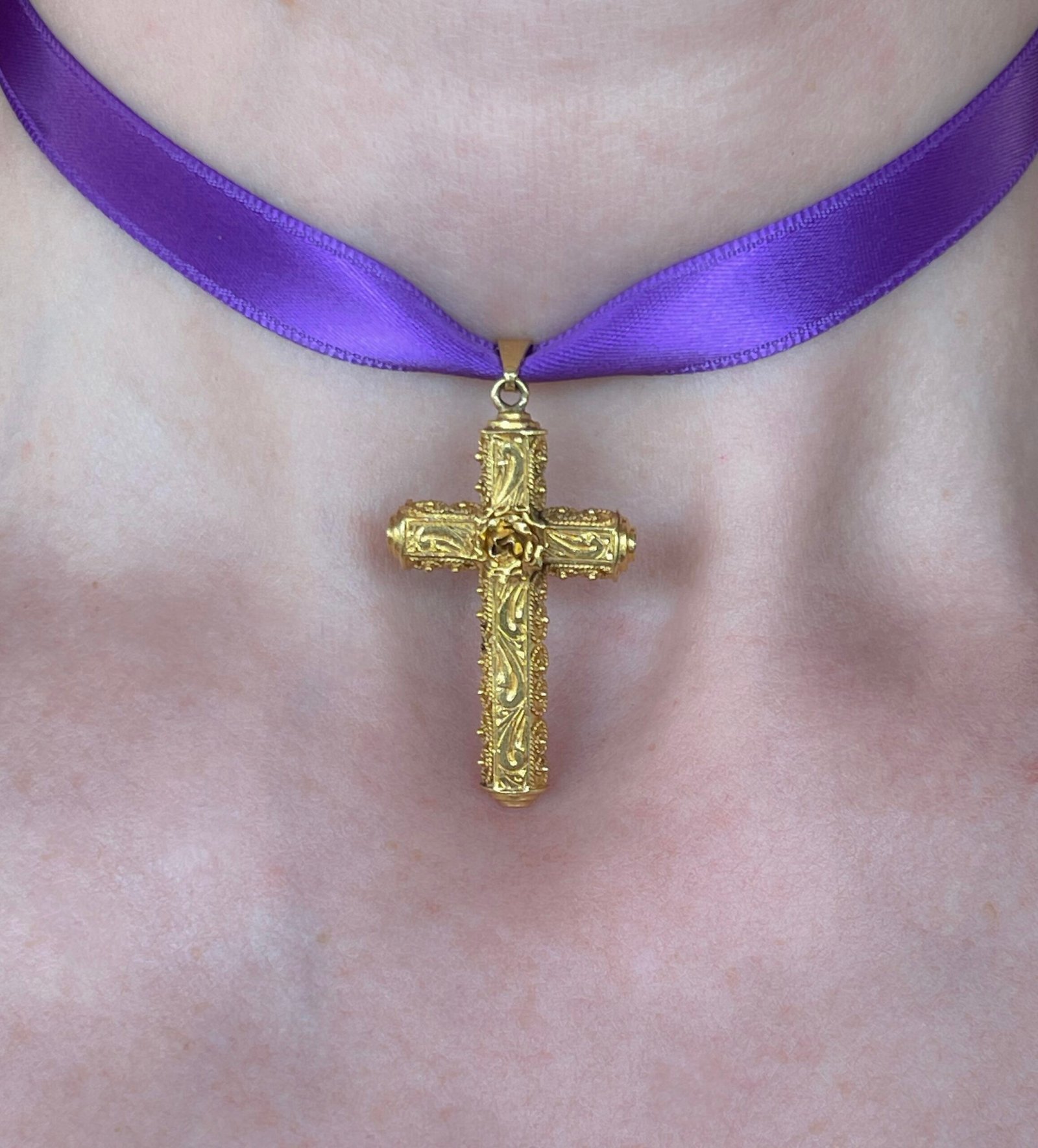 Ένας εκπληκτικός vintage σταυρός από κίτρινο χρυσό. Πρόκειται για ένα χειροποίητο αριστούργημα κοσμηματοποιϊας, διακοσμημένο με εντυπωσιακό τρόπο. Όλη η μπροστινή επιφάνεια είναι σκαλισμένη με σχέδια που θυμίζουν φύλλα ή κλαδιά. Στο κέντρο είναι τοποθετημένο ένα τρισδιάστατο τριαντάφυλλο που δίνει στο κόσμημα μια ρομαντική νότα. Τα πλαϊνά του σταυρού είναι στολισμένα με μικρά μοτίβα από στριφτό σύρμα και κοκκίδωση που του δίνουν ακόμα μεγαλύτερη αίγλη. Η λεπτομέρεια με την οποία είναι στολισμένος αυτός ο σταυρός τον κάνει ένα απόλυτα μοναδικό κόσμημα που μπορεί να φορεθεί τόσο σαν σύμβολο αλλά και σαν έργο τέχνης. Είναι σε άριστη κατάσταση. Είναι σφραγισμένος με τον αριθμό 18 (για τα καράτια του) και ελεγμένος εργαστηριακά για επιβεβαίωση.