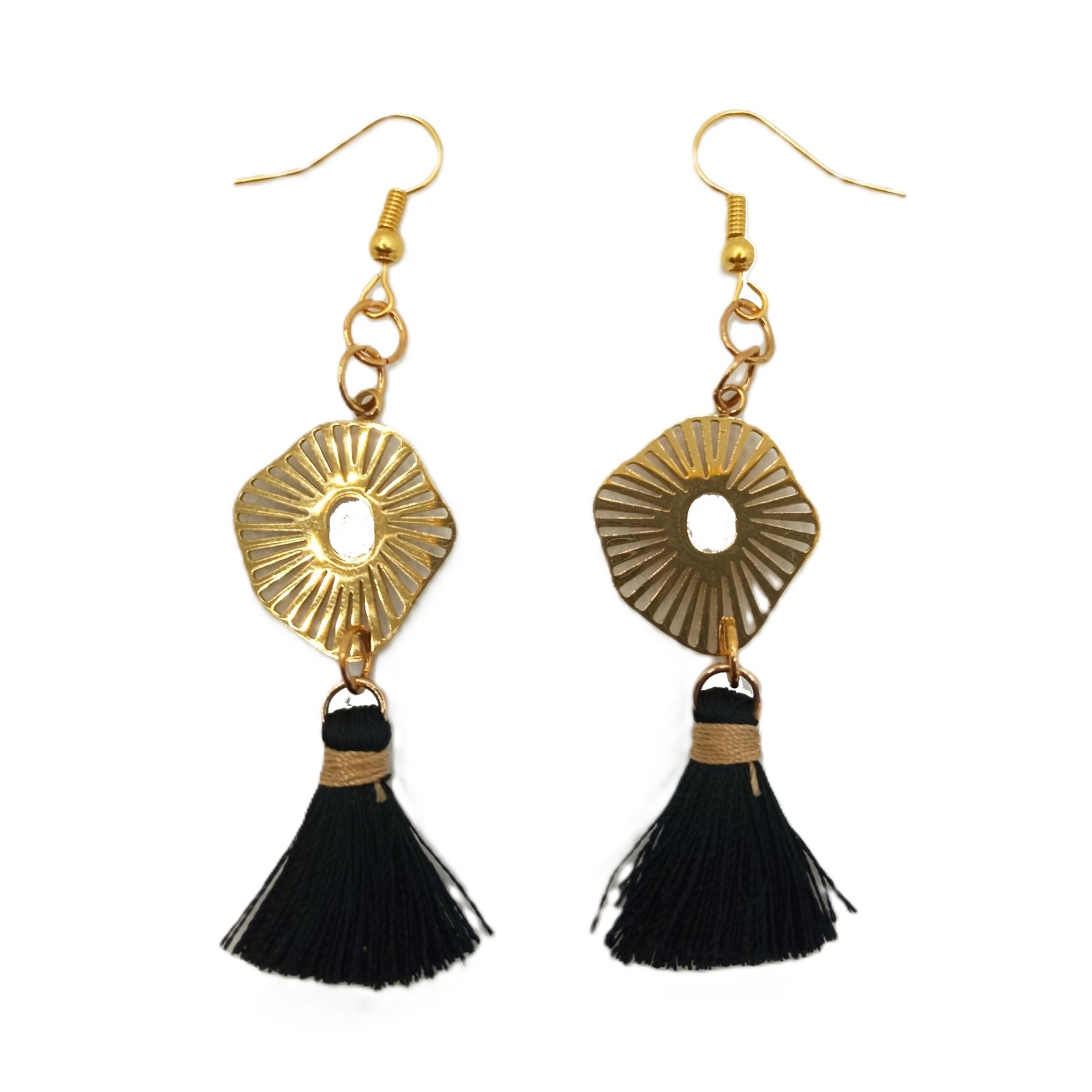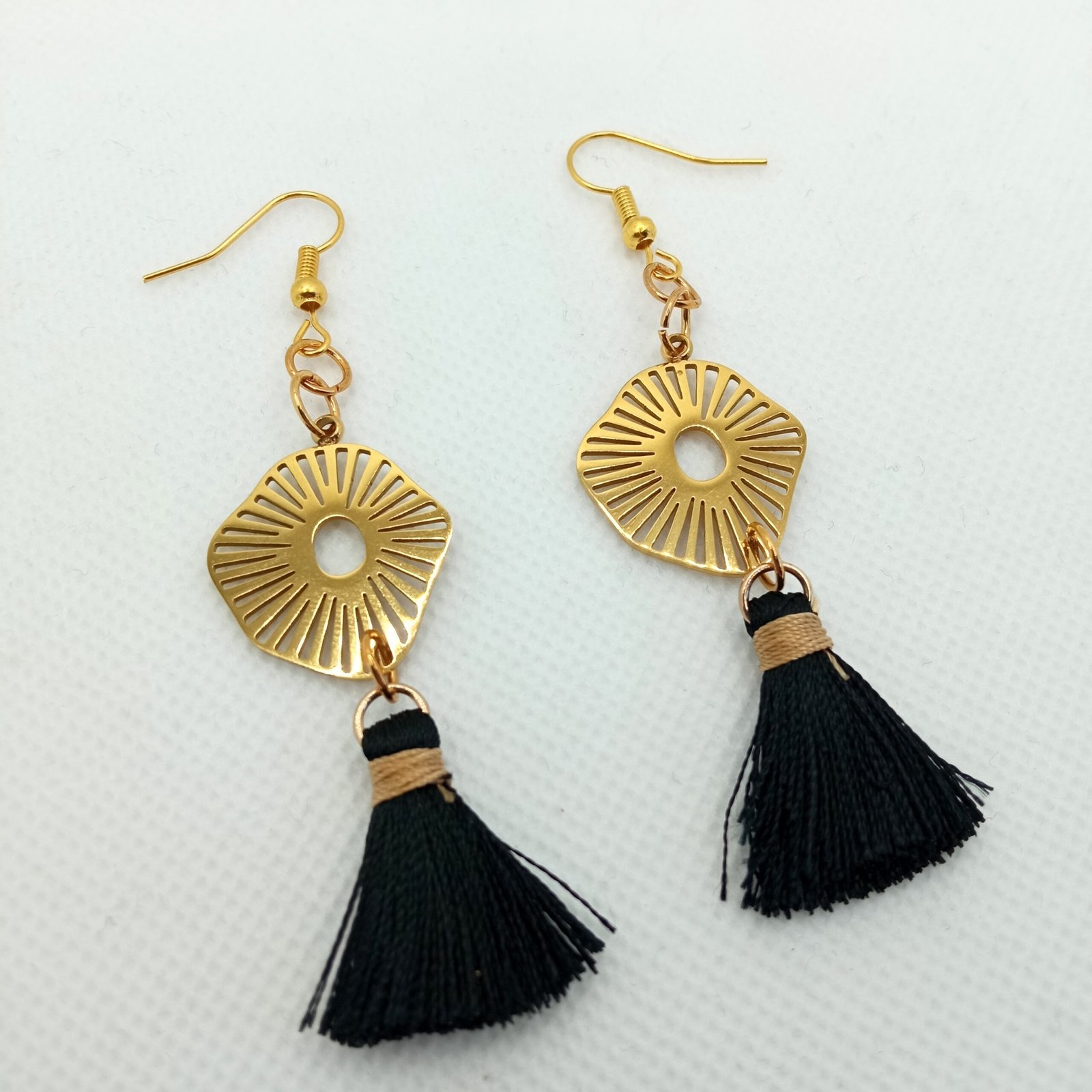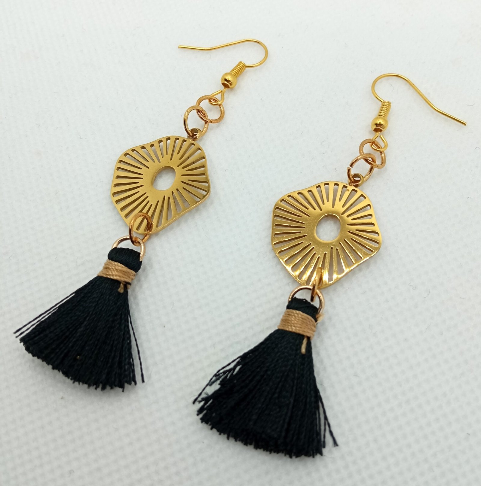 Σκουλαρίκια κρεμαστά, με ατσάλινο ακτινωτό στοιχείο σε χρυσαφί χρώμα και διακοσμητική μαύρη φούντα. Κρέμονται από ατσάλινους γάντζους σε χρυσαφί χρώμα.