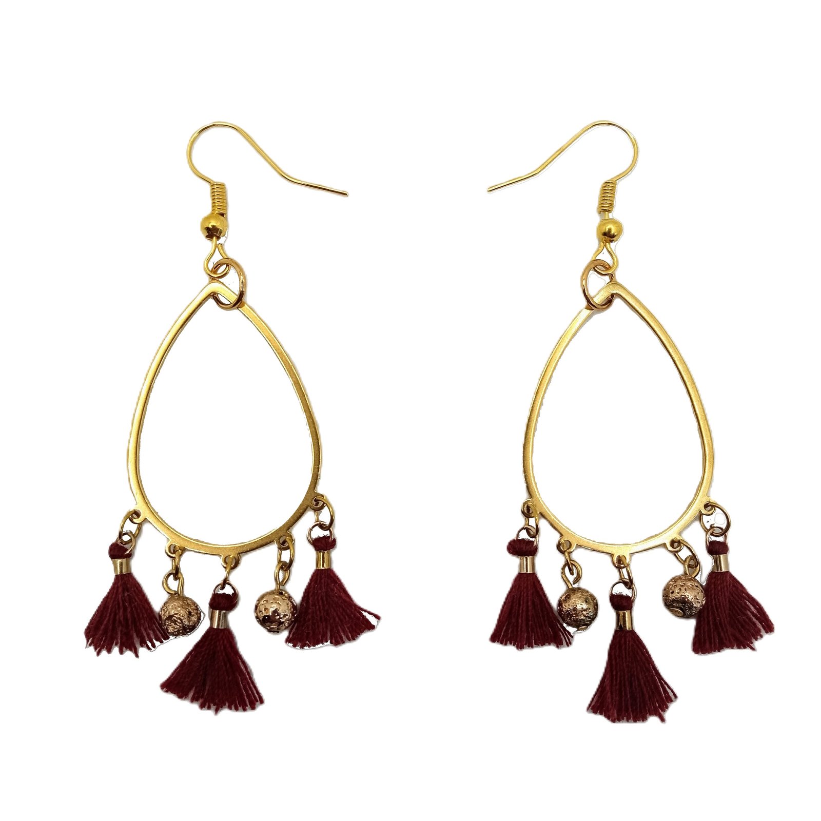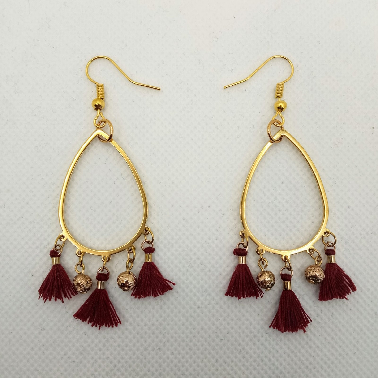 Σκουλαρίκια κρεμαστά, χειροποίητα, με ημιπολύτιμους λίθους λάβας σε χρυσαφί τόνους, ατσάλινο στοιχείο δάκρυ σε χρυσαφί χρώμα και φούντες σε μπορντό χρώμα.