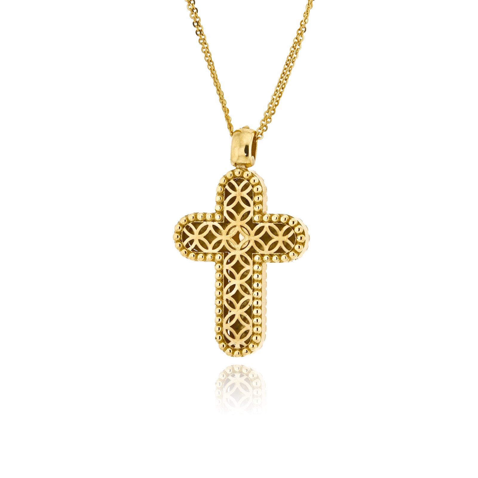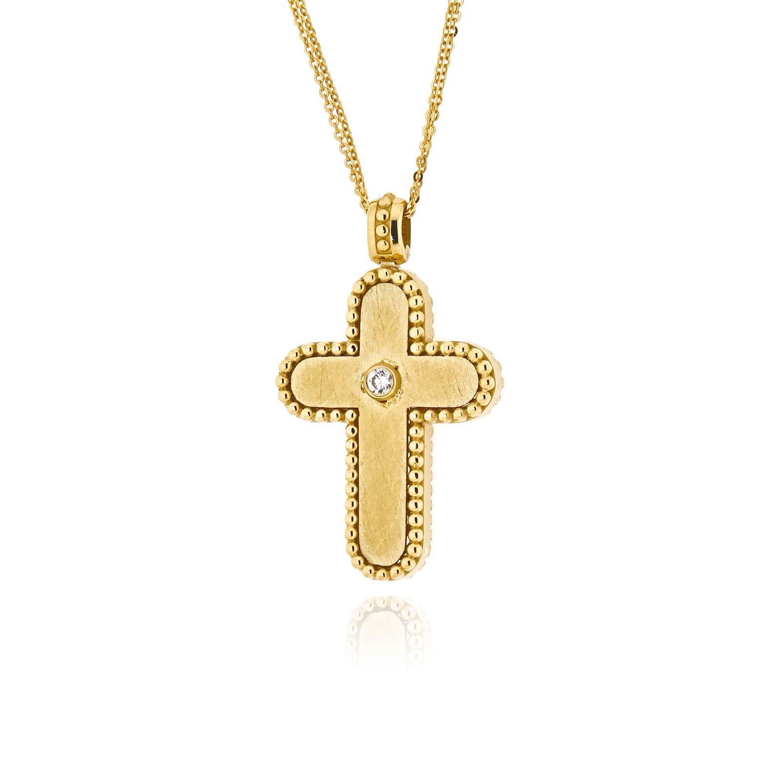 Υπέροχος σταυρός βάπτισης για κορίτσι από τη Val’oro. Eίναι κατασκευασμένος από κίτρινο χρυσό 14 καρατιών και συνοδεύεται από διπλή αλυσίδα. Το φινετσάτο σιρίτι στο περίγραμμα και το λευκό ζιργκόν, διακριτικά τοποθετημένο στο κέντρο του σταυρού, είναι οι λεπτομέρειες που κάνουν τη διαφορά σε αυτό το ξεχωριστό σχέδιο.
