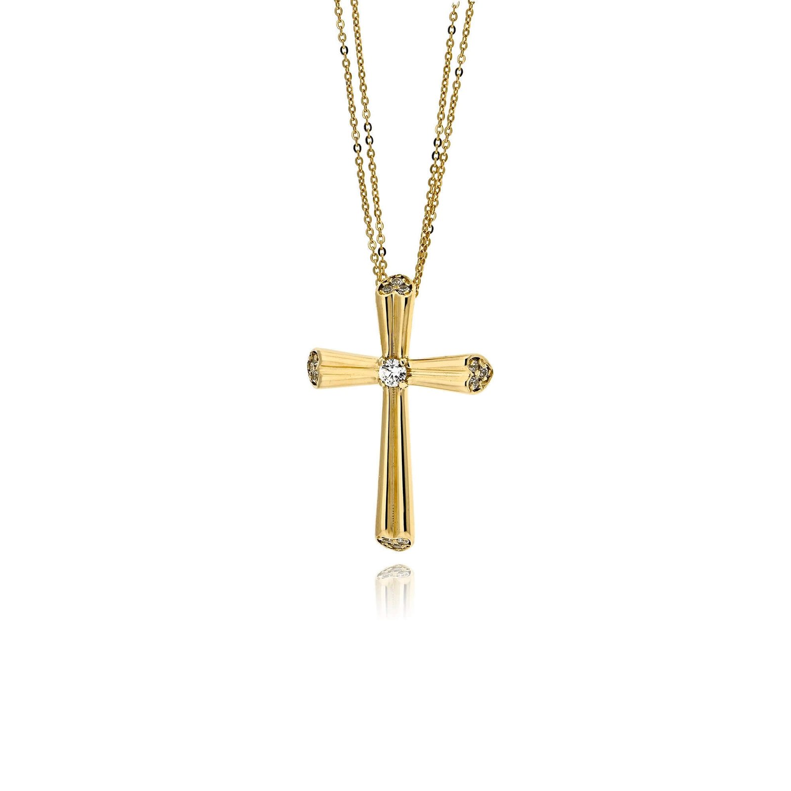 Ένας χαριτωμένος σταυρός βάπτισης για κορίτσι, από τη Val΄Oro. Το ρομαντικό σχέδιο διακοσμείται με λευκά ζιργκόν και συνοδεύεται από διπλή αλυσίδα. Είναι φτιαγμένος από κίτρινο χρυσό 14 καρατίων.