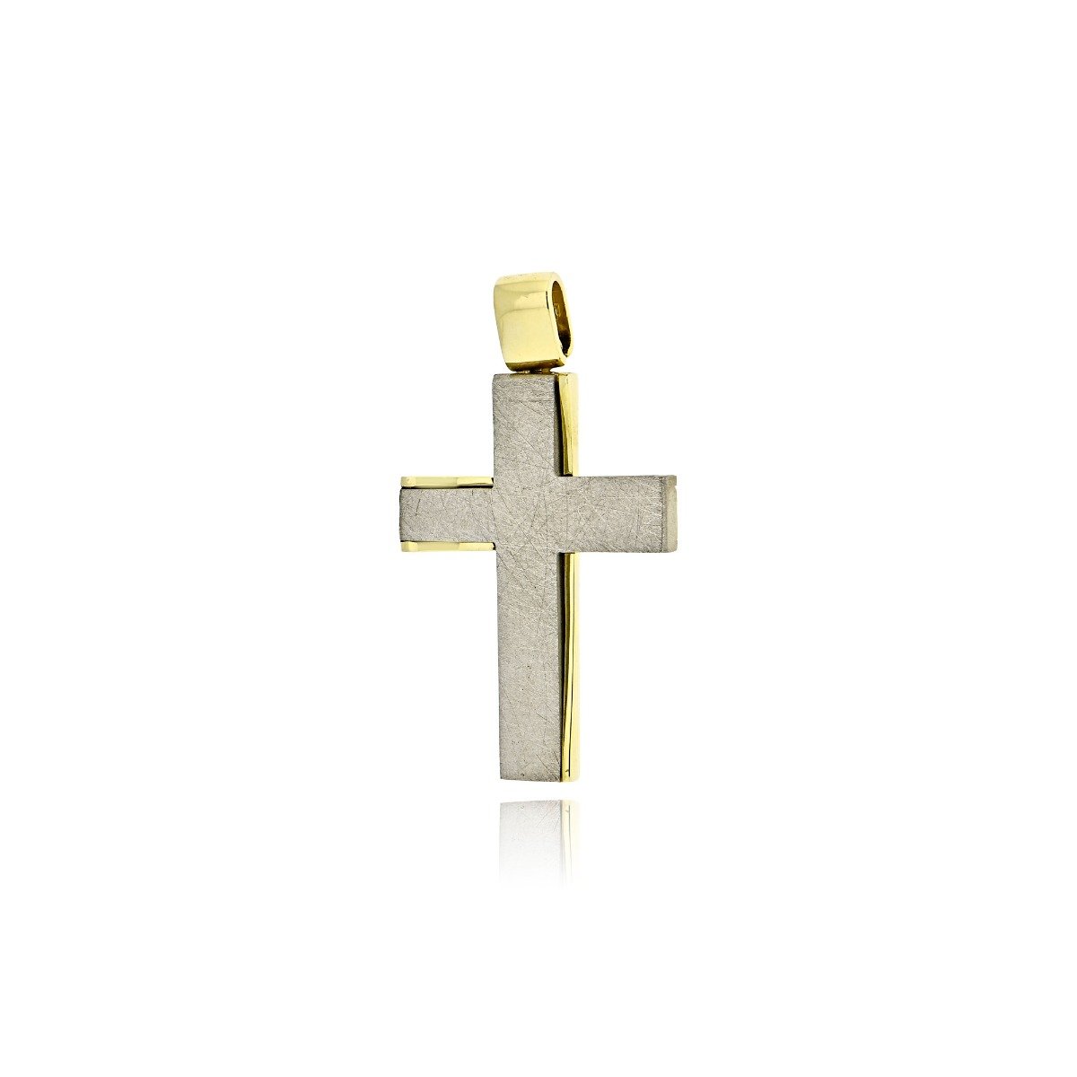 Σταυρός βάπτισης διπλής όψης από κίτρινο και λευκό χρυσό. Η μία πλευρά έχει γυαλιστερό φινίρισμα σε κίτρινο χρυσό, ενώ η άλλη διαθέτει μια ματ επιφάνεια σε λευκόχρυσο, δημιουργώντας μια διακριτική αλλά εντυπωσιακή αντίθεση. Ένα κομψό και διαχρονικό κόσμημα.