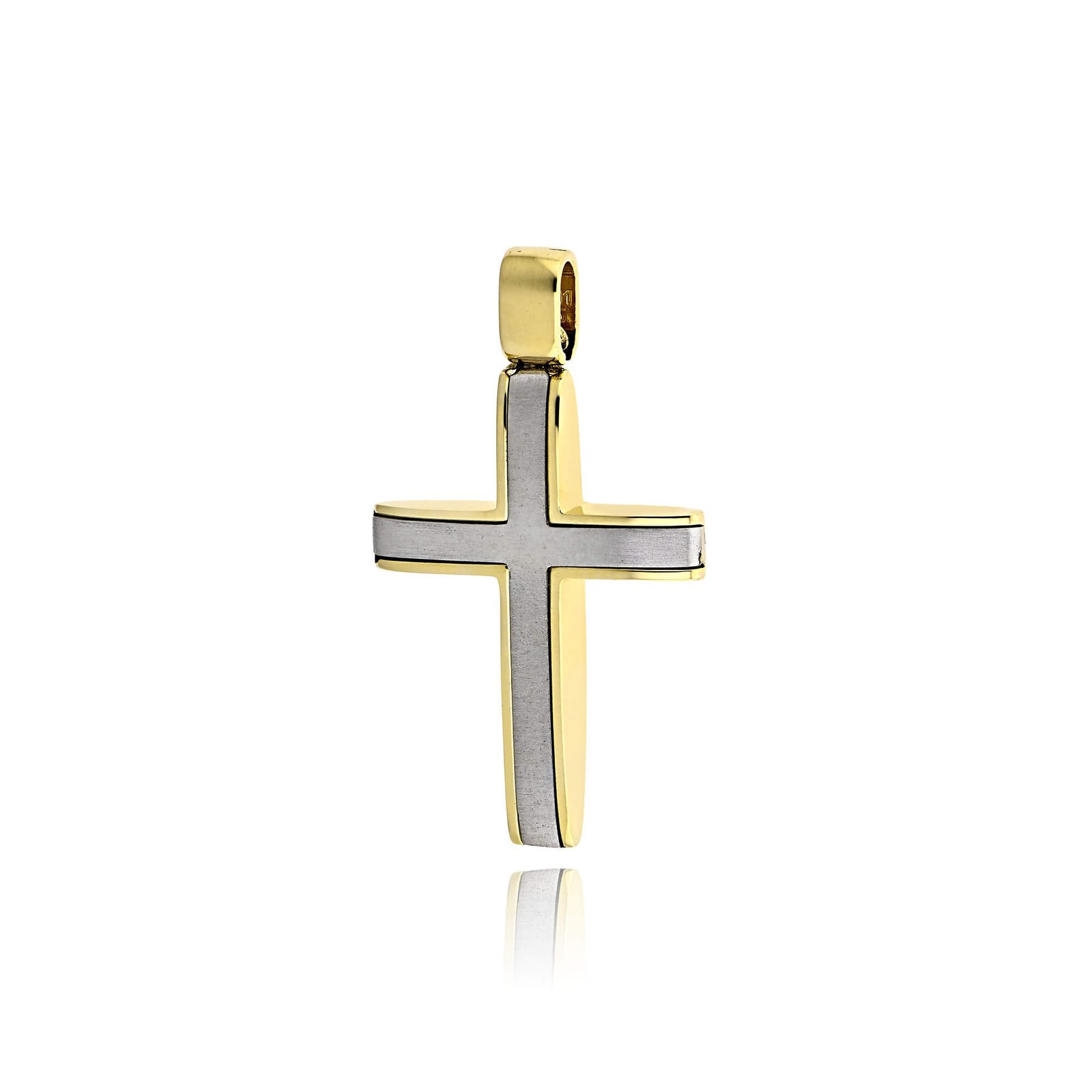 Μοντέρνος ανδρικός σταυρός με ματ επιφάνεια στο εσωτερικό του από λευκό χρυσό.Είναι κατασκευασμένος από λευκό και κίτρινο χρυσό 14 καρατίων.