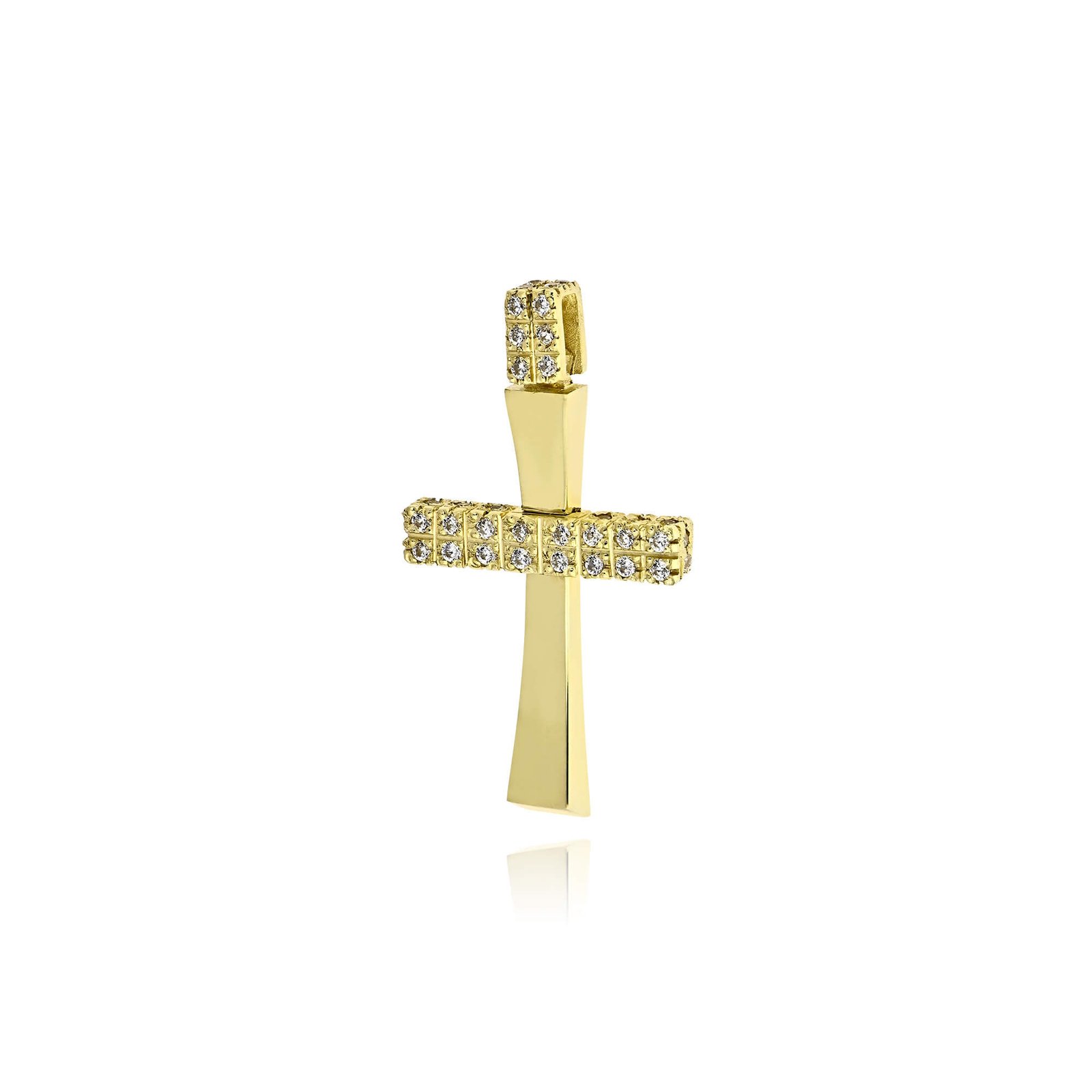 Υπέροχος χρυσός σταυρός της εταιρείας Val΄Oro, διακοσμημένος με λευκά ζιργκόν. Μία εξαιρετική πρόταση για βάπτιση κοριτισού ή για εσάς που επιθυμείτε ένα εντυπωσιακό κόσμημα να στολίσει το λαιμό σας