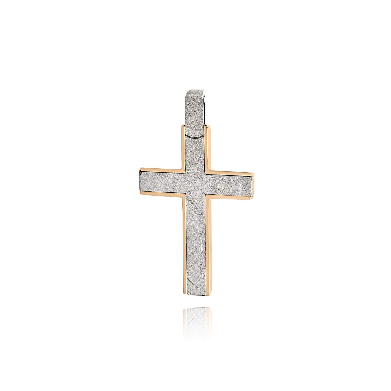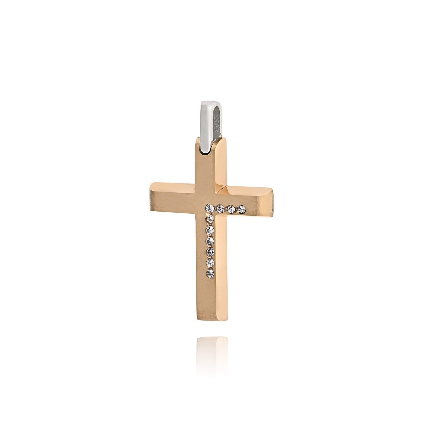 Ένας ξεχωριστός βαπτιστικός σταυρός για κορίτσι, κατασκευασμένος από ροζ και λευκό χρυσό 14 καρατίων. Η διπλή του όψη συνδυάζει μια κομψή ματ επιφάνεια με ένα λαμπερό σχέδιο διακοσμημένο με ζιργκόν, δημιουργώντας μια διακριτική αλλά εντυπωσιακή επιλογή.