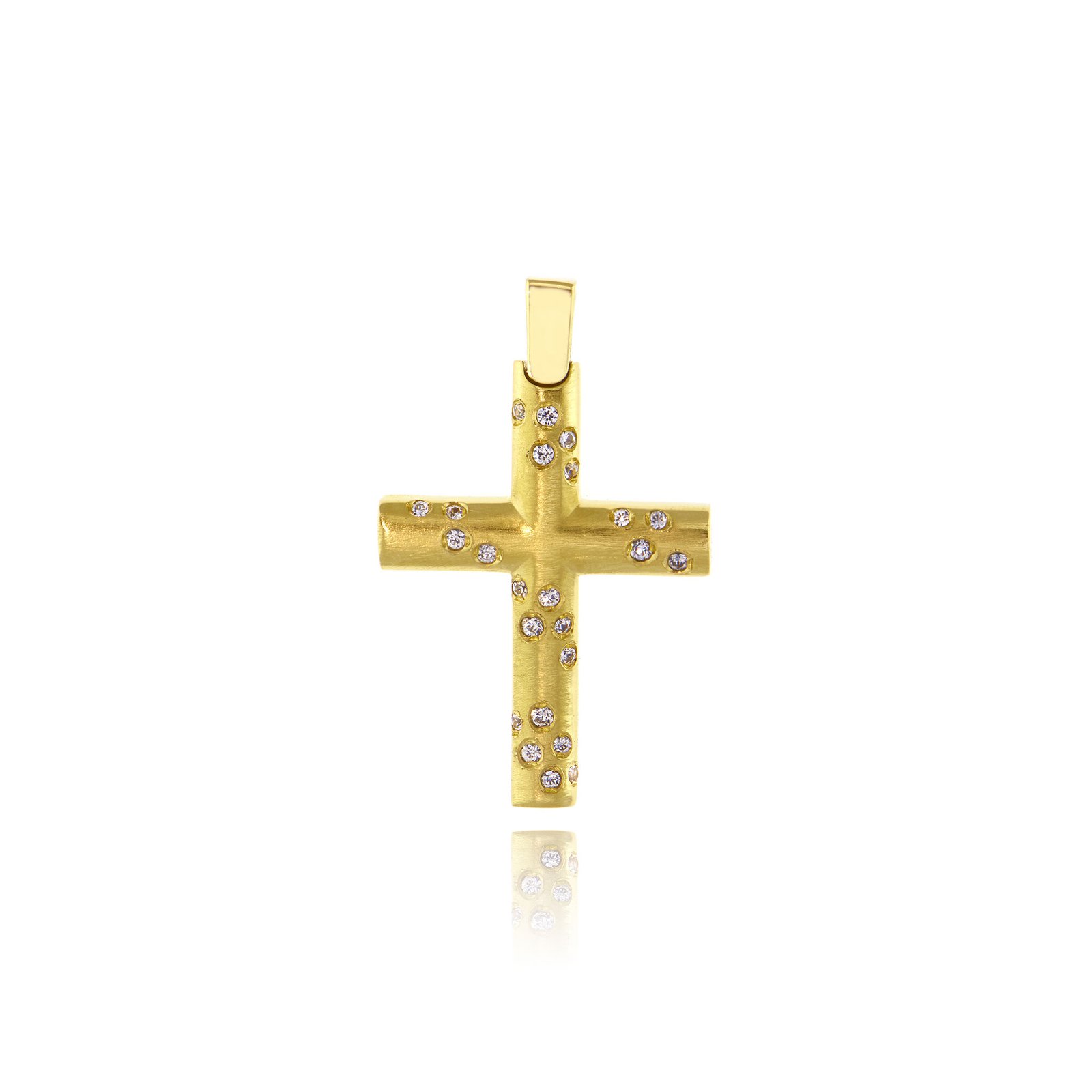 Βαπτιστικός σταυρός Val’Oro για κορίτσι, κατασκευασμένος από κίτρινο χρυσό 14 καρατίων. Στολισμένος με λαμπερά ζιργκόν που διακοσμούν την επιφάνειά του, προσφέρει μια εντυπωσιακή και μοντέρνα επιλογή για αυτή τη σημαντική περίσταση.