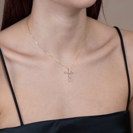 Κομψός και διαχρονικός σταυρός βάπτισης, κατασκευασμένος από κίτρινο χρυσό 14 καρατίων, διακοσμημένος με λαμπερές πέτρες ζιργκόν. Η κλασική γραμμή του και η διακριτική λάμψη τον καθιστούν μια υπέροχη επιλογή για αυτήν την ξεχωριστή περίσταση.