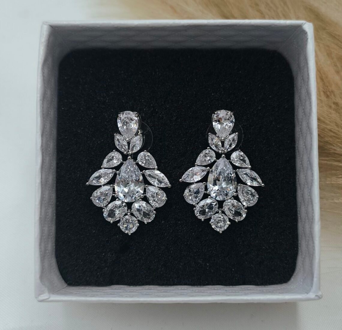 Σκουλαρίκια νυφικά ασημένια από επιπλατινωμένο κράμα , υπό αλλεργικά με λαμπερά κρύσταλλα .