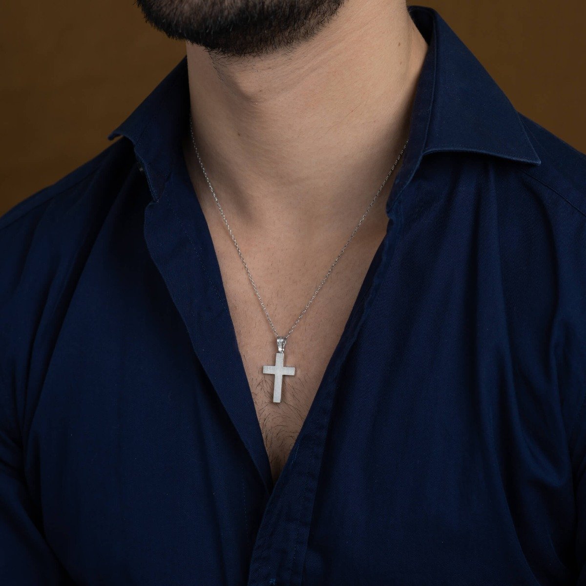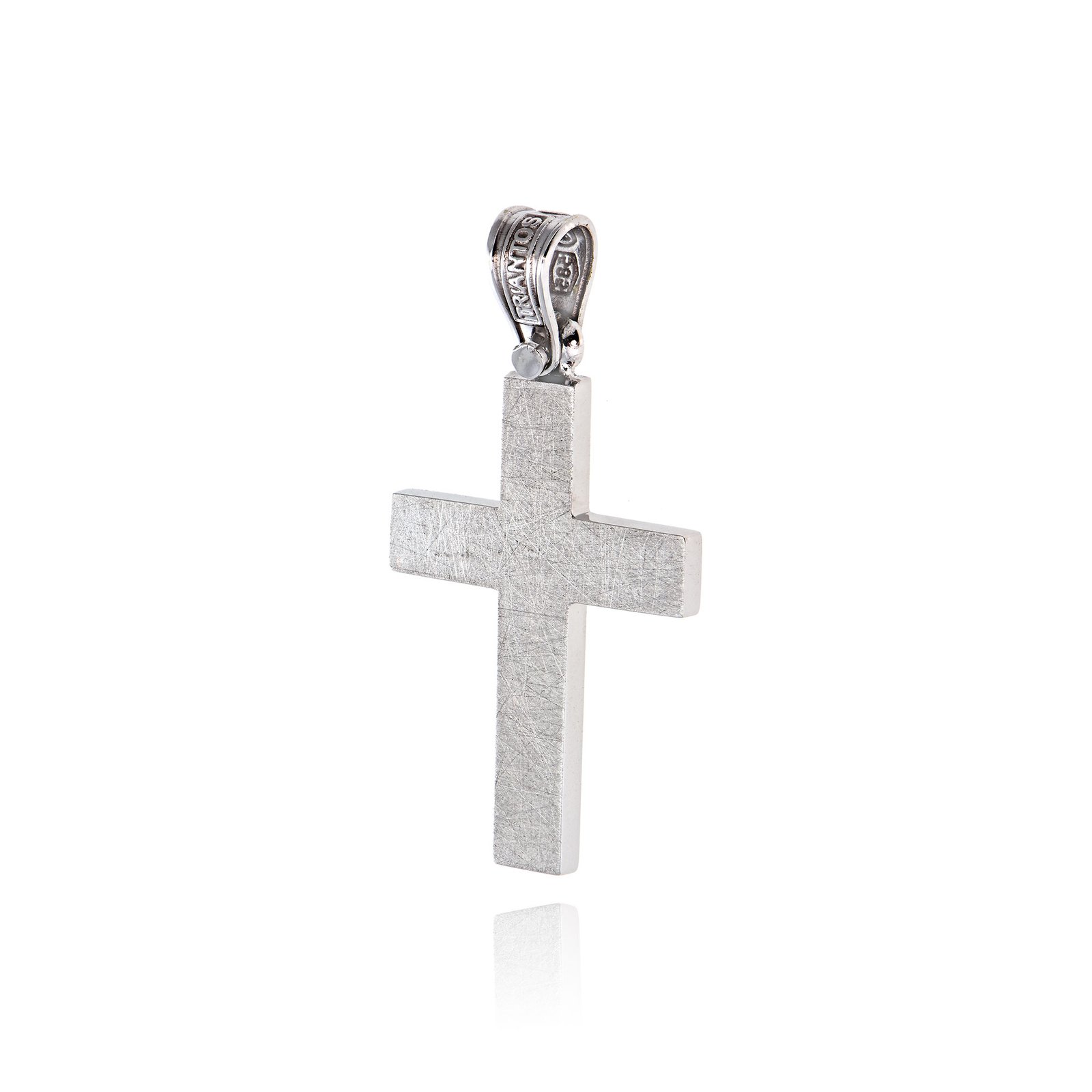 Βαπτιστικός σταυρός για αγόρι, της εταιρείας Τριάντος. Είναι κατασκευασμένος από λευκό χρυσό Κ14 και έχει εντυπωσιακό σαγρέ φινίρισμα. Ιδανικός και για ανδρικός.