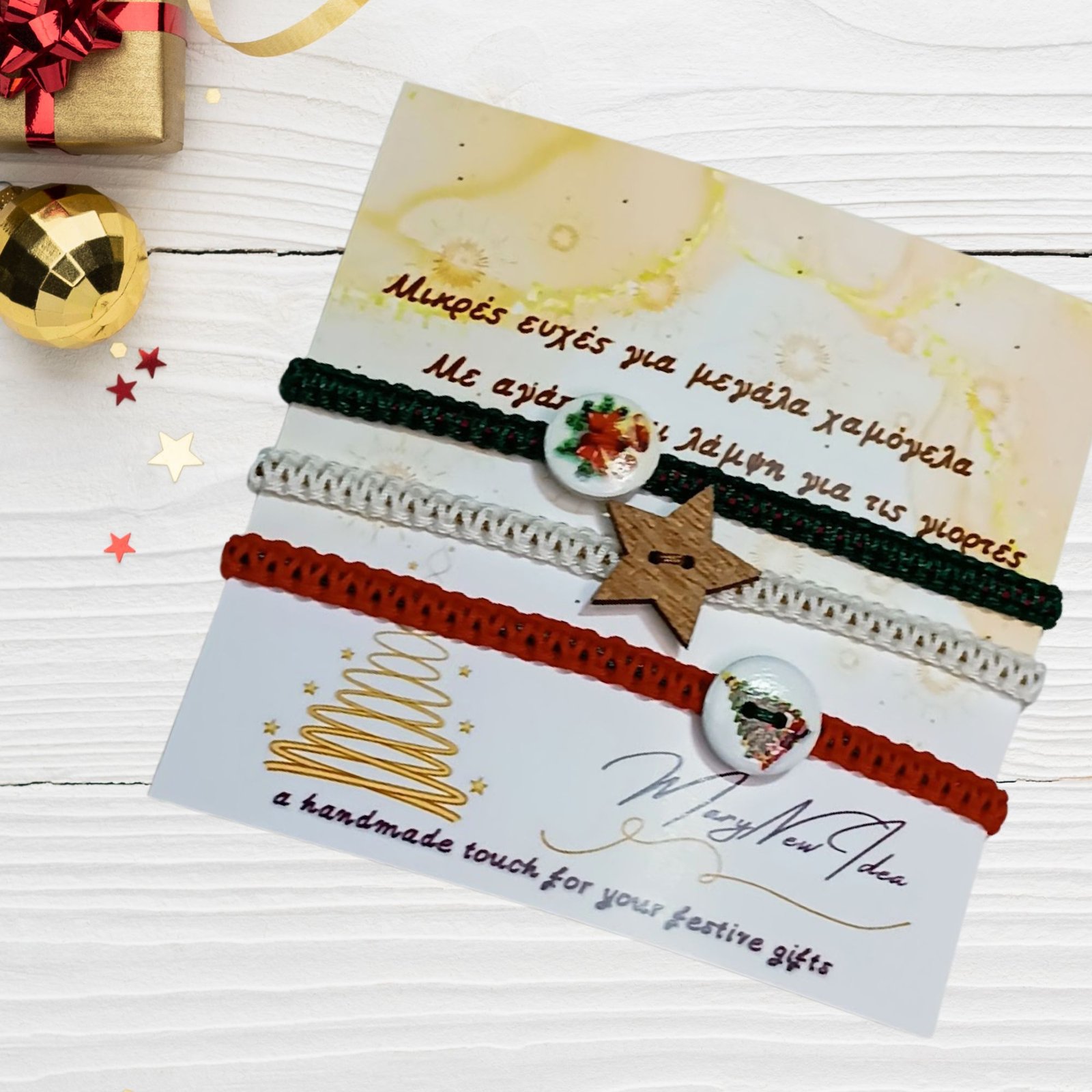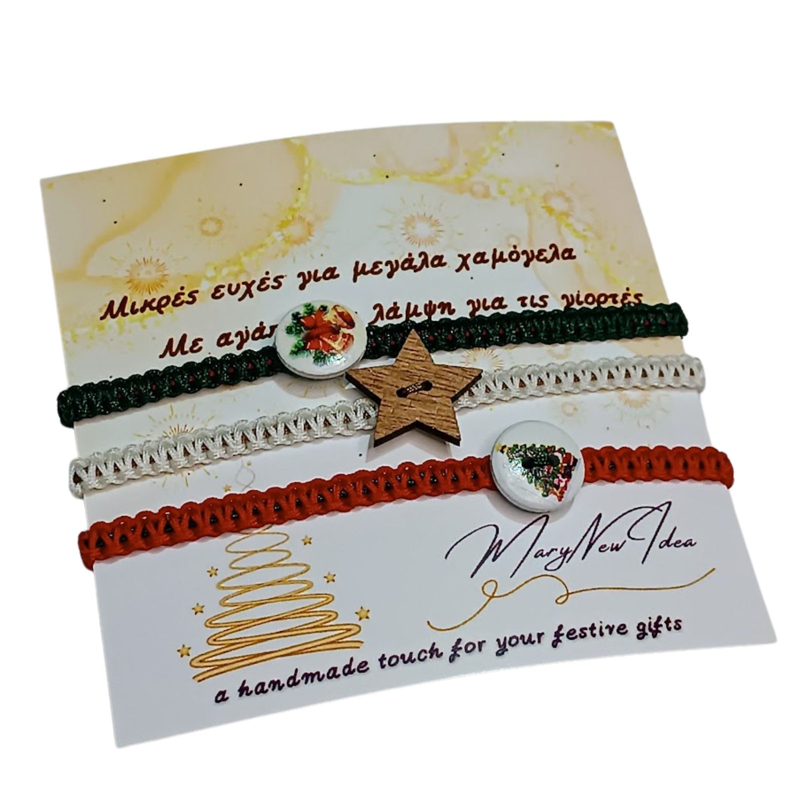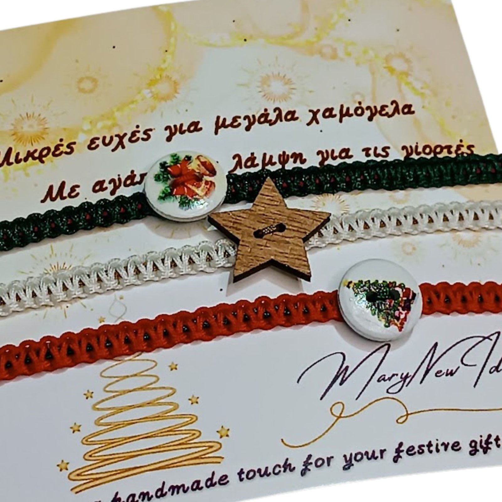 Κάθε βραχιόλι διαθέτει χριστουγεννιάτικο διακοσμητικό κουμπί ή ξύλινο αστέρι και ρυθμιζόμενο κλείσιμο.