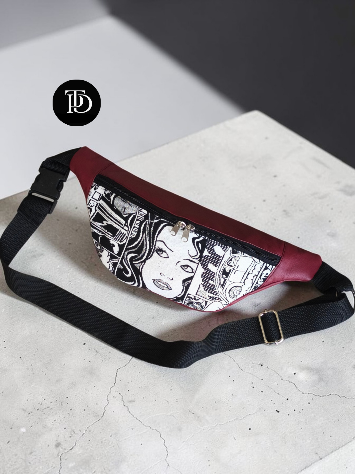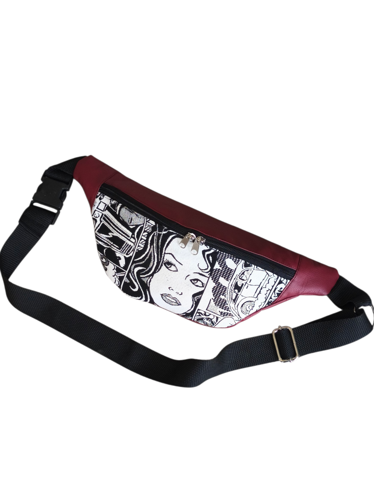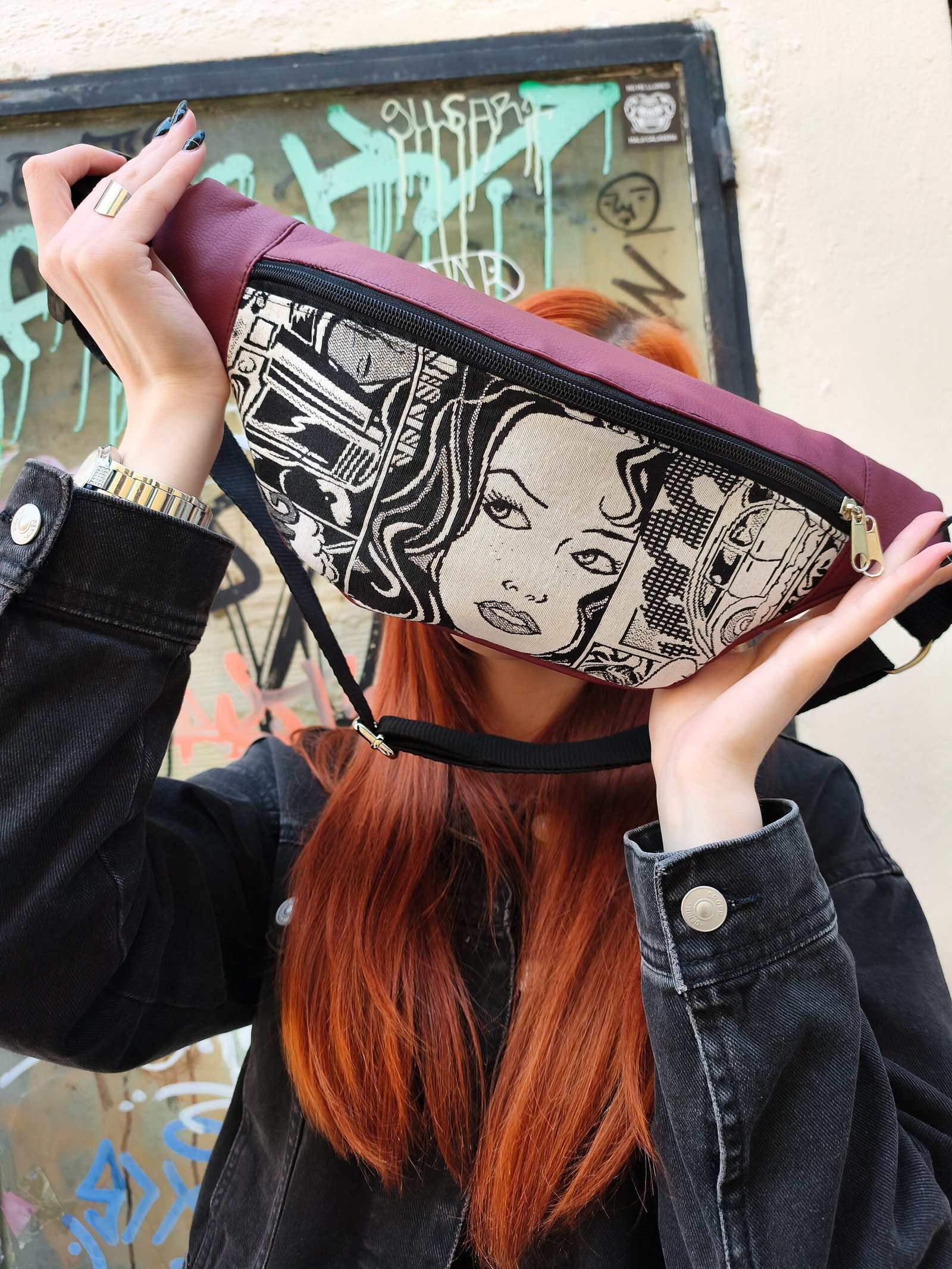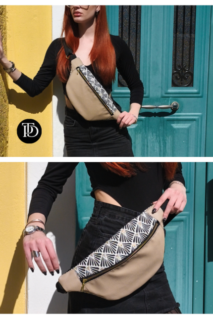Χειροποίητη τσάντα χιαστί / μπανάνα 30εκ. Μήκος, από οικολογικό δέρμα και ύφασμα επίπλωσης. Διπλοραμμένη για έξτρα αντοχή & επενδυμένη με βαμβακερό ύφασμα μαύρο. Διαθέτει αυξομειώμενο ιμάντα για να φορεθεί τόσο στον ώμο όσο και χιαστί .