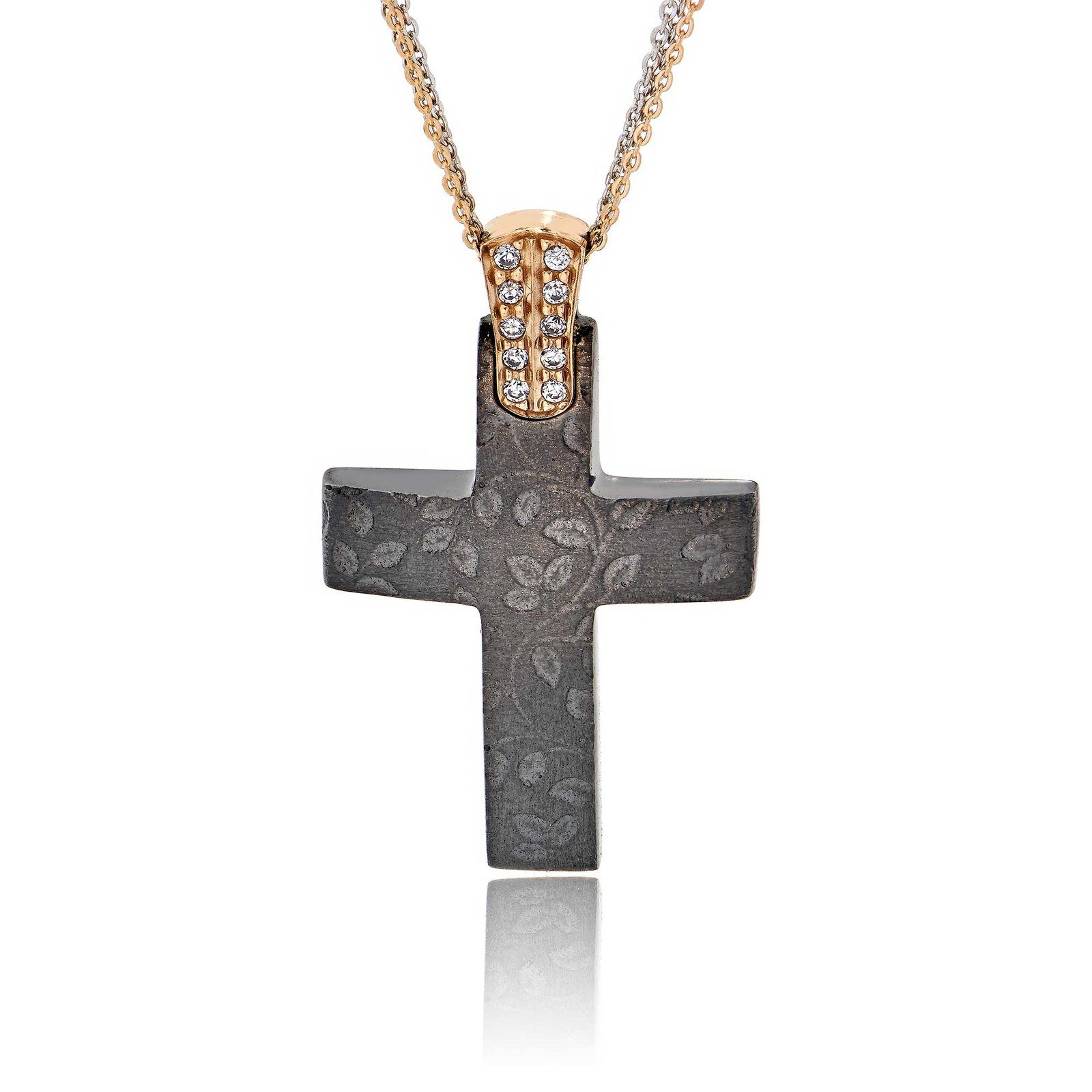 Τόσο ξεχωριστός & ιδιαίτερος που θα κλέψει τις εντυπώσεις! Ένας πραγματικά μοναδικός σταυρός από ροζ χρυσό 14 καρατίων με μαύρο επιπλατίνωμα, στολισμένος με λευκά ζιργκόν. Μία ξεχωριστή πρόταση για βάπτιση κοριτσιού. Η διπλή χρυσή αλυσίδα περιλαμβάνεται.
