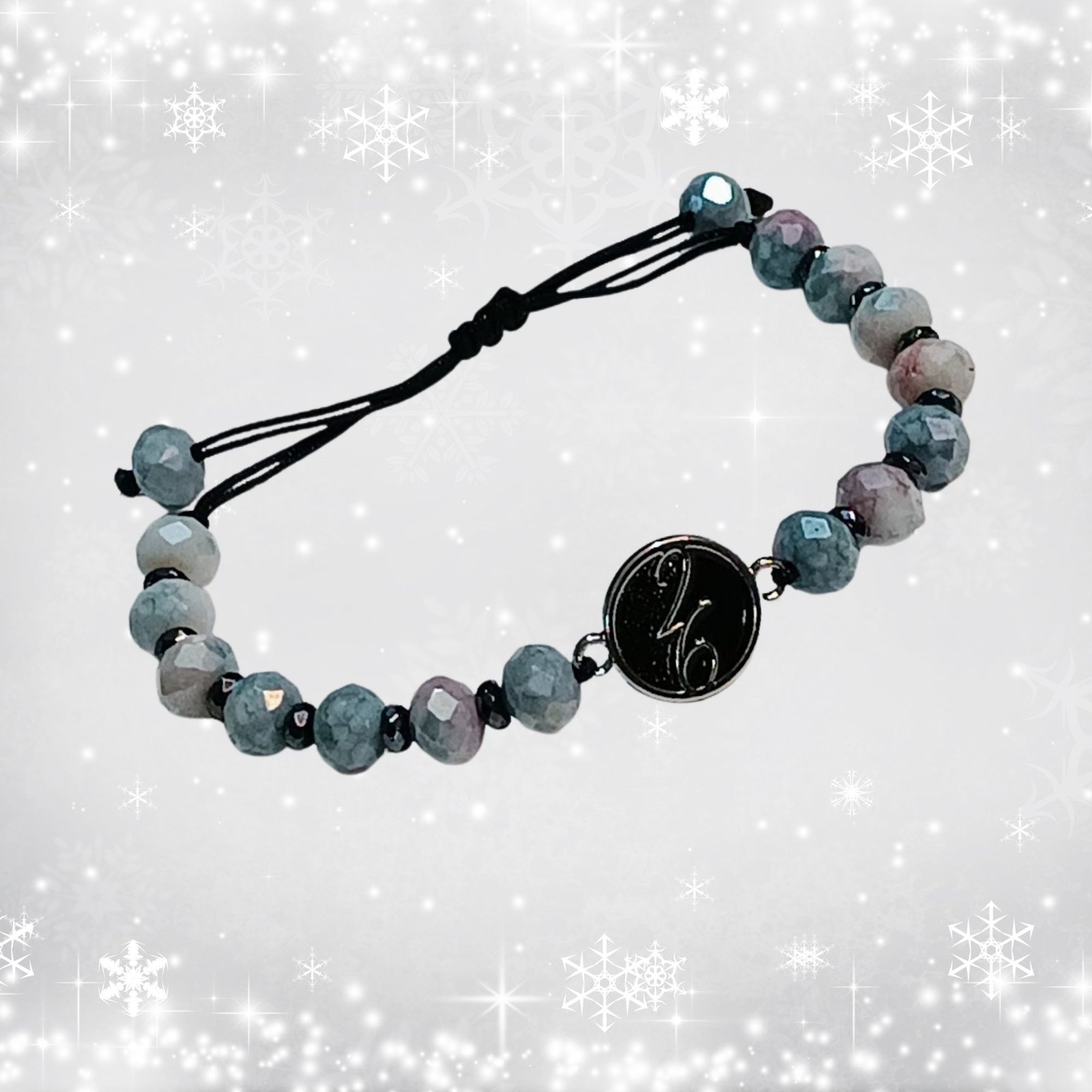 Χειροποίητο βραχιόλι με χάντρες σε icy pastel τόνους και μαύρο–ασημί μεταλλικό μοτίφ. Με λεπτομέρειες αιματίτη. Χάντρες σε λευκό του πάγου, απαλό γαλάζιο και διακριτικό ροζ δημιουργούν μια ονειρική αρμονία.