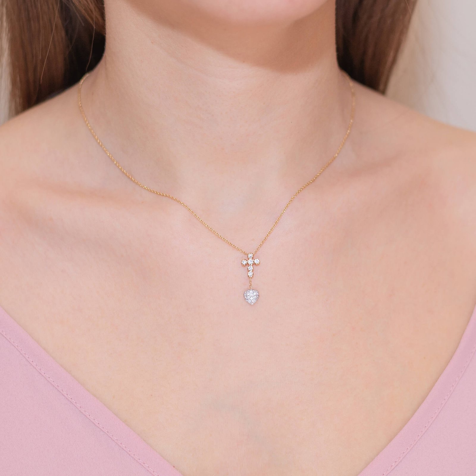 Μικρός σταυρός με καρδιά και αλυσίδα από κίτρινο χρυσό 14 καρατίων και πέτρες ζιργκόν, ένας λαμπερός και κομψός τρόπος να εκφράσετε την πίστη και την αγάπη σας. Η προσθήκη της καρδιάς στον σταυρό προσδίδει μια επιπλέον διάσταση στο σύμβολο και μπορεί να ερμηνευτεί ως έκφραση της αγάπης και της ευλάβειας. Αυτός ο μικρός σταυρός μπορεί να αποτελέσει ένα όμορφο δώρο για κάποιο αγαπημένο σας πρόσωπο, ειδικά σε περιστάσεις όπως η ονομαστική εορτή ή η επέτειος.