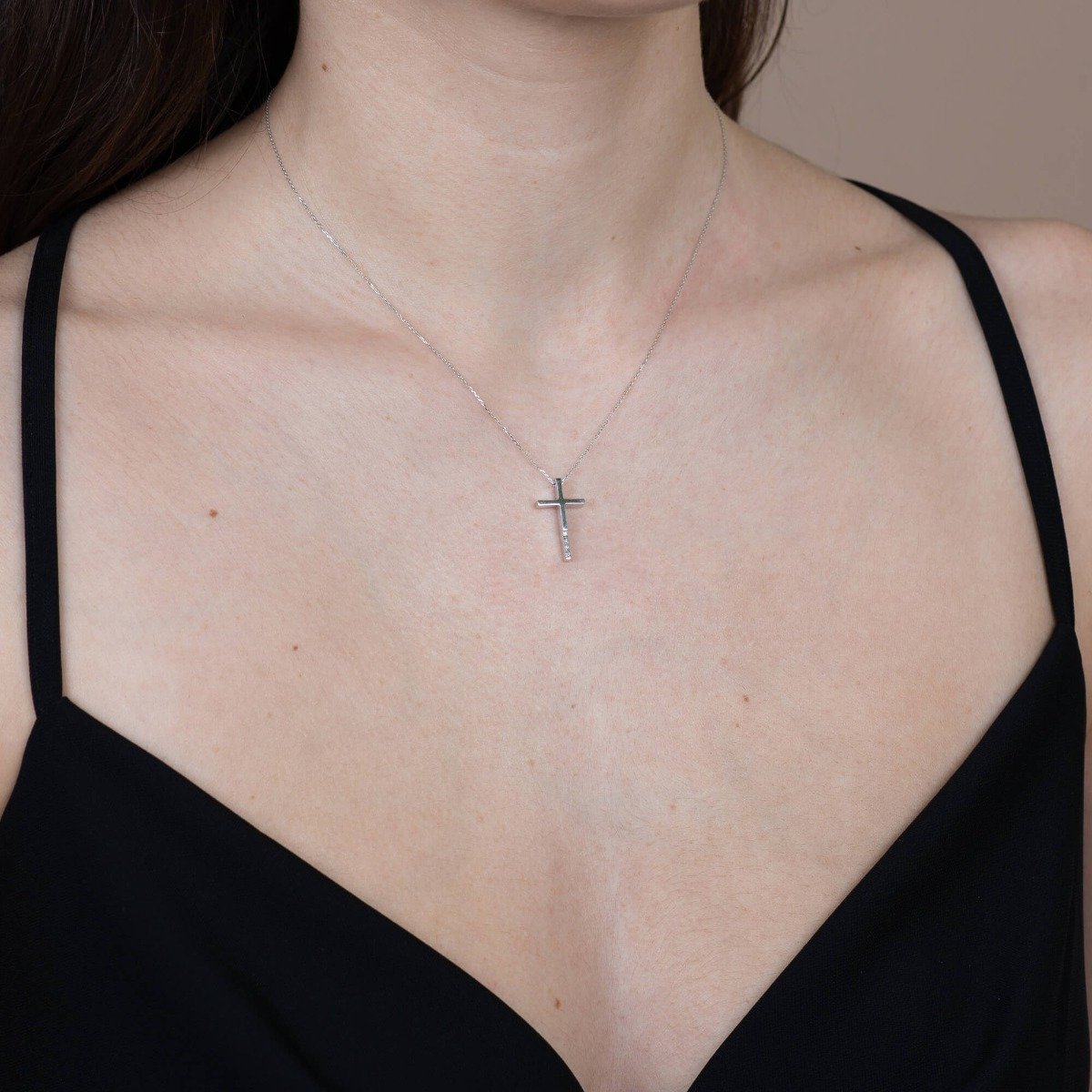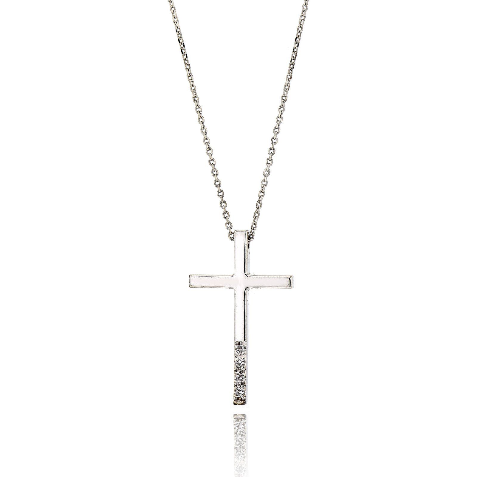Μικρός γυναικείος σταυρός με ενσωματωμένη αλυσίδα. Μπορεί να γίνει ένας υπέρκομψος βαπτιστικός σταυρός για όσους αγαπούν τα πιο διακριτικά σχέδια. Είναι κατασκευασμένος από λευκό χρυσό 14 καρατίων και στολισμένος με ένα λευκό μπριγιάν.